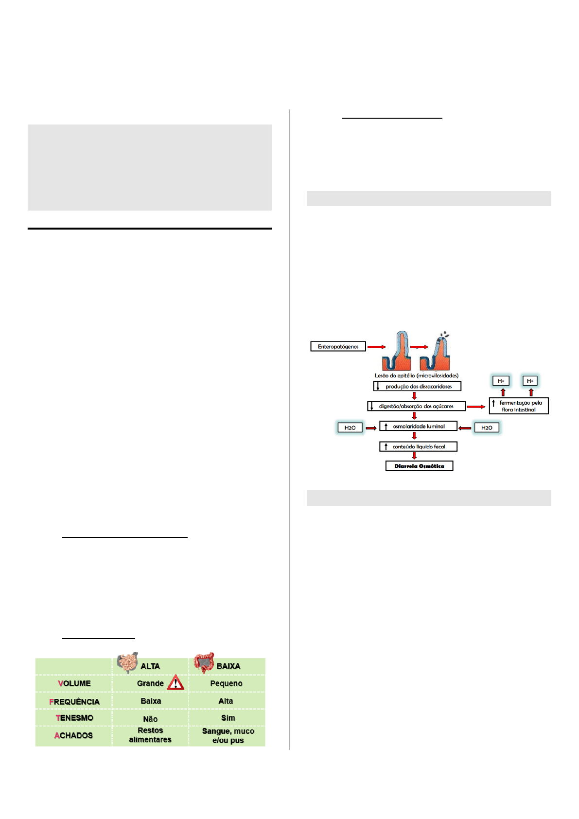 DIARREIAS SOI IV | APG 06 - SISTEMA DIGESTÓRIO OBJETIVOS DE APRENDIZAGEM: 1. Estudar os mecanismos fisiopatológicos envolvidos nos tipos de diarreias; 2. Compreender a etiologia, epidemiologia, fisiopatologia, manifestações clínicas, diagnóstico e tratamento da diarreia aguda e crônica (na criança, adulto e idoso). MECANISMOS FISIOPATOLÓGICOS E TIPOS DE DIARREIAS Entende-se por diarreia o quadro onde há um aumento do volume das fezes, diminuição na consistência ou aumento de aquosidade e/ou aumento da frequência das evacuações sendo considerada quando há mais de três evacuações no período de 24 horas. Normalmente, o intestino delgado e cólon absorvem 99% do líquido ingerido por via oral e das secreções do trato gastrintestinal — na quantidade total de cerca de 9 a 10 L por dia. Assim, mesmo pequenas reduções na absorção ou incrementos na secreção de água pelo intestino podem resultar em água suficiente para causar uma diarreia. O que difere diarreia de disenteria, é que para ser disenteria, a diarreia tem que estar associada a dor, com muco e sangue nas fezes. A classificação das diarreias pode ser feita com base no tempo de duração do sintoma, na origem e na fisiopatologia. ● Quanto ao tempo de duração: > Diarreias agudas: são aquelas com duração menor que 2 semanas, sendo a causa mais comum por infecções. > Diarreias persistentes: duração 2 e 4 semanas. > Diarreias crônicas: acima de 4 semanas. ● Quanto à origem: ● Quanto à fisiopatologia: Quanto ao mecanismo fisiopatológico, são categorizadas em osmótica, secretória, inflamatória, disabsortiva e funcional, sendo as 4 primeiras diarreias orgânicas e a última não orgânica. DIARREIA OSMÓTICA Ocorre por acúmulo de substâncias hidrossolúveis não absorvíveis no lúmen intestinal. Assim, ocorre retenção de líquidos intraluminais e consequentemente diarreia. É a partir desse mesmo mecanismo que funcionam os laxativos. Ex.: deficiência de dissacarídeos, alta ingestão de carboidratos pouco absorvíveis (sorbitol, manitol, lactose - em caso de indivíduos intolerantes), abuso de laxativos (sais de magnésio, fosfato de sódio). DIARREIA SECRETORA Distúrbio no processo hidroeletrolítico pela mucosa intestinal, por meio do aumento de secreção de íons e água para o lúmen ou inibição da absorção, por meio de drogas ou toxinas. Diferentemente da osmótica, não melhora com jejum e é responsável por um grande volume de fezes aquosas. Infecções (p. ex., gastroenterite) são as causas mais comuns da diarreia secretora. Infecções combinadas à intoxicação alimentar são as causas mais comuns de diarreia aguda (< 4 dias de duração). A maioria das enterotoxinas bloqueia as trocas de Na+ H+, que são uma importante força que orienta a absorção de líquidos no intestino delgado e cólon. Fármacos podem estimular a secreção intestinal diretamente (p. ex., quinidina, quinino, colchicina, catárticos da antraquinona, óleo de rícino, https://www.msdmanuals.com/pt-br/profissional/dist%C3%BArbios-gastrointestinais/gastroenterite/vis%C3%A3o-geral-de-gastroenterite 2 prostaglandinas) ou indiretamente pela alteração na absorção de gordura (p. ex., orlistat). Vários tumores endócrinos produzem secretagogos, incluindo vipomas (peptídeo intestinal vasoativo), gastrinomas (gastrina), mastocitose (histamina), etc. Alguns destes mediadores (p. ex., prostaglandinas, serotonina) também aceleram o trânsito intestinal, o trânsito colônico ou ambos. A absorção prejudicada de sais biliares, que pode ocorrer com vários distúrbios, pode causar diarreia por estimulação da secreção de água e eletrólitos. As fezes têm uma coloração verde ou laranja. DIARREIA INFLAMATÓRIA Como o próprio nome indica, é causada por uma alteração inflamatória, levando a produção de muco, pus e/ ou sangue nas fezes. Pode ter alteração laboratorial da calprotectina ou lactoferrina fecal. Entre as causas, destacam-se a doença de Crohn e a retocolite ulcerativa. Geralmente as evacuações são de menor volume e vem acompanhada de febre, dor abdominal intensa e tenesmo. Ex. Infecção por Shigella. DIARREIA DISABSORTIVA Também conhecida como esteatorreia. A causa está associada a baixa absorção dos lipídios no intestino delgado. Pode induzir diarreia com fezes gordurosas, de odor fétido e difíceis de escoar, frequentemente associada a perda ponderal e déficit nutricional decorrente da má absorção de aminoácidos e vitaminas. Por exemplo, doença celíaca, doença de Crohn, doença de Whipple, giardíase, estrongiloidíase e linfoma intestinal. DIARREIA FUNCIONAL Nesse tipo de diarreia, a absorção e secreção estão normais, porém não há tempo suficiente para ocorrer a absorção desses nutrientes corretamente. Ocorre por hipermotilidade intestinal. Não existe lesão estrutural ou orgânica. Exemplos: síndrome do intestino irritável e diarreia diabética (neuropatia autonômica). DIARREIA AGUDA VS DIARREIA CRÔNICA DIARREIA AGUDA As diarreias agudas ou doenças diarreicas agudas (DDA) começam subitamente e persistem por menos de 2 semanas. > Epidemiologia: Mais de 1 bilhão de pessoas no mundo sofrem um ou mais episódios de diarreia aguda a cada ano. Das 100 milhões de pessoas acometidas anualmente por diarreia aguda nos EUA, quase metade tem de restringir as atividades, 10% consultam um médico, cerca de 250 mil precisam de hospitalização e aproximadamente 5 mil morrem. A diarreia infecciosa aguda continua sendo uma das causas mais comuns de mortalidade nos países em desenvolvimento, principalmente entre crianças pobres. A diarreia aguda recorrente em crianças de países tropicais resulta em enteropatia ambiental com impactos de longo prazo nos desenvolvimentos físico e intelectual. A doença diarreica ocorre com frequência inicial em países com recursos limitados, sobrepostos a casos epidêmicos de diarreia, disenteria ou diarreia aquos