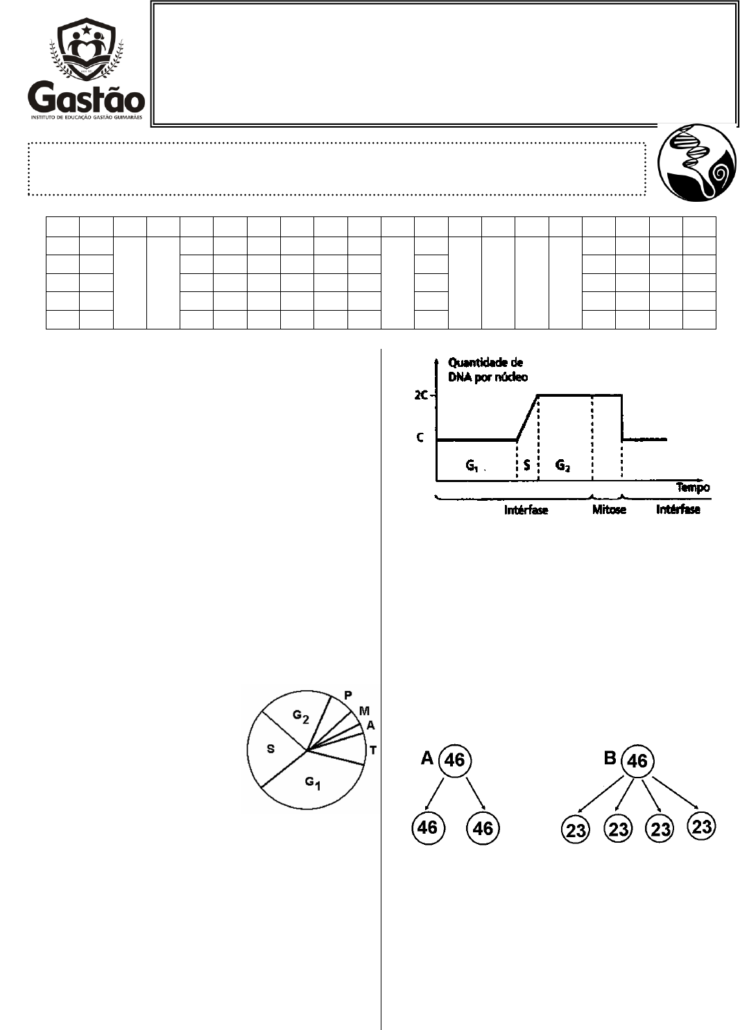 QUESTÃO 01 – Em relação aos processos de divisão celular, é correto afirmar que: a) na meiose ocorre a separação de cromátides irmãs e a formação de duas células, enquanto na mitose há separação de cromossomos homólogos e a formação de quatro células. b) a formação de gametas, assim como o crescimento dos indivíduos, são processos dependentes da meiose. c) o processo de cicatrização de uma ferida depende de mitose, enquanto o crescimento de ossos depende de meiose. d) a meiose, nas mulheres, é muito mais rápida do que a mitose e produz quatro ovócitos (“óvulos”) por célula em divisão. e) a meiose produz células geneticamente diferentes entre si e com a metade dos cromossomos da célula de origem, fatos que não ocorrem na mitose. QUESTÃO 02 – Observe o esquema representativo de um ciclo celular e assinale a alternativa INCORRETA: a) A duplicação do material genético ocorre no período S. b) A separação das cromátides irmãs ocorre em A. c) A mitose compreende as fases P, M, A e T. d) A quantidade de DNA está reduzida à metade em G2. e) A interfase compreende nos períodos G1, S e G2. QUESTÃO 03 – 15) O gráfico abaixo mostra as fases da interfase (G1, S, G2) e a variação da quantidade de DNA por núcleo durante as fases do ciclo celular: Analisando o gráfico, um estudante afirmou: I. No final da interfase, a quantidade de DNA na célula é maior do que no seu início. II. No período G2 ocorre duplicação do DNA. Você concorda com essas afirmações? Justifique a sua resposta. QUESTÃO 04 – Observe os esquemas abaixo e responda: A) Que tipos de divisão celular estão representados nesse esquema? B) Qual a diferença entre esses tipos de divisão celular, considerando o número de células-filhas formadas e o número de cromossomos nelas existentes? C) Qual a importância da divisão celular representada em A? 01 02 03 04 05 06 07 08 09 10 11 12 13 14 15 16 17 18 19 20 A A Q ue st ão D is cu rs iv a Q ue st ão D is cu rs iv a A A A A A A Q ue st ão D is cu rs iv a A Q ue st ão D is cu rs iv a Q ue st ão D is cu rs iv a Q ue st ão D is cu rs iv a Q ue st ão D is cu rs iv a A A A A B B B B B B B B B B B B B C C C C C C C C C C C C C D D D D D D D D D D D D D E E E E E E E E E E E E E INSTITUTO DE EDUCAÇÃO GASTÃO GUIMARÃES SÉRIE: 3o ano TURMA: ______ TURNO: ____________ DISCIPLINA: Biologia PROFa : Adriana Matos ALUNO (A): __________________________________ DATA: ____/_____/ 2023 ATIVIDADE 04 – Divisão Celular, Gametogênese e Gêmeos (revisão) QUESTÃO 05 – Observe os esquemas: Relacione as fases da mitose: anáfase, telófase, metáfase e prófase, com os respectivos números das figuras acima: a) 3 – 4 – 2 – 1 b) 4 – 3 – 2 – 1 c) 2 – 3 – 4 – 1 d) 1 – 2 – 3 – 4 e) 3 – 1 – 2 – 4 QUESTÃO 06 – (FATEC/2014) O manuseio de equipamentos de radiologia envolve riscos à saúde, e o Tecnólogo em Radiologia segue uma série de normas de biossegurança para evitar a exposição desnecessária à radiação ionizante. Esse tipo de radiação pode danificar suas células, levando-as a se reproduzir de modo desordenado e descontrolado, gerando inúmeras novas células por meio do mesmo processo de divisão celular que ocorre nas células somáticas. Desse modo, basta que uma única célula do corpo se danifique e torne-se uma célula cancerígena para que surja um tumor. Isso ocorre porque a célula cancerígena inicial divide- se por a) mitose, gerando células com o mesmo número de cromossomos e a mesma capacidade de duplicação. b) mitose, gerando células com metade do número de cromossomos, porém ainda com capacidade de duplicação. c) mitose, gerando células com o dobro do número de cromossomos e uma capacidade ainda maior de duplicação. d) meiose, gerando células com o mesmo número de cromossomos e a mesma capacidade de duplicação. e) meiose, gerando células com metade do número de cromossomos, porém ainda com capacidade de duplicação. QUESTÃO 07 – Durante o processo de divisão celular ocorre o fenômeno conhecido como crossing over, no qual cromossomos homólogos trocam genes entre si. Isto é muito importante para que ocorra a variabilidade genética das células. Esse processo só ocorre na: a) segunda divisão da meiose, durante a citocinese. b) primeira divisão da meiose, durante a etapa de metáfase I. c) anáfase da mitose. d) segunda divisão da meiose, durante a etapa de metáfase II. e) primeira divisão da meiose, durante a etapa de prófase I. QUESTÃO 08 – (IFSP/2013) Após uma aula sobre divisão celular, em células eucariontes, o professor projeta a imagem de uma célula que representa uma das etapas estudadas, e pergunta a seus alunos qual fase e divisão celular estão sendo representadas. Observe a imagem da representação projetada e assinale, das alternativas abaixo, qual a resposta correta para a questão proposta pelo professor a) Metáfase da Mitose. b) Anáfase da Mitose. c) Anáfase I da Meiose. d) Metáfase II da Meiose. e) Anáfase II da Meiose. QUESTÃO 09 – Considere um animal que possui oito cromossomos em suas células diploides. Nos esquemas A e B, estão representadas duas células desse animal em processo de divisão celular. Com base nos esquemas, são identificados os seguintes tipos de divisão celular em A e B, respectivamente: a) meiose e mitose b) mitose e meiose c) interfase e intercinese d) mitose e mitose e) meiose e meiose QUESTÃO 10 – (UFMA) Com relação à gametogênese humana, é correto afirmar que: a) cada ovócito I produz 4 ovócitos II. b) a ovogênese só é concluída se o ovócito II for fecundado. c) ovogônias e ovócitos primários são formados durante toda a vida da mulher. d) espermatogônias são formadas apenas durante a vida intrauterina. e) cada espermatócito I produz um espermatozoide. QUESTÃO 11 – Com relação ao esquema abaixo, responda as seguintes perguntas: A) Qual o fenômeno rep