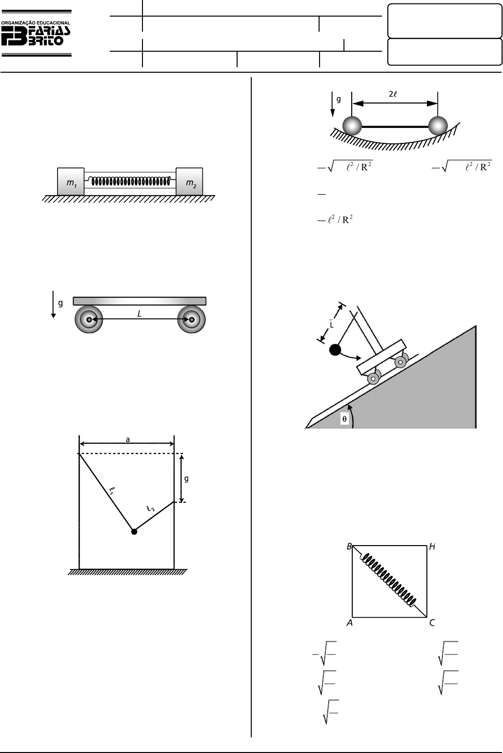 OSG.: 103103/16 TC FÍSICA ENSINO PRÉ-UNIVERSITÁRIO TURNO DATA ALUNO(A) TURMA Nº SÉRIE PROFESSOR(A) CARLOS EDUARDO ITA/IME SEDE ___/___/___ TC – I 1. Dois blocos de massas m1 e m2 são ligados por uma mola de rigidez k. A mola está comprimida com a ajuda de dois fios, como mostra a figura. Os fios são queimados. Determinar o período de oscilações dos blocos. 2. Uma barra de massa (m) repousa sobre dois cilindros que giram em velocidades contrárias. A distância entre os centros dos cilindros é (l) e o coeficiente de atrito entre este e a barra é μ. Achar a frequência das oscilações. 3. O sistema representado na figura oscila entrando e saindo no plano do papel. As cordas não possuem massa, são perpendiculares entre si e seus comprimentos são 1 e 2, respectivamente. Determine o período de oscilação do sistema em função de g, 1, 2 e a. 4. No gráfico (momento linear) × (posição) de um MHS, podemos afirmar que sua área é igual a: a) Energia total por frequência. b) Energia total por frequência angular. c) Energia total por amplitude. d) Frequência vezes velocidade. e) Nenhum dos itens anteriores. 5. Sobre uma superfície esférica de raio R, estão duas partículas de mesma massa ligadas por uma haste rígida (sem massa) de comprimento 2. Calcular a frequência angular das pequenas oscilações. Considere a gravidade igual a g. a) 2 2 2 g 1 / R R d) 2 2 2 g 1 4 / R R b) 2 g R e) N.D.A. c) 2 2 2 g / R R 6. Um pêndulo simples, de comprimento L, está preso em um carrinho que desce sem atrito por um plano inclinado de θ (figura abaixo). Calcule o período de oscilação do pêndulo no carrinho. 7. Uma dobradiça em forma de quadrado encontra-se em uma mesa horizontal e lisa. O ponto A é fixado na parede enquanto os vértices B e C são ligados por uma mola de rigidez k. Encontrar o período de pequenas oscilações do sistema quando se coloca uma massa m no vértice H. Considere a massa da mola e das hastes desprezíveis. Não existe fricção entre as hastes. a) m T 5 k d) 3m T k b) m T 5k e) 5m T k c) m T 2 k TC – FÍSICA 2 OSG.: 103103/16 8. Duas bolas, de massa iguais (m = 3 kg) e presas por uma mola de constante elástica igual a 150 N/m, deslizam com velocidade (v = 2 m/s) sobre uma superfície horizontal sem atrito e uma delas se choca com a parede vertical em uma colisão elástica. Depois de quanto tempo esta mesma esfera volta a encontrar com a parede? Considere que antes da colisão a mola estava relaxada. a) S 5 d) 5 S b) S 10 e) 2 S c) 2 S 5 9. Um aluno de turma ITA bolou um sistema de molas bem diferente do convencional. A sequência representada na figura abaixo é repetida infinitamente. Se o aluno colocar um bloco de massa m, qual será o período das oscilações. A constante elástica de cada mola vale k. a) m 2 k d) 3m 2 k b) m k e) m 2 3k c) m 2 5k 10. (OBF) Um pêndulo é formado por uma haste rígida (de massa desprezível e comprimento L) e uma massa m presa em sua extremidade inferior. Ele pode oscilar livremente em torno do seu ponto de suspensão e a gravidade local é g. Prende-se uma mola de constante elástica k a uma distância h abaixo do ponto de suspensão. Suponha que a mola mantenha-se sempre horizontal (isto é, podemos imaginar que a mola seja muito longa) e que ela se encontre relaxada quando o pêndulo estiver vertical. a) Calcule o período de pequenas oscilações do pêndulo, em torno de sua posição de equilíbrio. Assuma que o movimento esteja restrito ao plano da mola-haste. b) E se a haste também tivesse uma massa m’ homogeneamente distribuída, como isso entraria na expressão para o período? TC – II 1. A figura abaixo mostra dois elétrons (cargas − e) sobre o eixo – × e dois íons idênticos (cargas − q) e idênticos ângulos θ. O elétron central está livre para mover-se. As outras partículas estão fixas e mantém o elétron livre fixo. Determine uma expressão de q versus θ. 2. (IME) Uma chapa triangular, cujo material constituinte tem 3 vezes a densidade específica da água, está parcialmente imersa na água, podendo girar sem atrito em torno do ponto P, situado na superfície da água. Na parte superior da chapa, há uma carga positiva que interage com uma carga negativa presa no teto. Sabe-se que, se colocadas a uma distância L, essas cargas de massas desprezíveis provocam uma força de atração igual ao peso da chapa. Para manter o equilíbrio mostrado na figura, a razão d/L, onde d é a distância entre as cargas, deve ser igual a: a) 10 6 b) 3 10 5 c) 14 6 d) 10 4 e) 30 6 TC – FÍSICA 3 OSG.: 103103/16 3. Em dois pontos definidos pelos vetores 1 2r e r se encontram cargas positivas q1 = 4 μC e q2 = 9 μC, respectivamente. Determine o vetor posição 3r de uma carga q3 para que a força resultante em cada carga seja igual a zero. a) 1 2 2r 3r 5 b) 1 2 3r 2r 5 c) 1 2 5r 3r 2 d) 1 2 3r 2r 5 e) 1 2 5r 3r 8 4. Na figura abaixo temos uma carga Q no centro de um cilindro de altura H = 2R e cuja base é uma circunferência de raio 2 2R. Determine o fluxo elétrico através da área lateral do cilindro. a) 0 Q b) 0 Q 2 c) 0 Q 3 d) 0 Q 4 e) 0 Q 5 5. Imagine um cubo com carga elétrica distribuída uniformemente com uma densidade volume. A intensidade do campo elétrico no ponto A é E. Determinar o valor do campo elétrico quando cortado e removido um pequeno cubo de lado igual a metade do cubo de origem. 6. Duas pequenas esferas carregadas, que possuem mesma massa, estão localizadas na mesma vertical com alturas h1 e h2 e são lançadas horizontalmente com mesma velocidade v. A primeira bola toca o chão a uma distância l da vertical inicial. Determine a altura H2 que a segunda bola estará no instante em que a primeira toca o solo. Despreze qualquer efeito de resistência do ar. A gravidade local vale g. 7. Duas partículas carregadas (M + Q) e (m, – q) são colocadas num campo elétrico uniforme E. Após as partículas serem liberadas, ficam a uma distância constante uma d