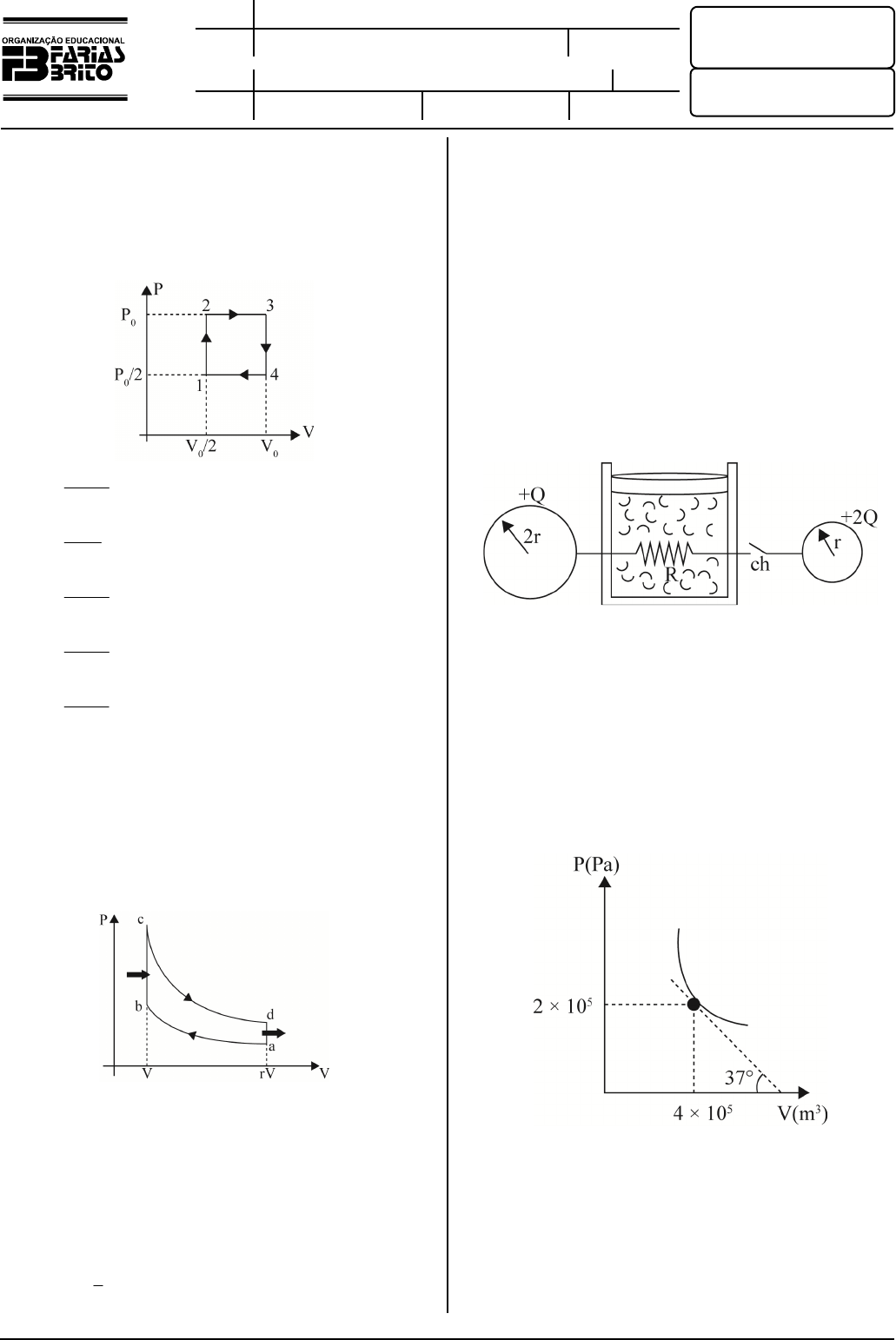 OSG.: 108930/16 LISTA FÍSICA – Nº 9 ENSINO PRÉ-UNIVERSITÁRIO TURNO DATA ALUNO(A) TURMA Nº SÉRIE PROFESSOR(A) FELIPE COSTA ITA/IME SEDE ___/___/___ GASES E TERMODINÃMICA (TERMOLOGIA) 1. Um ciclo termodinâmico é construído com um gás ideal diatômico, com número de Poisson γ, segundo o diagrama de pressão por volume dado na figura. Podemos afirmar corretamente que a eficiência térmica do ciclo vale; a) 1 2 1 γ − γ + b) 3 1 γ − γ + c) 3 2 1 γ − γ + d) 3 2 1 γ + γ + e) 2 1 1 γ − γ + 2. Uma aproximação para ciclos utilizados nos motores a gasolina é o ciclo Otto, mostrado na figura a seguir. Nesse ciclo, as transformações a-b e c-d são adiabáticas e a relação entre o volume máximo e o volume mínimo ocupado pelo gás é representada por r, denominada de taxa de compressão. Qual é o rendimento nesse ciclo, considerando que γ é o coeficiente de Poisson do gás? a) 1 – r1 – γ b) 1 – r1 + γ c) r1 + γ d) 1 – r– γ e) 1 1 r γ − 3. A figura mostra duas esferas condutoras de raios 2r e r inicialmente eletrizadas com cargas +Q e +2Q respectivamente. Elas estão conectadas através de um fio condutor que contém uma resistência R e uma chave ch inicialmente aberta. O recipiente cilíndrico contém n mols de um gás ideal monoatômico a uma pressão P separado da atmosfera por meio de um êmbolo que se encontra perfeitamente adaptado ao cilindro e livre para subir ou descer sem atrito. Sabendo que a área da secção transversal do cilindro vale A e a constante eletrostática do meio vale K, determine o deslocamento vertical sofrido pelo êmbolo quando a chave ch é fechada. Dado: Q = 6 µC, A = 3 cm2, P = 2 atm r = 18 cm, K= 9 × 109 N.m2/C2 a) 1 mm b) 2 mm c) 3 mm d) 6 mm e) 9 mm 4. A figura abaixo, mostra um gráfico com um gás ideal de pressão em função do volume. Considerando a relação P · Vz = k, onde k é uma constate, podemos afirmar que o valor de z vale: a) 1,5 b) 2,5 c) 3,5 d) 4,5 e) 5,5 L ISTA – FÍSICA 2 OSG.: 108930/16 5. Um bloco de massa m e calor específico Ce está apoiado em cima de uma esteira sujeito a uma força F conforme a figura. Cada cilindro de raio R gira com velocidade angular constante ω. Determine o aumento de temperatura que experimenta o bloco durante um intervalo de tempo ∆t ( para t0 = 0), se o coeficiente de atrito entre o bloco e o plano é µ. Considere que 50% da energia térmica é absorvida pelo bloco. a) 1 g Rt 2 Ce µ ω b) g Rt Ceµ ω ω c) 1 g Rt 4 Ce µ ω d) g Rt 4 Ce µ ω e) g Rt Ce µ ω 6. Uma máquina térmica usa um mol de um gás ideal monoatômico para realizar os ciclos A e B, como mostra a figura. Encontre o rendimento do ciclo A (εA), sabendo que a razão entre os rendimentos é dada por: (εA/εB) = k. Despreze quaisquer perdas de calor. a) (k – 1)/k b) (1 – k)/2k c) (1 – k)/3k d) (k – 1)/2 e) (1 – k)/3 7. A figura abaixo mostra duas barras metálicas de comprimentos L e 2L, de áreas de secções transversais A e 2A e coeficientes de condutividades térmicas k e 2k, respectivamente, em contato. Determine a temperatura de união das barras considerando To > TF. Despreze qualquer perda de calor. a) o F T T 2 + b) o F T 2T 2 + c) o F T 3T 2 + d) o F T 2T 3 + e) o F 2T 2T 3 + 8. A figura abaixo mostra dois ciclos termodinâmicos em um gráfico de pressão em função do volume: 1-2-3-1 e 1-3-4-1. Ambos os ciclos são realizados por um gás perfeito monatômico. Encontre a razão entre os ciclos. a) 1 b) 2 c) 53/25 d) 37/82 e) 23/21 L ISTA – FÍSICA 3 OSG.: 108930/16 9. Na figura a seguir, uma esfera rígida de massa desprezível tapa um buraco e encontra-se cercada por dois gases que exercem pressões 2P e 5P. Encontre o módulo da força que a esfera exerce no buraco. a) 4 Pπr2sen2α b) 4/3 Pπr2cos2α c) Pπr2sen2α d) 3 Pπr2sen2α e) 2 Pπr2cos2α 10. Sejam duas máquinas térmicas conectadas em série, de tal forma que o calor liberado pela primeira máquina (1) seja absorvido e totalmente utilizado pela segunda máquina (2), conforme a figura. Os rendimentos das máquinas são, respectivamente, η1 e η2. Qual é o rendimento combinado das máquinas em série? a) η1 + η2 b) η1 – η2 c) η1 · η2 d) η1 + η2 + η1 · η2 e) η1 + η2 – η1 · η2 GABARITO 1 2 3 4 5 6 7 8 9 10 A A E A A E D E D E Vicentina – Rev.: TM