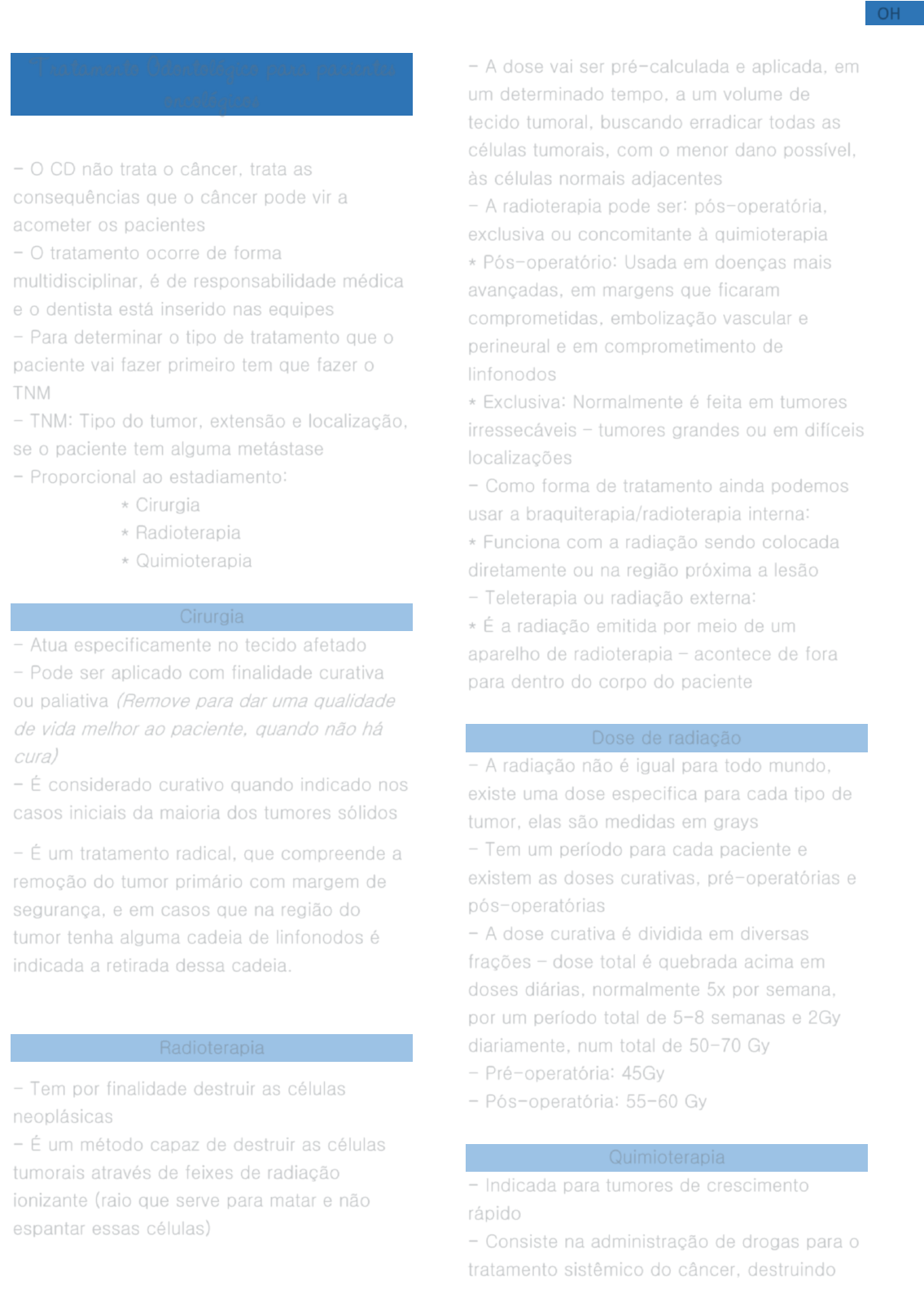 OH @ANNYMOREIRAC Tratamento Odontológico para pacientes oncológicos - O CD não trata o câncer, trata as consequências que o câncer pode vir a acometer os pacientes - O tratamento ocorre de forma multidisciplinar, é de responsabilidade médica e o dentista está inserido nas equipes - Para determinar o tipo de tratamento que o paciente vai fazer primeiro tem que fazer o TNM - TNM: Tipo do tumor, extensão e localização, se o paciente tem alguma metástase - Proporcional ao estadiamento: * Cirurgia * Radioterapia * Quimioterapia Cirurgia - Atua especificamente no tecido afetado - Pode ser aplicado com finalidade curativa ou paliativa (Remove para dar uma qualidade de vida melhor ao paciente, quando não há cura) - É considerado curativo quando indicado nos casos iniciais da maioria dos tumores sólidos - É um tratamento radical, que compreende a remoção do tumor primário com margem de segurança, e em casos que na região do tumor tenha alguma cadeia de linfonodos é indicada a retirada dessa cadeia. Radioterapia - Tem por finalidade destruir as células neoplásicas - É um método capaz de destruir as células tumorais através de feixes de radiação ionizante (raio que serve para matar e não espantar essas células) - A dose vai ser pré-calculada e aplicada, em um determinado tempo, a um volume de tecido tumoral, buscando erradicar todas as células tumorais, com o menor dano possível, às células normais adjacentes - A radioterapia pode ser: pós-operatória, exclusiva ou concomitante à quimioterapia * Pós-operatório: Usada em doenças mais avançadas, em margens que ficaram comprometidas, embolização vascular e perineural e em comprometimento de linfonodos * Exclusiva: Normalmente é feita em tumores irressecáveis – tumores grandes ou em difíceis localizações - Como forma de tratamento ainda podemos usar a braquiterapia/radioterapia interna: * Funciona com a radiação sendo colocada diretamente ou na região próxima a lesão - Teleterapia ou radiação externa: * É a radiação emitida por meio de um aparelho de radioterapia – acontece de fora para dentro do corpo do paciente Dose de radiação - A radiação não é igual para todo mundo, existe uma dose especifica para cada tipo de tumor, elas são medidas em grays - Tem um período para cada paciente e existem as doses curativas, pré-operatórias e pós-operatórias - A dose curativa é dividida em diversas frações – dose total é quebrada acima em doses diárias, normalmente 5x por semana, por um período total de 5-8 semanas e 2Gy diariamente, num total de 50-70 Gy - Pré-operatória: 45Gy - Pós-operatória: 55-60 Gy Quimioterapia - Indicada para tumores de crescimento rápido - Consiste na administração de drogas para o tratamento sistêmico do câncer, destruindo OH @ANNYMOREIRAC células neoplásicas ou controlando seu desenvolvimento (atinge várias partes do corpo, diferente da radioterapia) * Monoquimioterapia – quando usamos apenas um tipo de droga * Poliquimioterapia – Quando é uma associação de drogas * Em associação terapêutica – quando se faz quimio associada a um outro tipo de tratamento oncológico - Vias de administração: * Oral * Intravenosa * Intramuscular * Subcutânea * Intracraneal * Tópica - Classificada em: * Curativa – intuito de eliminar todo o câncer * Adjuvante – eliminar possíveis células após a cirurgia * Neoadjuvante ou prévia – Quando a gente faz antes de radioterapia ou cirurgia com o intuito de diminuir o tumor * Paliativa – Quando o tumor já está avançado, faz para melhorar a qualidade de vida - Qual a atuação do CD? * Reduzir a frequência e a severidade das complicações orais do tratamento odontológico Planejamento do tratamento odontológico 1 – Avaliação pré-tratamento e preparo do paciente para o tratamento oncológico – Se não tiver com a cavidade oral preparada pode acontecer de interromper o tratamento oncológico porque o paciente não tem condições de receber o tratamento, como se alimentar, por exemplo. 2 – Acompanhamento durante o tratamento (hospitalar e autocuidado) – Devido as drogas que causam xerostomia, hipossalivação, mucosite, entre outras. 3 – Acompanhamento e manejo pós- tratamento, incluindo orientações a longo prazo para QT/RT Avaliação pré-tratamento oncológico - Anamnese: Solicitar todas as informações sobre o tratamento oncológico - Exame físico: Avaliar possíveis comprometimentos de funções - Solicitar exames por imagem - Avaliar o grau de higiene bucal - Identificar e tratar sítios de infecções orais agudas ou crônicas - Identificar e eliminar fontes de irritação e trauma - Programar o tratamento odontológico – 14 dias antes do tratamento oncológico, é o melhor período para se programar - Programar a assistência odontológica - Melhor período para intervenção é após o período NADIR (Período de imunossupressão mais intenso – paciente está na fase mais crítica/delicada) - Passou o NADIR, sete dias antes do próximo ciclo de quimio, geralmente, é o melhor período para realizar alguma intervenção - Tratamento de urgência: Dor, sangramento e infecção – independente de como o paciente esteja é necessário tratar Principais complicações da radiação e quimioterapia - Mucosite/úlceras - Dor - Infecções fúngicas, bacterianas e virais - Disgeusia/ alteração do paladar OH @ANNYMOREIRAC - Trismo/ limitação da abertura da boca - Cárie de radiação - Xerostomia - Hipossalivação - Osteorradionecrose e osteonecrose por bisfosfonatos Cuidados com pacientes em tratamento de câncer 1. Orientação de higiene: - Escovas: Novas, cabeças pequenas e cerdas macias - Creme dental com flúor: Necessário que seja livre de substâncias irritantes, agentes abrasivos ou parabenos (creme dental branco, curaprox enzycal, colgate sensitive pro alivio e periogard) - Antisséptico bucal: Clorexidina 0,12%, 2x ao dia, 30 minutos após a escova