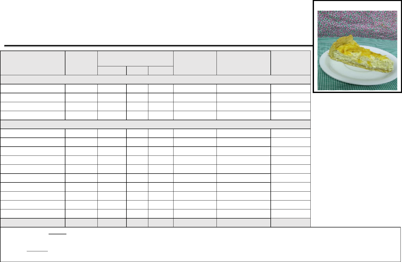 FICHA TÉCNICA Tema da aula: Gastronomia Internacional Preparação: Quiche de queijo Classificação: Acompanhamento Nº de porções: 20 Ingredientes Descrição do PL Per Capita Quantidade Total (g/mL) Medida Caseira Custo (R$) PL FC PB Massa Farinha de trigo Sugerido 25,00 g - 25,00 g 500 g 4 xícaras de chá R$ 1,30 Manteiga Sugerido 12,50 g - 12,50 g 250 g 1 + ½ xícara de chá R$ 2,49 Gema de ovo Sugerido 2,88 g 3,84 11,05 g 221 g 4 gemas R$ 1,15 Sal Sugerido 0,15 g - 0,15 g 3,00 g 1 colher de chá R$ 0,00 Recheio Ricota Sugerido 6,15 g - 6,15 g 123 g 1 xícara cheia R$ 1,88 Queijo emental Sugerido 12,70 g - 12,70 g 254 g 3 xícaras cheia R$ 26,48 Queijo mussarela Sugerido 7,00 g - 7,00 g 140 g 5 fatias medias R$ 3,15 Queijo gorgonzola Sugerido 5,10 g - 5,10 g 102 g 1 xícara de chá R$ 12,15 Queijo parmesão ralado Sugerido 6,15 g - 6,15 g 123 g 1 xícara de chá R$ 7,24 Creme de leite Sugerido 20,00 g - 20,00 g 400 g 2 xícaras de chá R$ 5,70 Sal Sugerido 0,10 g - 0,10 g 2,00 g ½ colher de chá R$ 0,00 Pimenta Sugerido 0,03 g - 0,03 g 0,60 g ½ colher de chá R$ 0,00 Ovo Sugerido 2,16 g 3,84 8,30 g 166 g 3 unidades R$ 0,87 Parmesão para polvilhar Sugerido 0,85 g - 0,85 g 17 g ½ xícara de chá R$ 1,00 Somatório - 101 - - - - R$ 63,41 Modo de preparo: Massa: Junte a farinha e a manteiga e faça uma farofa com a pontoa dos dedos, junte a gema e o sal, formando uma massa que desgruda das mãos. Cubra a massa r leve-a à geladeira por 30 minutos. Abra a massa com a ponta dos dedos em uma forma de fundo removível, furando-a com a ponta de um garfo. Recheio: Misture a ricota bem amassada, metade do parmesão ralado, os queijos emental, mussarela e gorgonzola, e o creme de leite, tempere com sal e pimenta e acrescente os ovos ligeiramente batidos. Distribua o recheio sobre a massa base. E polvilhe a outra metade do parmesão sobre a quiche PORÇÃO MÉDIA montada. Tempo de preparo: 2 horas Rendimento total: 2.130 g Rendimento per capita: 107 g Fator de cocção: 1,05 Custo per capita: R$ 3,17 Porção média (em gramas e medida caseira): 114 g (1 pedaço médio) CÁLCULOS FATOR DE CORREÇÃO FC = QT Bruta ÷ QT Líquida FC OVO (GEMA) = 221 ÷ 57,60 → FC OVO (GEMA) = 3,84 FC OVO = 166 ÷ 43,20 → FC OVO = 3,84 FATOR DE COCÇÃO Fcç = Rendimento Total da Preparação ΣPesos Líquidos (PLs) x N° de porções Fcç = 2.130 ÷ 101 x 20 Fcç = 2.130 ÷ 2.020 Fcç = 1,05 INFORMAÇÃO TÉCNICA A preparação tem sua origem na antiga Alemanha sendo adotada posteriormente pela culinária francesa e tem um sabor bem forte e característico pela grande variedade de queijos presente no recheio, os queijos também são responsáveis pela textura, aroma e sabor do prato, além de agregar bastante a bela aparência da preparação final. A quiche tem uma grande agregação de valor, pois os queijos utilizados são queijos nobres deixando a preparação bastante requintada. Os queijos utilizado geralmente são o ricota, mussarela, parmesão, emental e o gorgonzola, que têm o sabor bem apurado e também trazem o aroma a preparação, além da consistência do recheio, foi utilizado também o creme de leite e o ovo, para dar consistência e liga ao recheio.