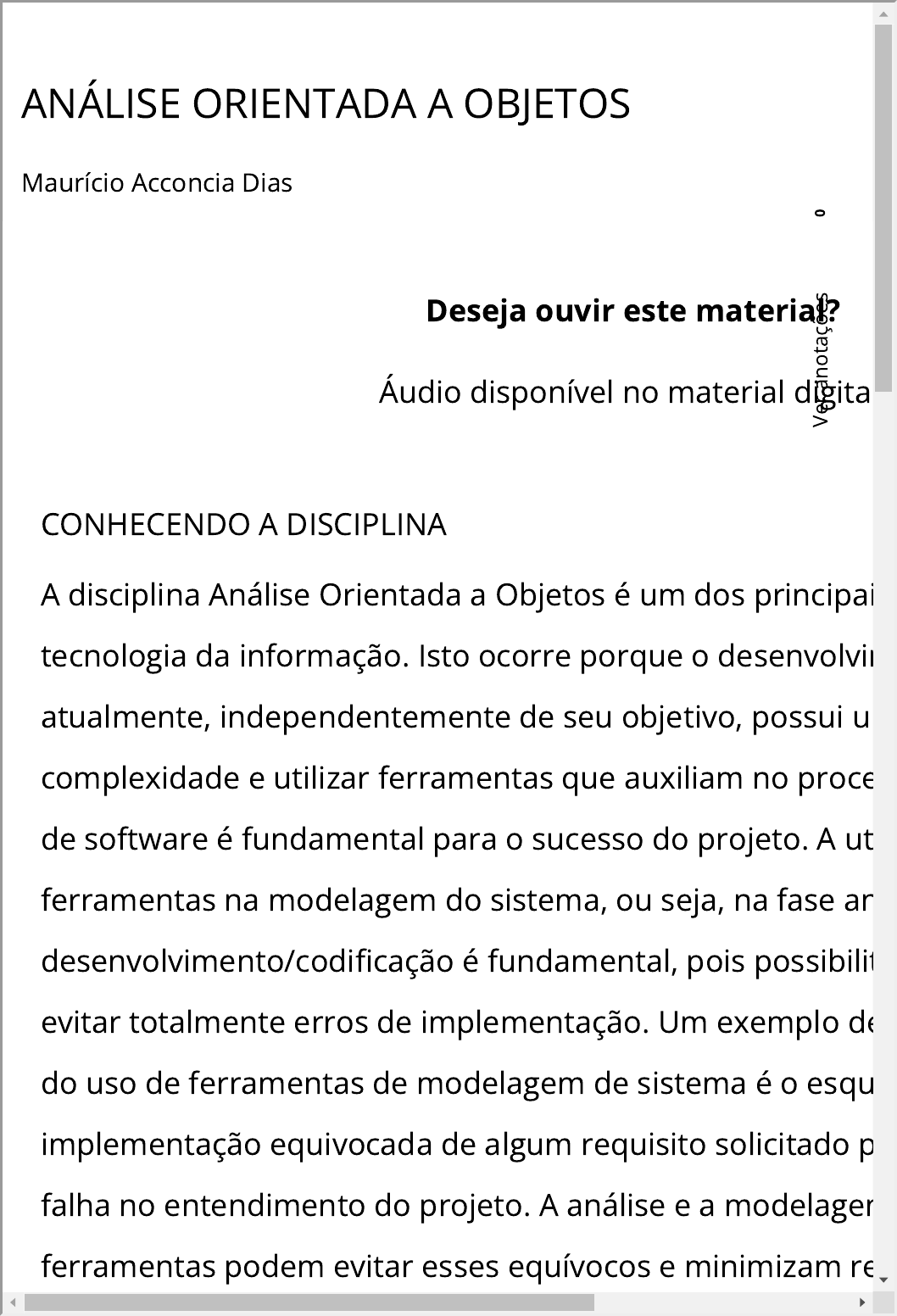 27/01/2023 06:18 https://colaboraread.com.br/integracaoAlgetec/index?usuarioEmail=rafaelbmo%40live.com&usuarioNome=RAFAEL+FRAN… https://colaboraread.com.br/integracaoAlgetec/index?usuarioEmail=rafaelbmo%40live.com&usuarioNome=RAFAEL+FRANCISCO+AMARAL&dis… 1/1 ANÁLISE ORIENTADA A OBJETOS Maurício Acconcia Dias CONHECENDO A DISCIPLINA A disciplina Análise Orientada a Objetos é um dos principai tecnologia da informação. Isto ocorre porque o desenvolvim atualmente, independentemente de seu objetivo, possui u complexidade e utilizar ferramentas que auxiliam no proce de software é fundamental para o sucesso do projeto. A ut ferramentas na modelagem do sistema, ou seja, na fase an desenvolvimento/codi�cação é fundamental, pois possibilit evitar totalmente erros de implementação. Um exemplo de do uso de ferramentas de modelagem de sistema é o esqu implementação equivocada de algum requisito solicitado p falha no entendimento do projeto. A análise e a modelagem ferramentas podem evitar esses equívocos e minimizam re Deseja ouvir este material? Áudio disponível no material digita 0 V e r a n o ta çõ e s 27/01/2023 06:19 lddkls202_ana_ori_obj https://conteudo.colaboraread.com.br/202002/INTERATIVAS_2_0/ANALISE_ORIENTADA_A_OBJETOS/LIVRO_DIGITAL/index.html 1/3 ANÁLISE ORIENTADA A OBJETOS Maurício Acconcia Dias CONHECENDO A DISCIPLINA A disciplina Análise Orientada a Objetos é um dos principais pilares dos cursos de tecnologia da informação. Isto ocorre porque o desenvolvimento de softwares, atualmente, independentemente de seu objetivo, possui um alto nível de complexidade e utilizar ferramentas que auxiliam no processo de desenvolvimento de software é fundamental para o sucesso do projeto. A utilização dessas ferramentas na modelagem do sistema, ou seja, na fase anterior ao processo de desenvolvimento/codi�cação é fundamental, pois possibilita minimizar ou até evitar totalmente erros de implementação. Um exemplo de erro evitável por meio do uso de ferramentas de modelagem de sistema é o esquecimento ou implementação equivocada de algum requisito solicitado pelo cliente, por conta de falha no entendimento do projeto. A análise e a modelagem por meio dessas ferramentas podem evitar esses equívocos e minimizam retrabalho após a entrega do produto. Assim, é possível utilizar diversas ferramentas de análise (modelagem), projeto e desenvolvimento para auxiliar o processo de criação, implementação e teste de software. Tais ferramentas e as técnicas auxiliam e viabilizam que o projeto esteja de acordo com a especi�cação e a documentação do projeto que permite que times grandes de desenvolvimento obtenham informação con�ável da mesma fonte, evitando erros no momento do desenvolvimento. Isso é de extrema importância, pois esses erros podem gerar custos adicionais ao projeto e podem impactar no orçamento da empresa. Tais custos adicionais podem estar associados ao atraso da entrega do produto e a possíveis correções devido a erros Deseja ouvir este material? Áudio disponível no material digital. 0 V e r a n o ta çõ e s 27/01/2023 06:19 lddkls202_ana_ori_obj https://conteudo.colaboraread.com.br/202002/INTERATIVAS_2_0/ANALISE_ORIENTADA_A_OBJETOS/LIVRO_DIGITAL/index.html 2/3 no desenvolvimento, o que re�ete no pagamento de horas a mais de desenvolvimento necessárias tanto antes da entrega quanto após a entrega do software ao cliente para correção. Além disso, tais técnicas permitem antecipar os problemas enfrentados, auxiliam nas soluções e são de grande importância na área de desenvolvimento. A UML, cuja sigla em inglês signi�ca Uni�ed Modeling Language ou Linguagem de Modelagem Uni�cada, é uma das principais ferramentas de modelagem utilizadas em empresas de desenvolvimento de software. Sua utilização permite que a etapa de análise de requisitos seja feita de forma e�ciente gerando a documentação necessária para que todo o processo de desenvolvimento ocorra dentro do planejamento. Ao estudar os conteúdos apresentados neste material você será capaz de analisar um problema com foco na utilização da linguagem UML, o que é encarado atualmente como um conhecimento essencial para um desenvolvedor de software no mercado de trabalho. E, considerando este cenário, este material irá abordar os principais aspectos relacionados a UML: inicialmente (unidade 1), o histórico e as principais de�nições são apresentados com objetivo de demonstrar a importância da linguagem e sua aplicabilidade, em seguida serão apresentadas as formas de modelagem dos diversos diagramas utilizando a linguagem UML começando com os mais básicos (casos de uso, classes e atividades na unidade 2) e seguindo com os mais especí�cos (máquina de estados, sequência e demais diagramas de interação na unidade 3) e, por �m, na unidade 4, um caso de uso será apresentado com todas as etapas para que �que claro como todo o processo apresentado anteriormente é realizado. 0 V e r a n o ta çõ e s 27/01/2023 06:19 lddkls202_ana_ori_obj https://conteudo.colaboraread.com.br/202002/INTERATIVAS_2_0/ANALISE_ORIENTADA_A_OBJETOS/LIVRO_DIGITAL/index.html 3/3 Caro aluno, a disciplina Análise Orientada a Objetos é de extrema importância em sua formação para a análise e o desenvolvimento de sistemas. Após concluí-la, você estará preparado para realizar a modelagem de sistemas para, posteriormente, realizar a etapa de desenvolvimento/codi�cação. Além disso, poderá se aprofundar nos desa�os que o mercado de trabalho atual apresenta, especialmente porque a UML é amplamente utilizada em diferentes empresas antes de iniciarem o desenvolvimento do software propriamente dito. Essa linguagem é fundamental para reduzir possível retrabalho no ciclo de desenvolvimento de software. Então, prepare-se para, a partir deste momento, iniciar seus estudos, conhecer essa importante ferramenta e se tronar um excelente pro�ssional. Bon