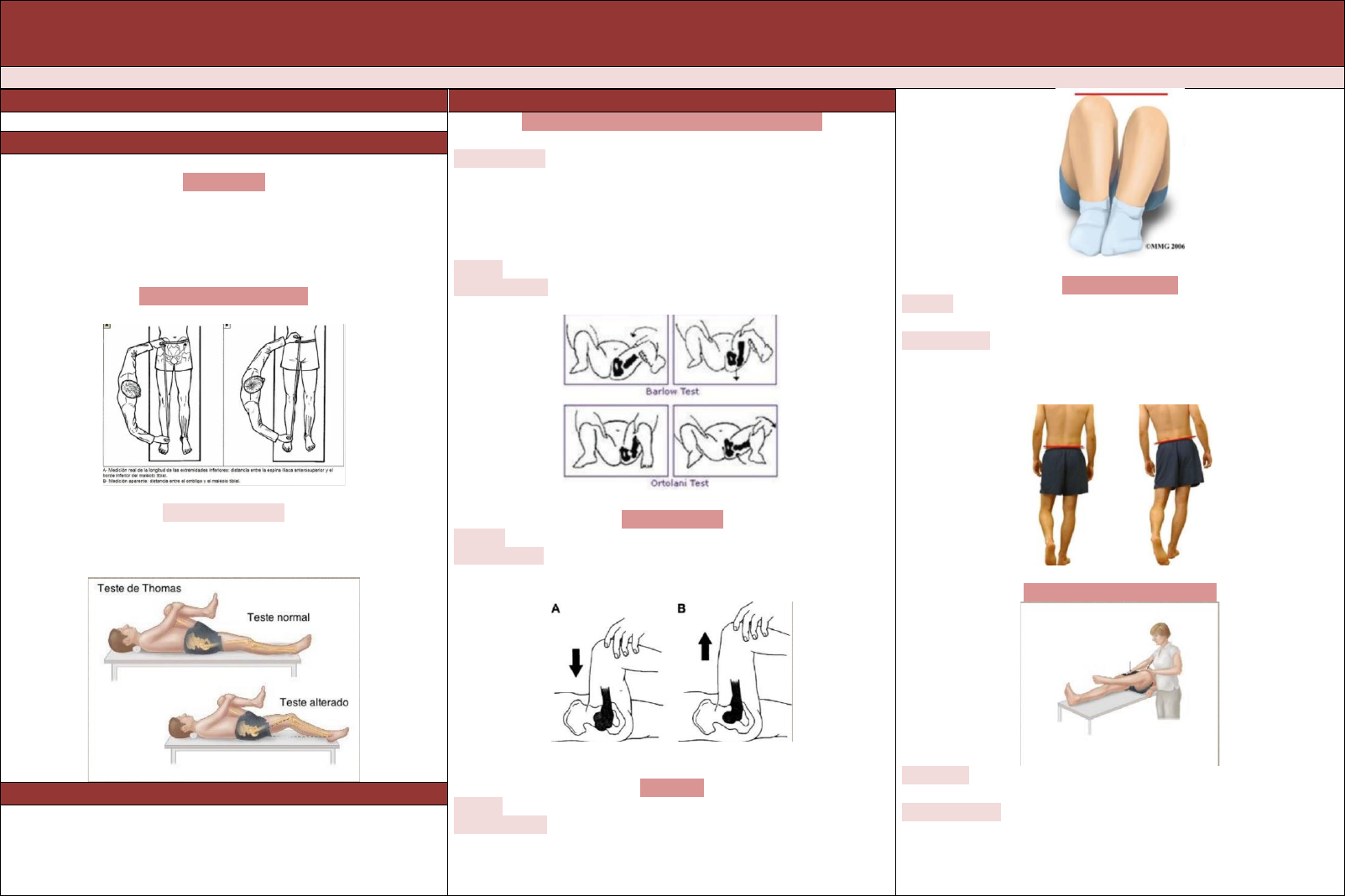 EXAME FÍSICO QUADRIL INSPEÇÃO ESTÁTICA Atrofia muscular INSPEÇÃO DINÂMICA Avaliação da mobilidade (amplitude) AMPLITUDES • Flexão 130 • Extensão 0-30 • Teste de Thomas • Abdução 45 • Adução 45 MEDIDA REAL E APARENTE EIAS até maléolo medial → REAL TESTE DE THOMAS: Fazer flexão da perna máxima de um lado do quadril, provocando uma rotação do quadril – teste alterado se o paciente não consegue fazer a rotação PALPAÇÃO • Tubérculo púbico (palpar) • Outra mão no trocanter maior • Palpação da tuberosidade isquiática MANOBRAS ESPECIAIS MANOBRA DE BARLOW E ORTOLANI PARA DDQ SINAL DE ORTOLANI: COMO FAZER: abdução suave da coxa com o quadril fletido a 90º. Durante esta manobra o dedo indicador e médio exercem pressão leve sobre o trocânter do quadril examinado. Na doença displásica do quadril (luxação congênita) pode-se sentir um ressalto no momento em que o quadril é reduzido pela manobra que caracteriza o sinal positivo. SINAL DE BARLOW: INDICA: se presente no recém-nascido o quadril é luxável. COMO FAZER: realizar pressão suave medialmente e no sentido longitudinal do fêmur com o quadril aduzido. TELESCOPAGEM AVALIA: instabilidade do quadril. COMO FAZER: pressão longitudinal da coxa com o quadril na posição fletida a 90º. O deslocamento no sentido axial caracteriza o teste positivo. GALLEAZI: INDICA: Quadril subluxado posterior COMO FAZER: em decúbito dorsal, em posição simétrica, com os membros inferiores fletidos de modo a manter os pés juntos. Quando há discrepância de comprimento dos membros os topos dos joelhos ficam em alturas diferentes. TRENDELEMBERG: AVALIA: a integridade da função dos músculos abdutores do quadril (Glúteo médio). COMO FAZER: Paciente apoia o peso todo em um único pé. Ocorre uma inclinação do tronco para o lado do membro apoiado. A falha desse mecanismo positiva o teste. (Queda da pélvis ao invés de sua elevação no lado apoiado. TESTE DE PATRICK OU FABERE: DETECTA: patologias do quadril, como as da articulação sacro- ilíaca. COMO FAZER: Com o paciente em decúbito dorsal, colocamos o calcanhar do membro inferior em questão sobre o joelho do lado oposto; o examinador aplica então uma força sobre o joelho fletido e outra sobre a espinha ilíaca ântero-superior oposta, como se estivesse abrindo um livro.