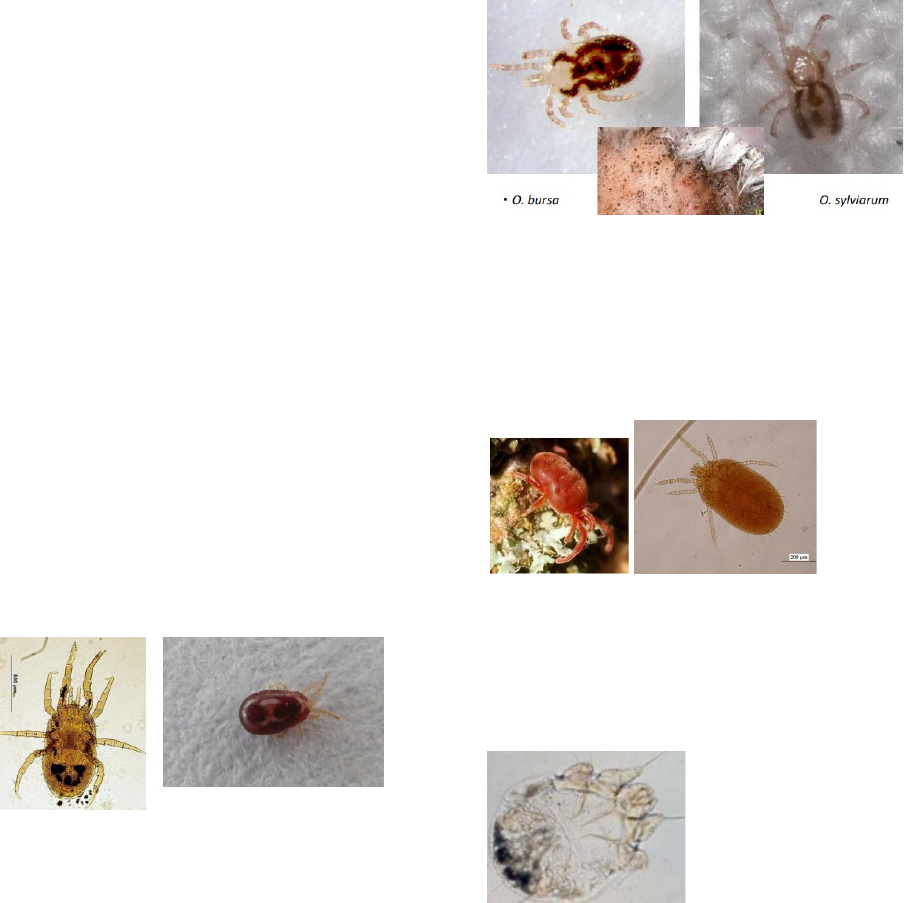 ECTOPARASITAS -Artrópodes que vivem na pele e nas penas, normalmente não causa mortalidade mas o fato delas passarem muito tempo se coçando, faz com que a produção caia. -As perdas podem ser maiores quando tem a possibilidade de ocorrer dermatites e alergias nas aves e nos operários da granja -São importantes também os insetos que de desenvolvem e vivem no esterco das aves, em carcaças de aves mortas e em resíduos orgânicos úmidos 1. Ácaros -Dermanyssus (ácaro vermelho, piolho de galinha) -Podem viver 34 semanas sem se alimentar no ambiente sem se alimentar (o vazio sanitário pode não ser eficiente). -São encontrados em regiões de clima temperado, sendo raro em instalações com gaiola. Alimenta-se principalmente à noite (por isso é necessário examinar a ave durante a noite), escondendo-se durante o dia em frestas, rachaduras do chão e paredes, debaixo do esterco. -Tratar tanto as aves quanto as instalações. -Dermanyssus gallinae: -Ornithonyssus -Vivem todo o ciclo na ave, podem ser encontrados durante o dia e a noite. Quando em grande quantidade, as penas ficam escurecidas e a pele parece arranhada e escamosa no ventre. -Deve examinar as aves. Sobem rapidamente pelas mãos e braços do operador. Devido a sua rápida disseminação, caso uma ave esteja infectada, deve tratar todas. -É comum ver os ácaros andando sobre os ovos colocados nas bandejas. -Deve-se examinar as aves 2x por mês (20-60 aves em média) para evitar perdas. -Podem entrar no aviário através de pintos contaminados, caminhões e caixa de transporte infestados, equipamentos, pessoal e aves silvestres. -Tratar as aves 2x, com intervalo de 5-7 dias. -Trombicula autumnalis -São de vida livre, causam coceira, vesículas e abscesso no local da picada, rodeado por uma região de vermelhidão e inchaço, vivem sobre a pele injetando uma substância irritante e alimentando-se de tecidos liquefeitos. -Cnemidocoptes mutans -São ácaros das patas, causa hiperqueratose (mais comum em aves velhas). Deve banhar as patas com óleo vegetal para retirar as crostas e depois aplicar acaricida. -Cnemidocoptes gallinae -Ácaros depenadores, causam tanta irritação que as aves retiram as penas. Aparecem mais na primavera no verão. *As vezes é possível encontrar ácaros internos, que normalmente não causam problemas. Cytodites (em sacos aéreos) e Laminosioptes ( no subcutâneo). Família Uropodidae Vivem na cama alimentando-se de fungos e não causam problemas às aves. Não é necessário sua retirada. Controle geral dos ácaros -Identificar corretamente o ácaro (coletar o ácaro em álcool 70%) -Manter a propriedade livre de roedores -Impedir acesso de aves silvestres -Lavar e desinfetar os equipamentos entre um lote e outro -Desinfetar as bandejas de plásticos e examinar as de papelão -Diminuir ao máximo a circulação de pessoas entre os galpões -Impedir a introdução de aves infestadas -Examinar a cada 30 dias as instalações e uma amostra de 20-30 aves de cada galpão. -De acordo com os ácaros, deve-se tratar: 2. Piolhos São mastigadores, alimentando-se de penas e escamações da pele. -Vivem permanentemente no corpo das aves -Encontrados na pele principalmente ao redor da cloaca, peito e coxas -A fêmea coloca os ovos nas penas. -A espécie Menacanthus pode consumir sangue ao raspar a pele da base das penas -Em galinhas adultas não causam grandes problemas pois usa o bico para catar. -Em aves jovens causam irritação que interfere no repouso das aves afetando seu crescimento. -Controle: examinar 20-30 aves por galpão a cada 1-2 semanas. A presença de poucos parasitas já indica a necessidade de tratamento. Deve-se ter cuidados especiais no outono/inverno . -Aplicar inseticida 2x a intervalos de 7-10 dias, completar o tratamento com a limpeza do galpão. -Completar tratamento com a limpeza do galpão, assegurar-se que toda a ave foi tratada. -Certas práticas de manejo aumentam/ diminuem a população de piolhos: debicagem/ muda forçada. 3. Percevejos -Insetos que se alimentam de sangue. O corpo é achatado de contorno oval com menos de 1 cm de comprimento, sem asas. Adultos vivem até 1 ano sem se alimentar, dependendo da temperatura. -A fêmea põe os ovos em frestas e em 4-20d nascem ninfas. Trocam de pele 5x, alimentando-se a cada troca e voltando às frestas para digerir o sangue e fazer nova troca. -Ornithocoris toledo: -Controle: tratar abrigos (frestas, rachaduras de paredes e chão, embaixo de ninhos, poleiros), utilizar produto com poder residual combinado com a fumigação. 4. Pulgas -Só a fase adulta parasita as aves. As larvas vivem no meio ambiente alimentando-se de restos de penas, escamações da pele e fezes de pulgas adultas. -Os ovos são postos no corpo do animal, caindo depois no solo. Os adultos vivem semanas sem se alimentar e quando estão alimentados vivem meses e até anos. -Echidnophaga gallinacea vive aderida na pele formando ulcerações na cabeça e pescoço. -Ceratophyllus gallinae sobe no corpo para se alimentar -A pulga do gato e a pulga do homem, podem atacar as aves. -Controle: remoção da cama infectada e aspersão do aviário infestado. Tratar a nova cama para matar as pulgas adultas e evitar entrada de animais. Luz do sol, tempo quente, umidade excessiva e congelamento impedem seu desenvolvimento. 5. Carrapatos -Os principais são os de corpo mole (gênero Argas) -São raros em criações de gaiola. As fêmeas põem de 500-800 ovos em 4-5 posturas necessitando sugar sangue antes de cada postura. -Os ovos são postos em frestas e cascas de árvores. -As larvas se fixam nas aves por 4-5d. Deixam as aves e buscam abrigo para mudarem para ninfa. -Argas: -Geralmente sobem nas aves a noite. Os sinais são penas arrepiadas, falta de apetite, diarréias. -A perda de sangue leva a anemia, emagrecimento, retardo no crescimento e diminuição na postura. -Os carrapatos também podem transmitir agentes como Borrelia anserina. causadora de uma espiroquetose alt