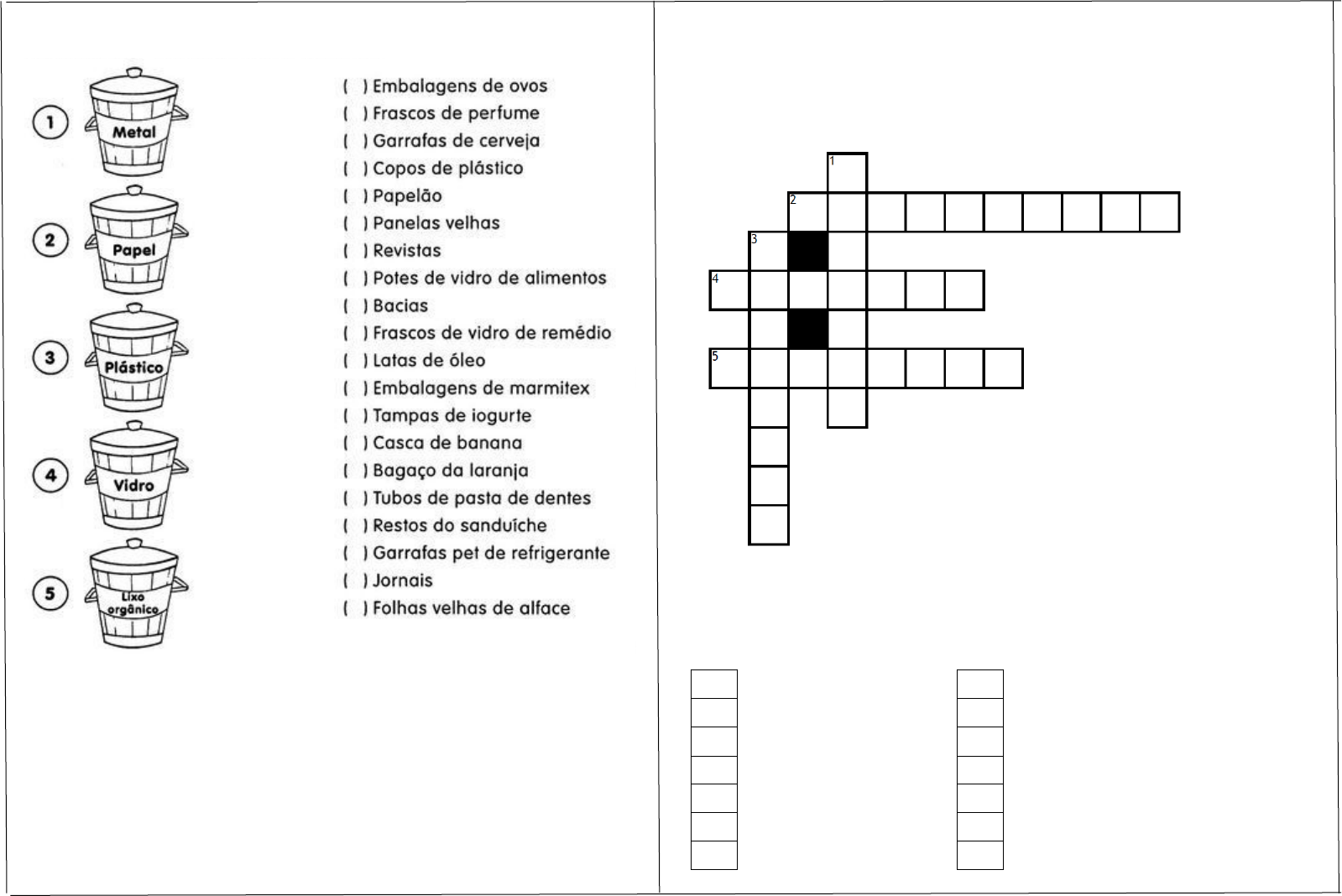 A. Enumere a segunda coluna de acordo com a primeira: B.Complete a cruzadinha com os 5Rs da sustentabilidade 1. Diminuir geração de lixo 2. Dar uma nova utilidade aos materiais 3. Mudar hábitos e atitudes 4. Não consumir produtos que gerem impactos ambientais significativos. 5. Transformar material usado em material novo a partir de processos industriais. C.Complete com a legenda de cada palavra de acordo com o tipo de lixo. 1 – INÔRGANICO 2 – ORGÂNICO Lápis Casca de fruta Flores naturais Papelão Papel Plásticos Vidro Metais Latinhas Restos de alimentos Garrafas plásticas Palhas e sabugo de milho Detritos de cozinha Cascas de legumes