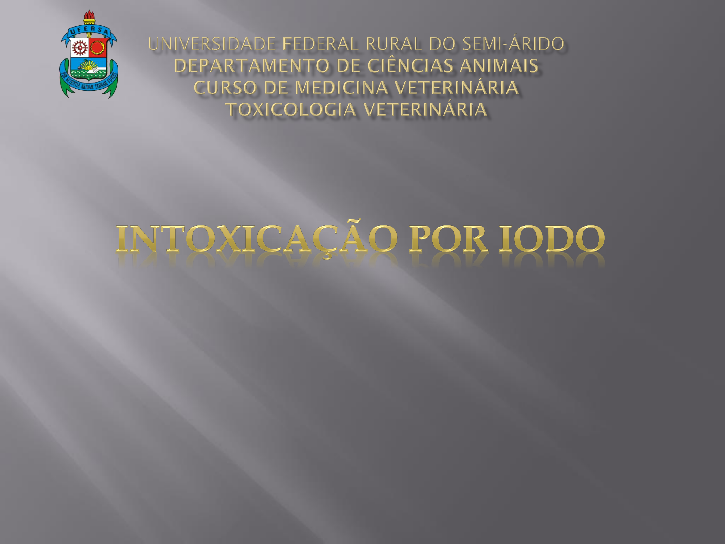 1 Belize Costa Andrade O iodo (I) é essencial para a formação de T3 e T4 ; Prevenir doenças infecciosas e tratamento de pododermatite – iodeto de potássio, iodeto de sódio; Atuam no crescimento físico e neurológico e na manutenção do fluxo normal de energia (metabolismo basal, principalmente na manutenção do calor do corpo). Funcionamento de vários órgãos como o coração, fígado, rins, ovários e outros. Os hormônios T3 e T4 são pouco solúveis em água e circulam ligados à globulina, à préalbumina e à albumina. A concentração do T4 é maior, mas o T3 é o mais ativo dos dois hormônios.; 2 Propriedades químicas e distribuição Microelemento; Volatilizado pela ação da luz do sol e calor; Encontrado em todos os tecido e fluidos do corpo; 3 Requerimento 4 Metabolismo: Absorvido na forma de iodeto inorgânico no TGI(mucosa intestinal do intestino delgado); Ruminantes: 70 a 80% do iodo ingerido pela via oral é absorvido no rúmen e 10% no omaso (Barua et all., 1964). Transportado na forma livre ou em anexo a proteínas do plasma (tireoglobulina, albumina) -> Glândula tireóide ; A principal via de excreção do iodeto é a renal. 5 As espécies diferem em sua suscetibilidade à toxicidade: Bovinos e ovinos – 50 ppm ; Suínos – 400 ppm; Aves – 30 ppm; Eqüinos – 5 ppm; NRC, 1980 6 Excesso de iodo pode promover o hipotireoidismo ao induzir o bloqueio da biossíntese ou ao causar problemas na excreção dos hormônios tireoideanos (Castillo et al., 2003). 7 Administração parenteral (intramuscular) de compostos contendo iodo. Fornecimento de sal comum iodado ou iodo adicionado aos suplementos minerais ou concentrados (núcleos minerais), para consumo oral pelos animais (McDowell, 1999; Underwood & Suttle, 1999) 8 Bovinos: perda do apetite, lacrimação excessiva, descamação da pele, dificuldade para engolir alimentos e tosse, níveis aumentados no leite; Ovinos: depressão, anorexia, hipotermia e diminuição do ganho de peso Aves: redução na produção e tamanho dos ovos, níveis aumentados nos ovos; (McDowell, 1992) 9 Suínos: redução da taxa de crescimento, consumo de alimentos, nível de hemoglobina e concentração de ferro no fígado; Cães: lesões necróticas no fígado Equinos: tireóide aumentada, aborto (McDowell, 1992) 10 Histórico, sinais clínicos; Confirmação apenas com dosagem de iodo no soro, urina, leite e/ou no sangue; Dosagem dos hormônios tireoidianos, principalmente tiroxina, no plasma. 11 Remoção da fonte de iodo da dieta e suspensão do tratamento com iodo quando for o caso. 12 13 Equino, SRD, 450 kg, 14 anos; Encaminhado ao Hovet da Faculdade de Ciências Agrárias e Veterinárias- UNESP; Feridas granulomatosas com secreção abundante na região distal dos membros torácicos; Ressecção cirúrgica e biópsia do tecido granulomatoso; 14 Necropsia/histopatológico: necrose extensa de tecido epitelial, associado a um marcante afluxo inflamatório de neutrófilos, edema perivascular e várias extremamente eosinofílicas; Perifericamente – hifas fúngicas; Enfermidade pitiose cutânea eqüina 15 Lacrimejamento abundante, secreção nasal seromucóide, salivação excessiva, progressiva apatia, apetite seletivo, relutância em andar, musculatura dos membros pélvicos contraída; Descamação da pele na região das orelhas, perda de brilho e queda de pelo; Sudorese abundante, redução de motilidade intestinal e hipertermia ( 39,8 ºC ) ; 16 Tratamento: 60 g de iodeto de potássio, diariamente, por v.o iniciado no mesmo dia da cirurgia; Treze dias após o início da terapia sistêmica foi observado: edema na porção ventral torácica e abdominal, edema de prepúcio, edema de membros pélvicos, principalmente articulação tibiotarsometatársica. Evoluindo conforme os dias. 17 O caráter do quadro progressivo foi evidente e não foi observado o aumento da glândula tireóide; O iodeto de potássio foi suspenso quando o animal apresentou-se completamente apático, anoréxico e sem motilidade intestinal; Coleta de sangue realizada para confirmar a suspeita clínica de hipotireoidismo; 18 O resultado do exame: concentração de T4 (0,10 µg/dL) ou seja abaixo dos valores de referência para equinos (2,5 a 4,5 µg/dL); Após 24 horas sem medicação com iodeto de potássio, o animal apresentava-se: alerta ao ambiente, alimentou-se e apresentou motilidade intestinal; Com o passar dos dias os sinais regrediram por completo 19 20 BERNADÁ, M.H.G. Metabolismo do Iodo, 2004. Disponível em : http://www6.ufrgs.br/favet/lacvet/restrito/pdf/iodo.pdf. Acessado em : 12 nov. 2011. Hillmann, D.; Curtis, A. R.. Chronic Iodine Toxicity in Dairy Cattle: Blood Chemistry, Leukocytes, and Milk Iodine. Journal of Dairy Science, v. 63, n. 1, p. 55-63, 1980. R.G.S. Dória, P.A. Canola, G. Ribeiro, P.A. Di Filipo, D.P.M. Dias, C.A.A. Valadão. Hipotireoidismo iatrogênico em eqüino decorrente de excesso de iodo: relato de caso. Arq. Bras. Med. Vet. Zootec., v.60, n.3, p.521-524, 2008 WARKENTIN, M. BOCIO: Aspectos nutricionais e toxicológicos. Programa de Pós Graduação em Ciências Veterinárias. 2003. RIET-CORREA, F.; SOARES, M. P.; MENDEZ, M. R. T. Intoxicações em eqüinos no Brasil. Ciência Rural, Santa Maria, v. 28, n. 4, p. 715-722, 1998. 21 http://www6.ufrgs.br/favet/lacvet/restrito/pdf/iodo.pdf http://www6.ufrgs.br/favet/lacvet/restrito/pdf/iodo.pdf http://www6.ufrgs.br/favet/lacvet/restrito/pdf/iodo.pdf http://www6.ufrgs.br/favet/lacvet/restrito/pdf/iodo.pdf http://www6.ufrgs.br/favet/lacvet/restrito/pdf/iodo.pdf http://www6.ufrgs.br/favet/lacvet/restrito/pdf/iodo.pdf http://www6.ufrgs.br/favet/lacvet/restrito/pdf/iodo.pdf http://www6.ufrgs.br/favet/lacvet/restrito/pdf/iodo.pdf http://www6.ufrgs.br/favet/lacvet/restrito/pdf/iodo.pdf http://www6.ufrgs.br/favet/lacvet/restrito/pdf/iodo.pdf
