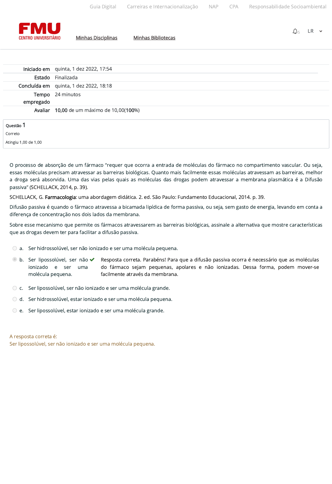 04/05/2023, 08:49 Atividade 2 (A2): Revisão da tentativa https://ambienteacademico.com.br/mod/quiz/review.php?attempt=1515916&cmid=602874 1/8 Iniciado em quinta, 1 dez 2022, 17:54 Estado Finalizada Concluída em quinta, 1 dez 2022, 18:18 Tempo empregado 24 minutos Avaliar 10,00 de um máximo de 10,00(100%) Questão 1 Correto Atingiu 1,00 de 1,00 O processo de absorção de um fármaco “requer que ocorra a entrada de moléculas do fármaco no compartimento vascular. Ou seja, essas moléculas precisam atravessar as barreiras biológicas. Quanto mais facilmente essas moléculas atravessam as barreiras, melhor a droga será absorvida. Uma das vias pelas quais as moléculas das drogas podem atravessar a membrana plasmática é a Difusão passiva” (SCHELLACK, 2014, p. 39). SCHELLACK, G. Farmacologia: uma abordagem didática. 2. ed. São Paulo: Fundamento Educacional, 2014. p. 39. Difusão passiva é quando o fármaco atravessa a bicamada lipídica de forma passiva, ou seja, sem gasto de energia, levando em conta a diferença de concentração nos dois lados da membrana. Sobre esse mecanismo que permite os fármacos atravessarem as barreiras biológicas, assinale a alternativa que mostre características que as drogas devem ter para facilitar a difusão passiva. a. Ser hidrossolúvel, ser não ionizado e ser uma molécula pequena. b. Ser lipossolúvel, ser não ionizado e ser uma molécula pequena. Resposta correta. Parabéns! Para que a difusão passiva ocorra é necessário que as moléculas do fármaco sejam pequenas, apolares e não ionizadas. Dessa forma, podem mover-se facilmente através da membrana. c. Ser lipossolúvel, ser não ionizado e ser uma molécula grande. d. Ser hidrossolúvel, estar ionizado e ser uma molécula pequena. e. Ser lipossolúvel, estar ionizado e ser uma molécula grande. A resposta correta é: Ser lipossolúvel, ser não ionizado e ser uma molécula pequena. Guia Digital Carreiras e Internacionalização NAP CPA Responsabilidade Socioambiental Minhas Disciplinas Minhas Bibliotecas 5 LR https://codely-fmu-content.s3.amazonaws.com/Moodle/GuiaDigital/Guia+digital/index.html https://carreiras.fmu.br/ https://codely-fmu-content.s3.amazonaws.com/Moodle/NAP/inicial/nap/fmu/index.html https://codely-fmu-content.s3.amazonaws.com/Moodle/CPA/landing_CPA/index.html https://portal.fmu.br/sustentabilidade https://ambienteacademico.com.br/ https://ambienteacademico.com.br/ https://ambienteacademico.com.br/course/view.php?id=236 04/05/2023, 08:49 Atividade 2 (A2): Revisão da tentativa https://ambienteacademico.com.br/mod/quiz/review.php?attempt=1515916&cmid=602874 2/8 Questão 2 Correto Atingiu 1,00 de 1,00 Os parâmetros farmacocinéticos são responsáveis por “determinar como o organismo lida com substâncias exógenas, como os fármacos, uma vez que sejam administrados. Esses parâmetros são essenciais para o emprego da farmacoterapia e das complicações do tratamento com os fármacos” (SCHELLACK, 2014, p. 54). SCHELLACK, G. Farmacologia: uma abordagem didática. 2. ed. São Paulo: Fundamento Educacional, 2014. p. 54. Dentre os vários parâmetros farmacocinéticos, considere a cinética de primeira ordem. Sobre esse parâmetro, assinale a alternativa que apresente suas características especí�cas. a. Sofre saturação e a velocidade do metabolismo da droga é constante. b. Não sofre saturação e a velocidade do metabolismo da droga é diretamente proporcional à concentração da droga livre. Resposta correta. Parabéns! As características exclusivas da cinética de primeira ordem é o fato de não sofrer saturação e a velocidade do metabolismo da droga ser diretamente proporcional à concentração da droga livre. c. Sofre saturação e a velocidade do metabolismo da droga é inversamente proporcional à concentração da droga livre. d. Não sofre saturação e a velocidade do metabolismo da droga é inversamente proporcional à concentração da droga livre. e. Não sofre saturação e a velocidade do metabolismo da droga é constante. A resposta correta é: Não sofre saturação e a velocidade do metabolismo da droga é diretamente proporcional à concentração da droga livre. Guia Digital Carreiras e Internacionalização NAP CPA Responsabilidade Socioambiental Minhas Disciplinas Minhas Bibliotecas 5 LR https://codely-fmu-content.s3.amazonaws.com/Moodle/GuiaDigital/Guia+digital/index.html https://carreiras.fmu.br/ https://codely-fmu-content.s3.amazonaws.com/Moodle/NAP/inicial/nap/fmu/index.html https://codely-fmu-content.s3.amazonaws.com/Moodle/CPA/landing_CPA/index.html https://portal.fmu.br/sustentabilidade https://ambienteacademico.com.br/ https://ambienteacademico.com.br/ https://ambienteacademico.com.br/course/view.php?id=236 04/05/2023, 08:49 Atividade 2 (A2): Revisão da tentativa https://ambienteacademico.com.br/mod/quiz/review.php?attempt=1515916&cmid=602874 3/8 Questão 3 Correto Atingiu 1,00 de 1,00 Questão 4 Correto Atingiu 1,00 de 1,00 Segundo Rang et al. (2016, p. 319), farmacocinética é “a medida e a interpretação formal de alterações temporais nas concentrações de um fármaco em uma ou mais regiões do organismo em relação à dose administrada. Ou seja, representa o que o organismo faz com o fármaco”. RANG, H. P. et al. Rang & Dale Farmacologia. 8. ed. Rio de Janeiro: Elsevier, 2016. p. 139. Sabe-se que a farmacocinética é composta por quatro etapas ou processos que são responsáveis por ditar o destino do fármaco dentro do nosso organismo. Das alternativas abaixo, assinale a que apresenta a sequência correta de ocorrência dos processos farmacocinéticos no organismo vivo. a. Absorção, distribuição, metabolismo ou biotransformação e excreção. Resposta correta. Quando falamos dos processos farmacocinéticos, devemos lembrar que tudo se inicia com a absorção do fármaco, a primeira etapa. A segunda etapa é a distribuição do fármaco por meio da corrente sanguínea, seguida da biotransformação ou 