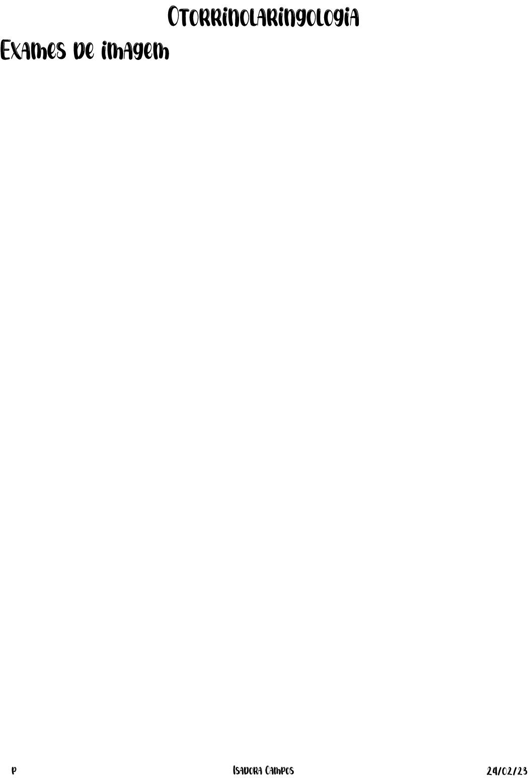 7° ➔ Exames de imagem em otologia − Principal diagnostico em otologia é a tomografia computadorizada. − TC foi desenvolvida por Godfrey Hounsfield, em 1967. Primeiro equipamento montado foi em 1971. • Lesões da orelha externa devem ser estudadas em três planos: Axial, Coronal e Sagital: fundamentais porque facilitam o estudo das alterações no teto, no assoalho e nas paredes anterior e posterior do conduto auditivo externo e a relação com a articulação temporomandibular. − Sempre administrar contraste iodado endovenoso quando se estudam tumores, otite necrotizante ou otite externa complicada com celulite e abscesso. • Lesões de orelha média estudadas com cortes axiais e coronais. − Analisando a cadeia ossicular, janelas oval e redonda, canal do nervo facial, hipotímpano, seio timpânico, ático, adito do antro, antro e as células da mastoide. − Uso de contraste iodado usado em otomastoidites complicadas e nos tumores, principalmente na avaliação do glomo timpânico e do glomo jugulotimpânico. • Lesões de orelha interna estudadas com cortes axiais e coronais e com reconstrução em diversos planos. − Quando a suspeita de otosclerose, é necessário avaliar a espessura da platina, as cruras do estribo, principalmente a anteiros, procurando sinais de fixação, e o aspecto da fissula ante fenestram. − A otospongiose retrofenestral pode mostrar grandes áreas de reabsorção óssea ou lesões focais na cóclea, principalmente na camada média da capsula ótica coclear, configurando o sinal do duplo anel. − Avaliar o formato da cóclea, do vestíbulo e dos canais semicirculares e distingir as anomalias como cavidade comum, anomalia cocleovestibular cística, displasia de canal semicircular e aplasia de cóclea, vestíbulo e canais semicirculares. ➔ Ressonância magnética − Desenvolvida nos EUA, por paul Lauterbur e Peter Mansfield. Primeiro equipamento comercial usado em 1980. − Ela mostra com sensibilidade as lesões em partes moles, não se tem detalhas anatômicos ósseos. • Orelha externa: − Lesões inflamatórias, tumorais e infiltrados partes moles adjacentes) − Otite externa por Pseudomonas aeruginosa em pacientes diabéticos, imunodeprimidos/suprimidos deve ser avaliada com gadolínio. − Os tumores que comprometem a orelha média, principalmente o glomo timpânico e o glomo jugulo timpânico → ressonância com contraste paramagnético. • Orelha interna: − Indicações são para o estudo da labirintite, na fase aguda. E para o diagnostico e classificação do schwannoma vestibular. − Labirinto, tumores (Schwanoma, ângulo pontocerebelar), vascularização (aneurismas). − Deve-se mencionar que nos pacientes com zumbido pulsátil e suspeita de alteração vascular o primeiro exame a ser realizado deve ser a ressonância magnética com Angioressonância venosa e arterial para possível diagnóstico de alterações vasculares com como dolicoectasia da artéria basilar, aneurismas e alça vascular 7° no poro acústico, geralmente proveniente da artéria cerebelar inferior anterior. ➔ Orelha externa − Microtia → difícil avaliação pelo difícil acesso ao conduto auditivo − TC é o método complementar ao exame físico. − Conduto auditivo: estenose, atresia e agenesia − Atresia: avaliar o aspecto da placa atrésica, e sua relação com a parede lateral do ático e com a cadeia ossicular. − A otite infiltra e as paetês moles do conduto auditivo externo causando uma estenose importante. − Angiorressonância venosa cerebral mostrando ausência de fluxo nos seios venosos e na veia jugular interna, à direita − Trombose venosa central por Pseudomonas aeruginosa 7° ➔ TC Mastoide axial Fratura na escama temporal (seta reta), com pneumoencéfalo (seta curva), otorragia (seta angulada) e luxação entre o martelo e a bigorna (seta fina) • Orelha média São demonstrados pelo método: luxação entre o martelo e a bigorna, fixação do martelo na parede anterior do ático, fixação do martelo e da bigorna por timpanoesclerose, displasia fibrosa nos martelos... Principais complicações das otomastoidites podem ser intratemporais ou intracranianas. TC axial Osteomas Toide + Abscesso ➔ Exame de imagem nasal Diagnostico por imagem da cavidade nasal e dos seios paranasais Radiologia → pode ser útil para avaliar rinissinusite aguda ou como exame inicial de rinossinute crônica. TC → avaliação dos seios paranasais Ressonância magnética → diferenciação entre processo inflamatório e neoplásico • Variantes anatômicas As variantes anatômicas dos seios paranasais têm uma prevalência semelhante entre os grupos de pacientes com rinossinusites e controle. TC axial e coronal da cavidade nasal, mostrando desvio do septo nasal para a esquerda, com esporão ósseo com contato mucoso − Septo nasal: tem uma porção anterior cartilaginosa e outra posterior óssea (vômer e placa perpendicular do etmoide). − Desvio do septo nasal pode ser definido como desvio da linha média, podendo ser ósseo, cartilaginoso ou osteocartilaginoso. 7° − Desvio de septo pode causar compressão dos cornetos médio e/ou inferior, prejudicando e drenagem mucosa, predispondo a processos inflamatórios. − Corneto médio: concha Bulhosa decorre da pneumatização de sua placa óssea. − Concha paradoxal: é quando os cornetos nasais têm uma curvatura com convexidade medial em direção ao septo nasal. Quando sua curvatura é oposta. − Célula de Agger Nasi: célula etmoidal mais anterior. → abaixo do frontal − Célula de Haller: célula etmoidal infraorbitaria ou uma câmara aerada na região do infundíbulo do seio maxilar, lateralmente ao processo unciforme, inferiormente a bula etmoidal e sob o assoalho orbitário, medial a lâmina papirácea. → abaixo do orbita ➔ Doenças nasossinusais − Rinossinusite aguda (RSA): TC, sem contraste, com avaliação nos três planos ortogonais com janela intermediaria e ó