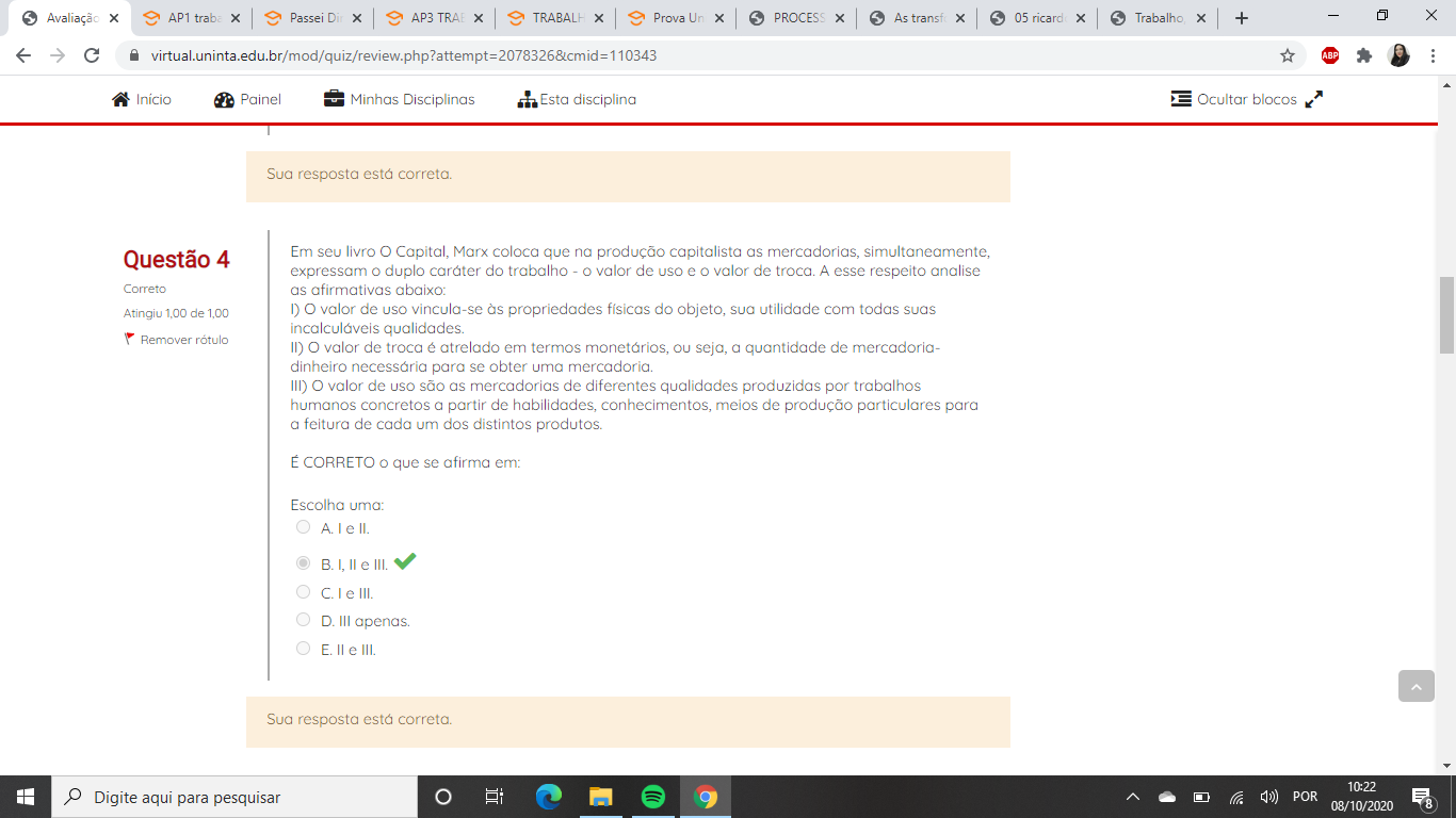 Em seu livro Marx coloca que no produção capitalisto as expressam caráter do trabalho - valor de e valor de A esse respeito analise Correto as afirmativas Atingiu de 1.00 valor de USO vincula-se às propriedades do objeto, suo utilidade com todas suas Remover rótulo II) valor de troca é atrelado em termos monetários, ou seja, a quantidade de mercadoria- dinheiro necessário para se obter III) valor de USO são as mercadorias de diferentes qualidades produzidas por trabalhos humanos concretos a partir de habilidades, conhecimentos, meios de produção particulares para a feitura de cada um dos distintos produtos. É CORRETO que se em: Escolho A. II. B. II e III. C. III. D. III E. e III.