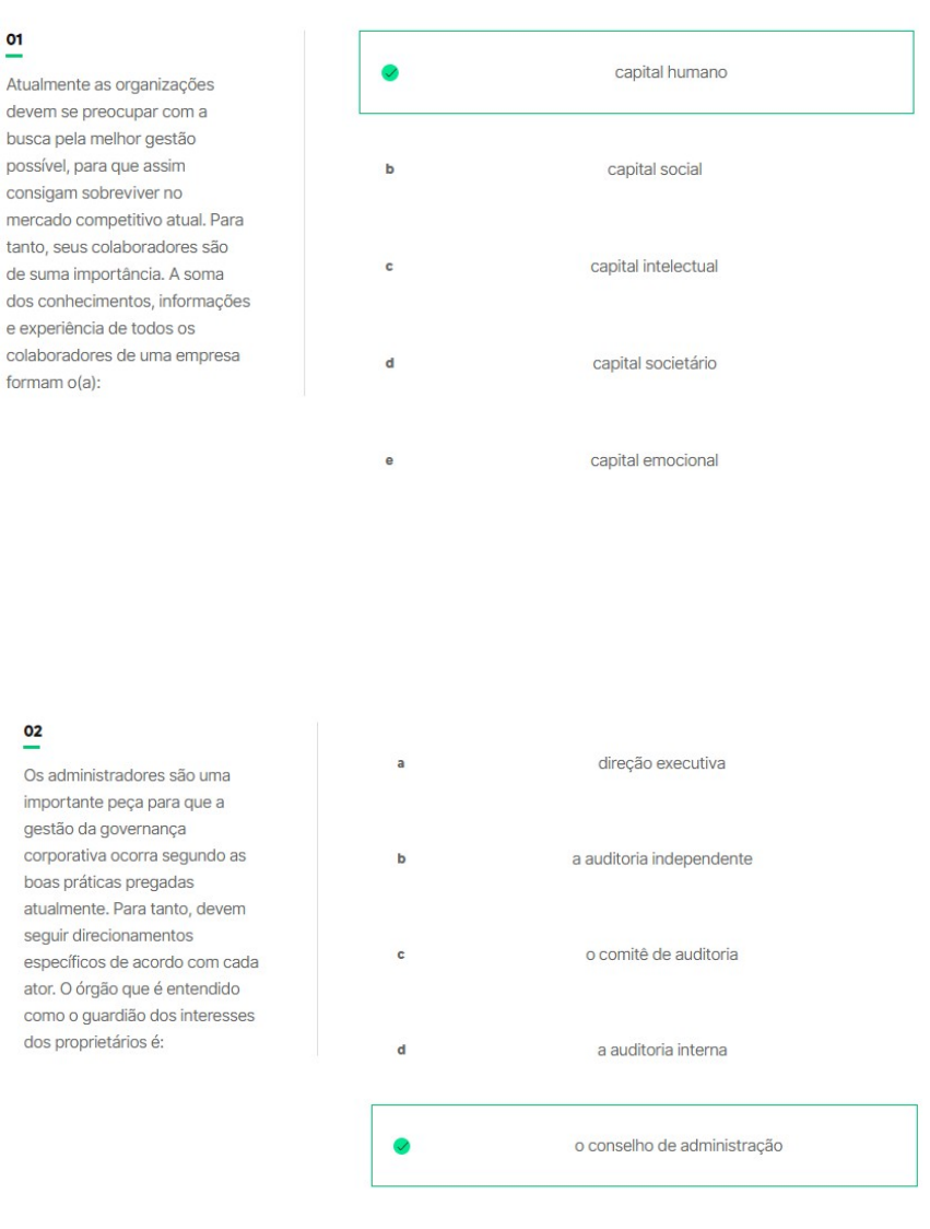 Atualmente as organizações devem se preocupar com a busca pela melhor gestão possível, para que assim consigam sobreviver no mercado competitivo atual. Para tanto, seus colaboradores são de suma importância. A soma dos conhecimentos, informações e experiência de todos os colaboradores de uma empresa formam o(a): Os administradores são uma importante peça para que a gestão da governança corporativa ocorra segundo as boas práticas pregadas atualmente. Para tanto, devem seguir direcionamentos específicos de acordo com cada ator. O órgão que é entendido como o guardião dos interesses dos proprietários é: Os administradores, ao atuarem de forma incorreta, responderão de forma civil por sua atuação incorreta. Sendo assim, devem sempre ficar atentos para seguir as regras delimitadas pelas leis e estatutos. Ao atuar de forma culposa, o administrador pode deixar de adotar as cautelas necessárias, cometendo: Os administradores devem estar sempre atentos às regras e leis que regem e organizam a sua atuação, sendo importante que sigam deveres e atribuições corretas, atuando com cuidado e probidade. A qual dever essa descrição se refere? Em regime de hierarquia, logo abaixo do Conselho de Administração, encontra-se a Diretoria Executiva. Cabe à Diretoria Executiva: Leia o trecho a seguir: “Ainda que estruturados hierarquicamente, os órgãos societários atuam de forma independente e autônoma, em obediência ao princípio da exclusividade de competências, comumente estabelecido na própria lei”. ROSSETTI, J. P.; ANDRADE, A. Governança Corporativa: fundamentos, desenvolvimento e tendências. São Paulo: Atlas, 2014. p. 135. O entendimento de quais são os atores responsáveis pela governança corporativa, bem como suas atribuições, é muito importante para a gestão. Assim, considerando as informações apresentadas e os conteúdos estudados, analise os atores disponíveis a seguir e associe-os com suas respectivas características. 1. Conselho de administração. 2. Comitê de auditoria. 3. Direção executiva. 4. Auditoria interna. ( ) É o órgão mais alto e com competência para administrar a empresa. ( ) Possui função de organizar o ambiente interno de controle. ( ) É responsável por produzir demonstrações patrimoniais e de resultados. ( ) Refere-se ao órgão que supervisiona a elaboração dos relatórios financeiros. Agora, assinale a alternativa que apresenta a sequência correta: