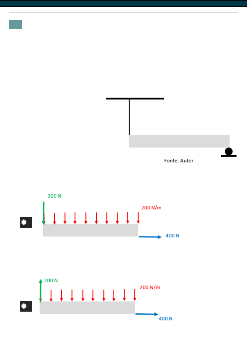 EQUILÍBRIO DOS CORPOS RÍGIDOS 1. Considere a estrutura em equilíbrio estático, conforme a figura. Suponha que a viga é homogênea de comprimento 4 m e que o seu peso é uniformemente distribuído (q = 200 N/m) ao longo de seu comprimento. A tração no fio tem módulo 200 N. O desenho que representa o diagrama do corpo livre (DCL) para a estrutura é apresentado na opção: Fonte: Autor Fonte: Autor Fonte: Autor Fonte: Autor Fonte: Autor Data Resp.: 18/04/2023 12:48:02 Explicação: A resposta correta é: 2. Em um corpo podemos estudar a ação de forças e momentos para definir o equilíbrio estático do mesmo. Para que haja equilíbrio estático, não deve haver movimentos de translação ou rotação no corpo analisado. Assinale a alternativa que representa corretamente o que ocorre quando há movimento de rotação em um corpo. ∑M≠0∑�≠0 ∑M=0∑�=0 ∑F≠0∑�≠0 ∑F=0∑�=0 e ∑M=0∑�=0 ∑F=0∑�=0 Data Resp.: 18/04/2023 12:49:57 Explicação: As forças aplicadas em um objeto podem gerar movimento de transação, quando tem resultante igual a zero elas demonstram equilíbrio, quando são diferentes de zero podem gerar ou não um momento que resulte em rotação do objeto. Dessa forma, a única opção que representa com certeza a existência do movimento de rotação é ∑M≠0∑�≠0 TRELIÇAS PLANAS 3. Calcule as reações de apoio para a treliça apresentada a seguir: Fonte: Autor Nesse caso, encontram-se os seguintes valores para as reações verticais dos nós A e H, respectivamente: 5kN e 5kN 6kN e 4kN 6,5kN e 3,5kN 3,5kN e 6,5kN 3,0 kN e 7,0 kN Data Resp.: 18/04/2023 12:51:25 Explicação: A resposta correta é: 6kN e 4kN 4. Para o projeto da estrutura de um telhado, foi utilizada a treliça da figura a seguir: Fonte: Autor A barra DE está solicitada a um esforço de compressão de: 4,50 kN 1,80 kN 5,00 kN 3,00 kN 2,40 kN Data Resp.: 18/04/2023 12:51:59 Explicação: A resposta correta é: 5,00 kN VIGAS BIAPOIADAS 5. Suponha que em uma estrutura, um dos elementos seja uma viga isostática bi apoiada cujo peso é desprezível e o vão igual a 6 m. Considere o carregamento linearmente distribuído mostrado na figura. Para a determinação dos esforços internos será necessário determinar as reações nos apoios A e B. Para tanto, será feita a substituição do carregamento distribuído por uma carga concentrada F. A intensidade e a localização de F estão corretamente expressas na opção: 1200 kN e a 2 m do apoio A. 1,2 kN e a 4 m do apoio B. 0,6 kN e a 4 m do apoio B. 600 kN e a 2 m do apoio A. 0,6 kN e a 4 m do apoio A. Data Resp.: 18/04/2023 12:52:35 Explicação: A resposta correta é: 0,6 kN e a 4 m do apoio B. 6. Existem vários softwares que na modelagem de vigas isostáticas bi apoiadas. De uma maneira geral, o output (saída) desses softwares é a determinação das reações nos apoios e dos diversos diagramas, por exemplo, DEC e DMF. Em relação ao input (entrada) que normalmente deve "alimentar" o software, não é obrigatório: A troca das cargas distribuídas pelas concentradas equivalentes. 0 tipo de apoio (primeiro, segundo e terceiro gêneros) As dimensões da viga bi apoiada. A localização dos carregamentos sobre a viga. As cargas sobre a viga, sejam cargas concentradas ou distribuídas (força ou momento). Data Resp.: 18/04/2023 12:54:00 Explicação: A resposta correta é: A troca das cargas distribuídas pelas concentradas equivalentes. PROPRIEDADES MECÂNICAS E COMPORTAMENTO DOS MATERIAIS 7. A inclinação da curva de tensão-deformação na região elástica é conhecida como: módulo de encruamento módulo de deformação módulo de elasticidade módulo de tenacidade módulo de tração Data Resp.: 18/04/2023 12:57:05 Explicação: A resposta correta é: módulo de elasticidade. TENSÃO E DEFORMAÇÃO 8. Observe a figura que mostra a montagem do braço ACD, suspenso por um mancal em C e acoplado a uma haste horizontal em A. O braço suporta uma carga de 4 kN aplicada na extremidade D. Considerando a tensão de cisalhamento admissível do material do pino no mancal C 0,5 MPa, a área da seção transversal do pino C, que sustenta a carga de 4 kN, é: 0,001 m20,001 �2 0,010 m20,010 �2 0,075 m20,075 �2 0,0025 m20,0025 �2 0,005 m20,005 �2 Data Resp.: 18/04/2023 12:58:01 Explicação: A resposta correta é: 0,005 m20,005 �2 9. Uma barra cilíndrica de aço SAE 1040 com 1,20 m de comprimento foi solicitada para tração de um sistema, resultando em um esforço de 2.355 kgf���. A tensão admissível do aço SAE 1040 para tração é 3.000 kgf/cm2���/��2. Nesse caso, considerando-se que 3,14 seja o valor aproximado de π�, o diâmetro mínimo que a barra deve ter para resistir ao esforço sem entrar em colapso é: 20 mm 5 mm 10 mm 12 mm 15 mm Data Resp.: 18/04/2023 12:58:54 Explicação: A tensão máxima admissível deve ser o resultado da carga pela área da seção transversal, logo: 3000=23553,14.r23000=23553,14.�2 Dessa forma podemos calcular o raio: r2=0,25→r=0,5cm�2=0,25→�=0,5�� ou 5mm5�� Se o raio é de 5 mm, o diâmetro é de 10 mm. CARGA AXIAL E ESTADO PLANO DE TENSÃO 10. Considere a barra de dois trechos submetida às cargas indicadas na figura a seguir. A área da seção transversal do trecho AB é 10 cm2��2 e do trecho BC é 5 cm2��2. Se o módulo de elasticidade do material da barra for 200 GPa, os valores das reações em A e C, em kN, são, respectivamente, iguais a: 20 e 30 12 e 38 15 e 35 18 e 32 10 e 40 Data Resp.: 18/04/2023 12:59:41 Explicação: A resposta correta é: 10 e 40.