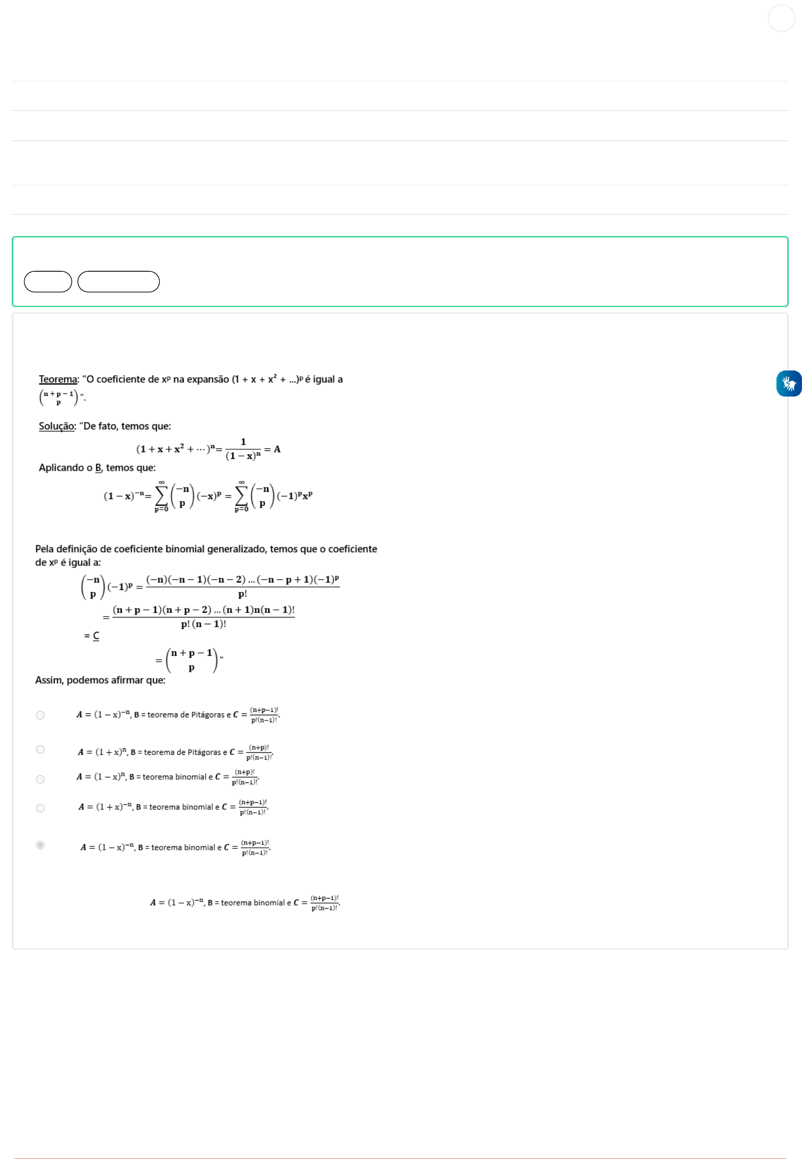 04/05/2023 00:13 Matemática Discreta: Revisão da tentativa https://ava.faculdadefocus.edu.br/mod/quiz/review.php?attempt=230905&cmid=2531 1/6 Iniciado em quarta, 19 abr 2023, 01:18 Estado Finalizada Concluída em terça, 25 abr 2023, 00:21 Tempo empregado 5 dias 23 horas Avaliar 3,0 de um máximo de 10,0(30%) Questão 1 Correto Atingiu 1,0 de 1,0 Considere o teorema a seguir e sua demonstração. a. b. c. d. e. A resposta correta é: 04/05/2023 00:13 Matemática Discreta: Revisão da tentativa https://ava.faculdadefocus.edu.br/mod/quiz/review.php?attempt=230905&cmid=2531 2/6 Questão 2 Incorreto Atingiu 0,0 de 1,0 Considere o problema a seguir e sua solução. Assim, podemos afirmar que: a. b. c. d. e. A resposta correta é: Questão 3 Incorreto Atingiu 0,0 de 1,0 Considere o teorema a seguir e sua demonstração. Assim, podemos afirmar que: a. b. c. d. e. A resposta correta é: 04/05/2023 00:13 Matemática Discreta: Revisão da tentativa https://ava.faculdadefocus.edu.br/mod/quiz/review.php?attempt=230905&cmid=2531 3/6 Questão 4 Incorreto Atingiu 0,0 de 1,0 Considere a seguinte proposição e sua demonstração. Desse modo, podemos afirmar que: a. b. c. d. e. A resposta correta é: Questão 5 Correto Atingiu 1,0 de 1,0 Considere a proposição a seguir e sua demonstração. Desse modo, podemos afirmar que: a. b. c. d. e. A resposta correta é: 04/05/2023 00:13 Matemática Discreta: Revisão da tentativa https://ava.faculdadefocus.edu.br/mod/quiz/review.php?attempt=230905&cmid=2531 4/6 Questão 6 Incorreto Atingiu 0,0 de 1,0 A diferença entre dois conjuntos A e B é o conjunto formado pelos elementos que estão em A e não estão em B. Considere as seguintes afirmações sobre a diferença de conjuntos: É correto o que se afirma em: a. II e IV. b. I e III. c. I e II. d. III e IV. e. I e IV. A resposta correta é: I e IV. Questão 7 Correto Atingiu 1,0 de 1,0 As placas dos carros no Brasil eram formadas por uma sequência de sete dígitos, em que os três primeiros eram letras do alfabeto e os quatro últimos eram números. Foi necessário alterar o padrão das placas dos carros, pois estávamos chegando na capacidade máxima de confecções de placas com esse padrão. Quantas placas diferentes podemos produzir com o padrão descrito anteriormente? a. Não é possível determinar esse número. b. 260.000.000. c. 170.000.000. d. 175.760.000. e. Podemos produzir infinitas placas. A resposta correta é: 175.760.000. 04/05/2023 00:13 Matemática Discreta: Revisão da tentativa https://ava.faculdadefocus.edu.br/mod/quiz/review.php?attempt=230905&cmid=2531 5/6 Questão 8 Incorreto Atingiu 0,0 de 1,0 Considere a proposição a seguir e sua demonstração. O método de demonstração utilizado foi: a. demonstração por indução. b. demonstração direta. c. demonstração por contraposição. d. demonstração por contradição. e. demonstração por absurdo. A resposta correta é: demonstração por contraposição. Questão 9 Incorreto Atingiu 0,0 de 1,0 É correto afirmar que: a. I não é verdadeira, mas III é uma afirmação verdadeira. b. I é verdadeira e II e III são justificativas corretas para I. c. I é verdadeira e II não é uma justificativa correta para I. d. I não é verdadeira, II é uma justificativa correta para I e III é falsa. e. I é verdadeira, II não é uma justificativa correta para I e III é falsa. A resposta correta é: I é verdadeira e II e III são justificativas corretas para I. 04/05/2023 00:13 Matemática Discreta: Revisão da tentativa https://ava.faculdadefocus.edu.br/mod/quiz/review.php?attempt=230905&cmid=2531 6/6 Questão 10 Incorreto Atingiu 0,0 de 1,0 É correto o que se afirma em: a. I e III. b. II e IV. c. II e III. d. III e IV. e. I e IV. A resposta correta é: I e III. Terminar revisão Acesso as Videoaulas Seguir para... Livro - Matemática Financeira https://ava.faculdadefocus.edu.br/mod/quiz/view.php?id=2531 https://ava.faculdadefocus.edu.br/mod/page/view.php?id=2529&forceview=1 https://ava.faculdadefocus.edu.br/mod/url/view.php?id=2533&forceview=1