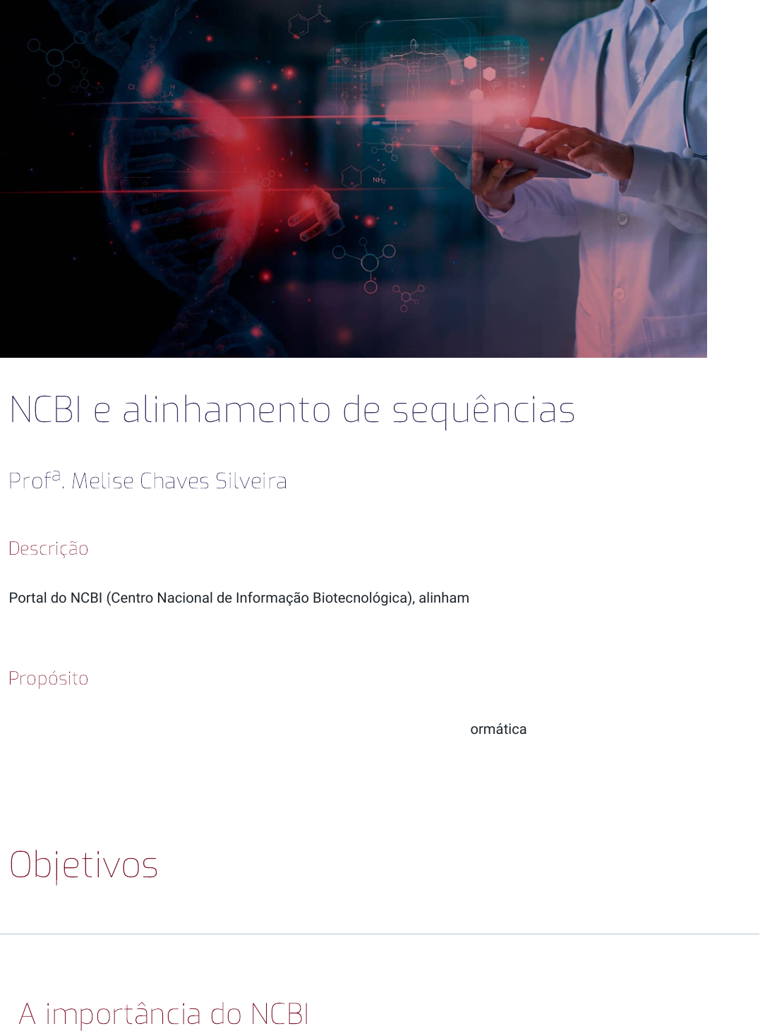 NCBI e alinhamento de sequências Profa. Melise Chaves Silveira Descrição Portal do NCBI (Centro Nacional de Informação Biotecnológica), alinhamentos de sequências biológicas e desenho de primers. Propósito O conhecimento das plataformas e ferramentas mais utilizadas na bioinformática é essencial para acompanhar a constante evolução da ciência, que reflete em diferentes formas de obtenção e análises de dados biológicos para o desenvolvimento de novos testes diagnósticos e metodologias científicas. Objetivos Módulo 1 A importância do NCBI Reconhecer a importância do NCBI para as ciências biomédicas. Módulo 2 Alinhamentos de sequências Distinguir os tipos de alinhamentos de sequências biológicas disponíveis. Módulo 3 Os Primers Aplicar o conhecimento sobre primers no desenho dessas sequências utilizando programas de computador. A tecnologia está presente o tempo inteiro na nossa vida pessoal, como, por exemplo, os smartphones ou aparelhos de televisão cada vez mais modernos. A sua vida profissional também não pode negar todas as vantagens, facilidades e desafios que as novas tecnologias trazem. Ao longo deste conteúdo, discutiremos como são armazenados dados biológicos que são produzidos a partir de equipamentos modernos, como os sequenciadores de DNA. Além disso, você vai aprender a usar ferramentas computacionais que permitem gerar informações e trazer conhecimento a partir dessas sequências. Ao final deste conteúdo, termos como NCBI, alinhamento de sequência e desenho de primers serão agregados ao seu repertório acadêmico e estarão bem claros para você. Introdução 1 - A Importância do NCBI Ao �nal deste módulo, você será capaz de reconhecer a importância do NCBI para as ciências biomédicas. NCBI (National Center for Biotechnology Information) Um dos marcos históricos mais importantes da bioinformática foi a realização do Projeto Genoma Humano, com o objetivo de identificar a sequência de nucleotídeos que compõe os 46 cromossomos humanos. Ao final desse projeto, que durou de 1990 a 2001, a bioinformática ganhou um grande impulso. Logo surgiram tecnologias para o sequenciamento de DNA capazes de determinar a ordem de nucleotídeos de genomas inteiros, de forma mais rápida e barata. Ilustração de sequenciamento genético. Até o final da década de 1990, os arquivos de sequência de ácidos nucleicos continham cerca de 4 bilhões de nucleotídeos, que correspondem a pouco mais de um único genoma humano. No final dos anos 2000, esse número já era maior que 100 bilhões. Mas onde está guardada toda essa quantidade de sequências de nucleotídeos? Funções e aplicações do NCBI Sequências de nucleotídeos e aminoácidos, estruturas tridimensionais de proteínas e vias metabólicas são exemplos de dados biológicos. A bioinformática utiliza bancos de dados para armazenar e organizar o grande volume de dados gerados a partir da prática biomédica. Isso permite que quando alguém precise de um determinado dado biológico, ele possa ser recuperado facilmente. Muitos desses bancos de dados podem ser acessados por qualquer pessoa, de qualquer lugar do mundo, utilizando a rede mundial de computadores (World Wide Web). O NCBI (National Center for Biotechnology Information), Centro Nacional para Informação Biotecnológica, é uma organização sediada nos Estados Unidos da América que controla o portal mais famoso da bioinformática, cujo acesso é feito pelo endereço ncbi.nlm.nih.gov. Dentro desse portal estão disponíveis diferentes bancos de dados biológicos e ferramentas para analisá-los. O NCBI se propõe a reunir o resultado do trabalho de pesquisadores ao redor do mundo em um só lugar, facilitando o acesso e manipulação desses registros. Essa iniciativa impulsiona o avanço do conhecimento na área biotecnológica. Sede do NCBI em Bethesda, Maryland, EUA. Imagine que você está estudando uma cepa de bactéria resistente a todos os antibióticos disponíveis e decidiu sequenciar o genoma desse organismo para descobrir quais genes são responsáveis por essa característica. Com a sequência em mãos, você pode enviá-la para os responsáveis pelo NCBI e, então, seu trabalho se juntará a milhões de outras sequências em um banco de dados de sequências nucleotídicas. Se um pesquisador, em qualquer lugar do mundo, quiser saber a ordem dos nucleotídeos no cromossomo da “sua” bactéria, é só ele usar ferramentas de busca disponíveis no portal do NCBI, fazer o download dessa sequência para o seu computador e estudá-la. Agora, vamos aprender sobre exemplos reais de bancos e ferramentas disponíveis pelo portal do NCBI. PubMed É um banco de dados de informações sobre literatura biomédica com acesso parcialmente livre. Nesse banco, encontramos artigos científicos publicados em milhares de revistas científicas diferentes, principalmente aquelas que publicam em inglês, o “idioma universal da ciência”. Atenção É importante ressaltar que, para algumas revistas, é possível acessar livremente apenas o resumo dos artigos. Nesses casos, é necessário pagar uma “assinatura” para conseguir o acesso completo, o que é normalmente feito por instituições de pesquisa. Existe também a possibilidade de pagamento apenas do artigo de interesse, caso você realmente precise ler o conteúdo e sua instituição não tenha a assinatura de determinada revista científica. Quando estiver desenvolvendo seu trabalho de conclusão de curso (TCC), após a escolha do tema, você vai começar a buscar artigos científicos sobre ele. Uma forma de encontrar essa literatura é acessar o PubMed pelo portal do NCBI e buscar por palavras-chave. Imagine que sua busca resulte em 100 artigos. Mas como funciona esse processo? Nesse número estão incluídos os artigos de acesso livre e os de acesso restrito. É possível, então, “filtrar” a busca apenas por artigos que você consiga ler inteiros. Nesse cas
