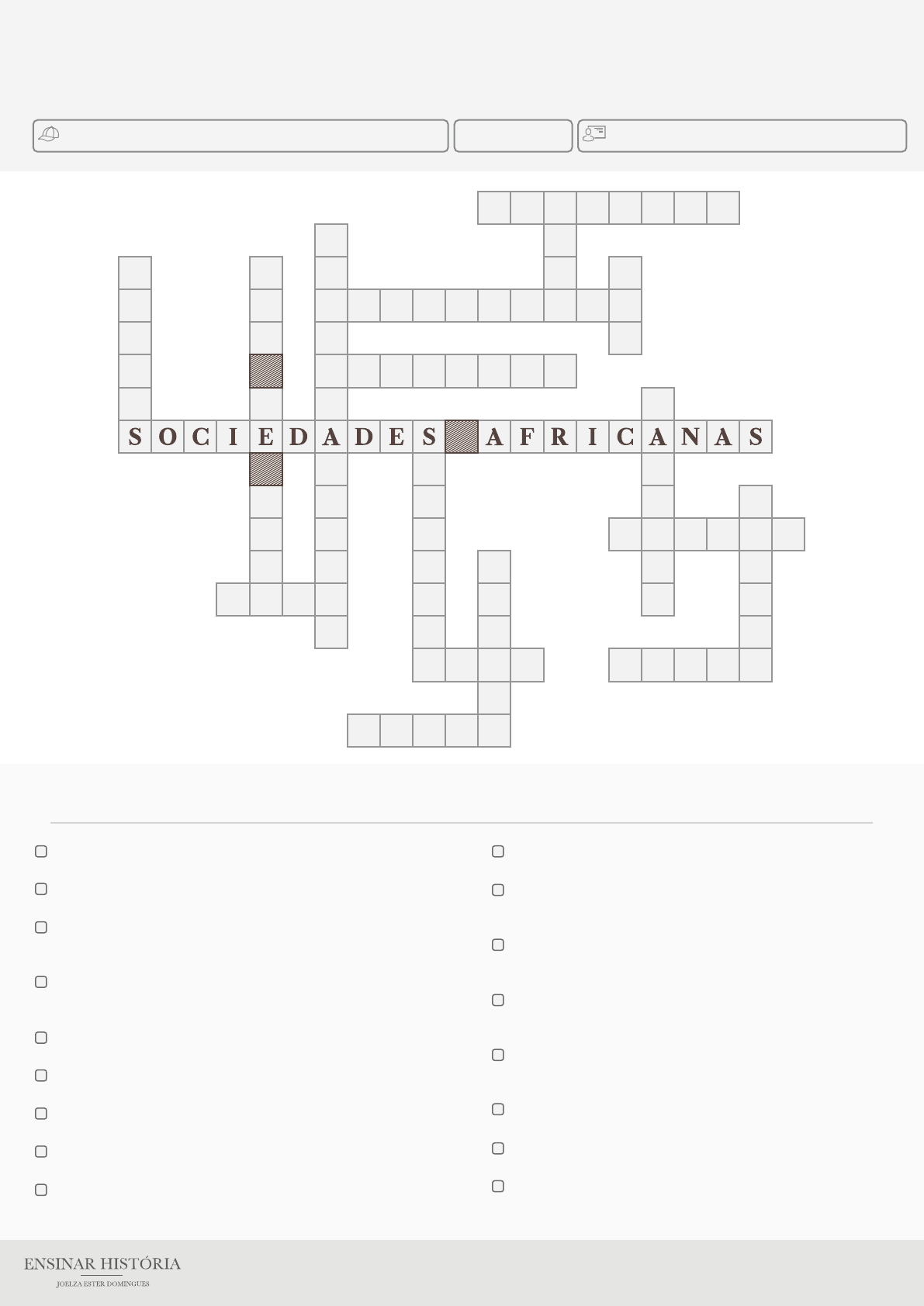 www.ensinarhistoriajoelza.com.br SOCIEDADES AFRICANAS ANTES DA CHEGADA DOS EUROPEUS Resolva a cruzadinha Professor (a)AnoAluno (a) 1. Músicos e contadores de histórias, na África Ocidental, responsáveis pela transmissão das tradições orais. 2. Reino africano nascido na região da atual Etiópia, o primeiro do mundo a adotar o cristianismo como religião o�cial. 3. Conhecido como o “reino do ouro” pela abundância desse minério que era negociado com nômades em troca de ferro, cobre, tecidos, cavalos e sal. 4. Mineral raro no território africano e indispensável para os animais e os seres humanos e que movimentou economias, enriqueceu reis e provocou guerras. 5. Povo que, no século VII, apoderou-se do reino de Gana e o transformou na principal potência econômica e militar da África ocidental. 6. Dinastia muçulmana proveniente do norte da África que invadiu o reino de Gana e foi responsável pelo declínio deste reino. 7. Reino que sucedeu a Gana incorporando e estendendo seu território e cujos reis tinham o título de “mansa”. 8. Herói do povo mandinga, considerado fundador do reino de Mali, apelidado de “Príncipe Leão”. 9. Um dos grandes centros intelectuais e comerciais de Mali que ligava o reino ao norte da África e ao mar Mediterrâneo. 10. Império que sucedeu Mali e cujos governantes, apesar de muçulmanos, preservaram aspectos da religião tradicional. 11. Rotas percorridas por comerciantes tuaregues que conduzindo caravanas de camelos atravessavam o Saara levando mercadorias. 12. Fruto muito consumido pelas sociedades da África Ocidental, e cujo extrato foi utilizado no século XIX para a fabricação de um famoso refrigerante. 13. Universidade em Tombuctu que prosperou sob o reino Mali e Songai chegando a reunir cerca de 25 mil estudantes vindos do Egito, Marrocos, Andaluzia (Espanha). 14. Povos diversos, mas com uma língua comum que ocuparam todo centro e sul do continente africano e no século XIII formaram o Reino do Congo. 15. Etnia originária dos atuais territórios da Nigéria e do Benin, famosa pela habilidade na metalurgia. 16. Palavra iorubana para chamar a entidade sobrenatural ou a força da natureza que guia e protege os seres humanos. 17. Nome pelo qual os iorubas eram conhecidos no Brasil. 1 2 3 4 5 6 7 8 9 10 11 12 13 14 15 16 17 www.ensinarhistoriajoelza.com.br SOCIEDADES AFRICANAS ANTES DA CHEGADA DOS EUROPEUS Resolva a cruzadinha Professor (a)AnoAluno (a) 1. Músicos e contadores de histórias, na África Ocidental, responsáveis pela transmissão das tradições orais. 2. Reino africano nascido na região da atual Etiópia, o primeiro do mundo a adotar o cristianismo como religião o�cial. 3. Conhecido como o “reino do ouro” pela abundância desse minério que era negociado com nômades em troca de ferro, cobre, tecidos, cavalos e sal. 4. Mineral raro no território africano e indispensável para os animais e os seres humanos e que movimentou economias, enriqueceu reis e provocou guerras. 5. Povo que, no século VII, apoderou-se do reino de Gana e o transformou na principal potência econômica e militar da África ocidental. 6. Dinastia muçulmana proveniente do norte da África que invadiu o reino de Gana e foi responsável pelo declínio deste reino. 7. Reino que sucedeu a Gana incorporando e estendendo seu território e cujos reis tinham o título de “mansa”. 8. Herói do povo mandinga, considerado fundador do reino de Mali, apelidado de “Príncipe Leão”. 9. Um dos grandes centros intelectuais e comerciais de Mali que ligava o reino ao norte da África e ao mar Mediterrâneo. 10. Império que sucedeu Mali e cujos governantes, apesar de muçulmanos, preservaram aspectos da religião tradicional. 11. Rotas percorridas por comerciantes tuaregues que conduzindo caravanas de camelos atravessavam o Saara levando mercadorias. 12. Fruto muito consumido pelas sociedades da África Ocidental, e cujo extrato foi utilizado no século XIX para a fabricação de um famoso refrigerante. 13. Universidade em Tombuctu que prosperou sob o reino Mali e Songai chegando a reunir cerca de 25 mil estudantes vindos do Egito, Marrocos, Andaluzia (Espanha). 14. Povos diversos, mas com uma língua comum que ocuparam todo centro e sul do continente africano e no século XIII formaram o Reino do Congo. 15. Etnia originária dos atuais territórios da Nigéria e do Benin, famosa pela habilidade na metalurgia. 16. Palavra iorubana para chamar a entidade sobrenatural ou a força da natureza que guia e protege os seres humanos. 17. Nome pelo qual os iorubas eram conhecidos no Brasil. 1 2 3 4 5 6 7 8 9 10 11 12 13 14 15 16 17