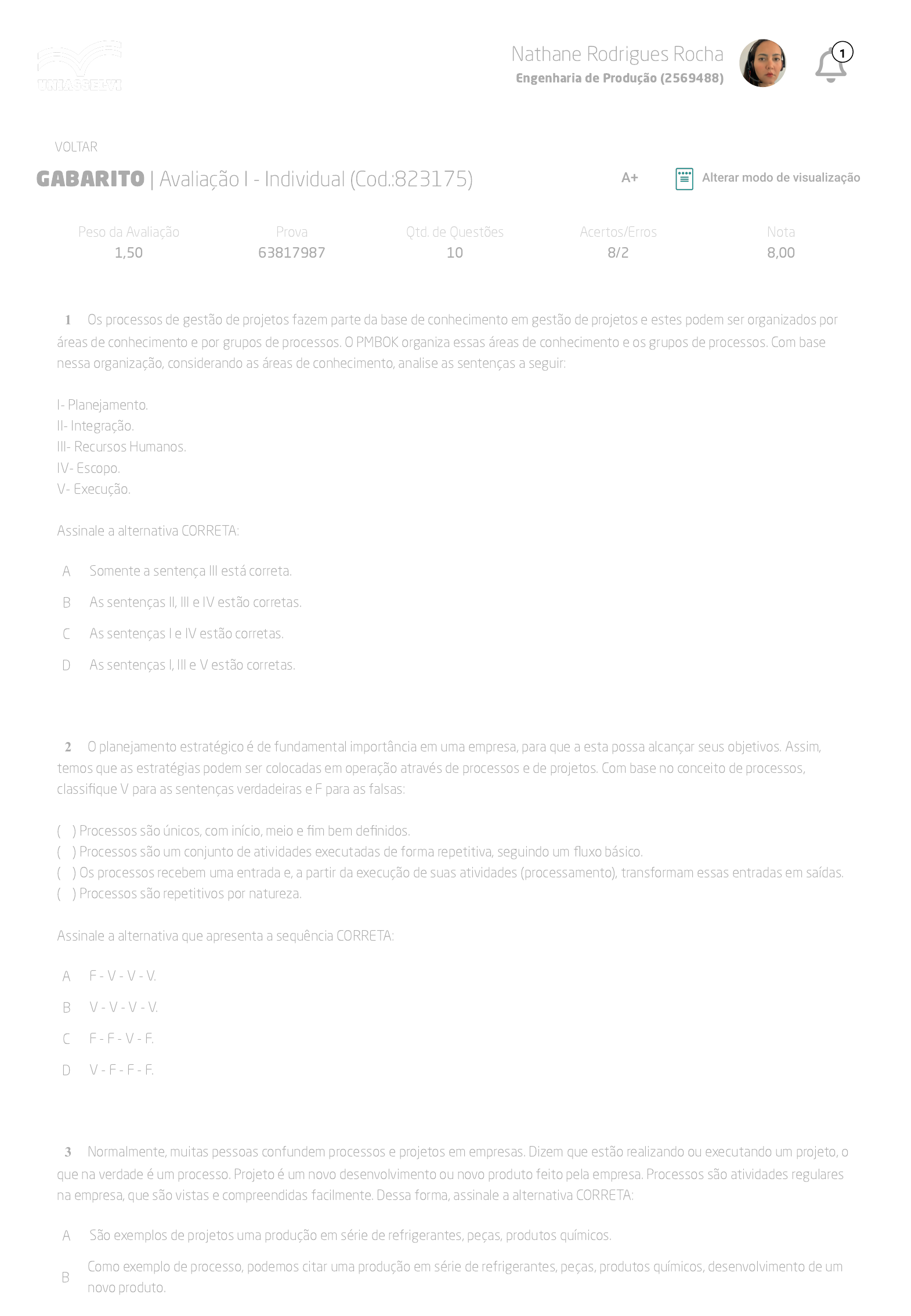 GABARITO | Avaliação I - Individual (Cod.:823175) Peso da Avaliação 1,50 Prova 63817987 Qtd. de Questões 10 Acertos/Erros 8/2 Nota 8,00 Os processos de gestão de projetos fazem parte da base de conhecimento em gestão de projetos e estes podem ser organizados por áreas de conhecimento e por grupos de processos. O PMBOK organiza essas áreas de conhecimento e os grupos de processos. Com base nessa organização, considerando as áreas de conhecimento, analise as sentenças a seguir: I- Planejamento. II- Integração. III- Recursos Humanos. IV- Escopo. V- Execução. Assinale a alternativa CORRETA: A Somente a sentença III está correta. B As sentenças II, III e IV estão corretas. C As sentenças I e IV estão corretas. D As sentenças I, III e V estão corretas. O planejamento estratégico é de fundamental importância em uma empresa, para que a esta possa alcançar seus objetivos. Assim, temos que as estratégias podem ser colocadas em operação através de processos e de projetos. Com base no conceito de processos, classifique V para as sentenças verdadeiras e F para as falsas: ( ) Processos são únicos, com início, meio e fim bem definidos. ( ) Processos são um conjunto de atividades executadas de forma repetitiva, seguindo um fluxo básico. ( ) Os processos recebem uma entrada e, a partir da execução de suas atividades (processamento), transformam essas entradas em saídas. ( ) Processos são repetitivos por natureza. Assinale a alternativa que apresenta a sequência CORRETA: A F - V - V - V. B V - V - V - V. C F - F - V - F. D V - F - F - F. Normalmente, muitas pessoas confundem processos e projetos em empresas. Dizem que estão realizando ou executando um projeto, o que na verdade é um processo. Projeto é um novo desenvolvimento ou novo produto feito pela empresa. Processos são atividades regulares na empresa, que são vistas e compreendidas facilmente. Dessa forma, assinale a alternativa CORRETA: A São exemplos de projetos uma produção em série de refrigerantes, peças, produtos químicos. B Como exemplo de processo, podemos citar uma produção em série de refrigerantes, peças, produtos químicos, desenvolvimento de um novo produto. VOLTAR A+ Alterar modo de visualização 1 2 3 Nathane Rodrigues Rocha Engenharia de Produção (2569488) 1 C Como exemplo de projeto, pode-se dizer de uma indústria automobilística que está desenvolvendo um carro novo; do contrário, se já está em linha de produção, dizemos que é um processo. D Como exemplo de processo, podemos dizer de uma indústria automobilística que está desenvolvendo um carro novo, do contrário se já está em linha de produção, dizemos que é um projeto. Em gestão da produção, cada tipo de manufatura demanda a organização das atividades das operações com características diferentes de volume e variedade. Há um tipo de processo que lida com produtos discretos, geralmente muito customizados, sendo o período de tempo para executar o serviço normalmente longo, com baixo volume de produção e alta variedade. Como esse processo é denominado? A Produção em massa. B Bateladas. C Projeto. D Jobbing. Os principais benefícios da execução do gerenciamento de projetos nas organizações são: (1) transformar o conhecimento básico em uma linguagem comum, (2) definição de processos, (3) utilização da padronização através de uma única metodologia de desenvolvimento e (4) utilizar métodos de controles para melhoria contínua. Portanto, para Kerzner (2006, p. 15), gestão de projetos pode ser definida como o planejamento, a programação e o controle de uma série de tarefas integradas de forma a atingir seus objetivos com êxito, para benefício de todos os participantes do projeto. Com relação às características da gestão de projetos, associe os itens utilizando o código a seguir: I- O projeto possui metas e objetivos facilmente entendidos. II- O projeto pode ser protegido do mercado ou de outras flutuações que afetam operações rotineiras. III- O projeto pode ser descrito claramente em poucos termos: seus objetivos, escopo, limitações, recursos, administração, qualidade de resultados e assim por diante. IV- O andamento do projeto pode ser mensurado por meio de sua comparação com metas e padrões definidos de desempenho. ( ) Simplicidade de propósito. ( ) Clareza de propósito e escopo. ( ) Controle independente. ( ) Facilidade de medição. Assinale a alternativa que apresenta a sequência CORRETA: FONTE: KERZNER, Harold. Gestão de Projetos: as melhores práticas. 2. ed. Porto Alegre: Artmed, 2006. A I - IV - III - II. B IV - III - II - I. C I - III - II - IV. D II - IV - III - I. Em gestão de projetos, temos o PMBOK (Project Management Body of Knowledge), que ajuda com que os gerentes de projetos possam falar a mesma linguagem. Esse PMBOK apresenta áreas de conhecimento e os grupos de processos, identificados dentro de gestão de projetos. Dentro desse contexto, associe os itens, utilizando o código a seguir: I- Grupo de processos de execução. II- Grupo de processos de controle. III- Grupo de processos de planejamento. IV- Grupo de processos de encerramento. ( ) É o responsável pela comparação dos parâmetros de planejamento pelos parâmetros executados. ( ) Assim como na iniciação, são executados apenas uma vez durante o projeto. 4 5 6 Nathane Rodrigues Rocha Engenharia de Produção (2569488) 1 ( ) É neste grupo de processos que os pacotes de trabalho são executados pelas pessoas designadas. ( ) É o grupo de processos que apresenta o maior número de processos. Assinale a alternativa que apresenta a sequência CORRETA: A II - IV - I - III. B II - IV - III - I. C I - II - III - IV. D I - II - IV - III. Ao se analisar as estruturas organizacionais, é possível observa que elas foram desenhadas para atender a processos que são fundamentais para o sucesso da empresa, também denominados processos críticos. No que diz respeito às estruturas or