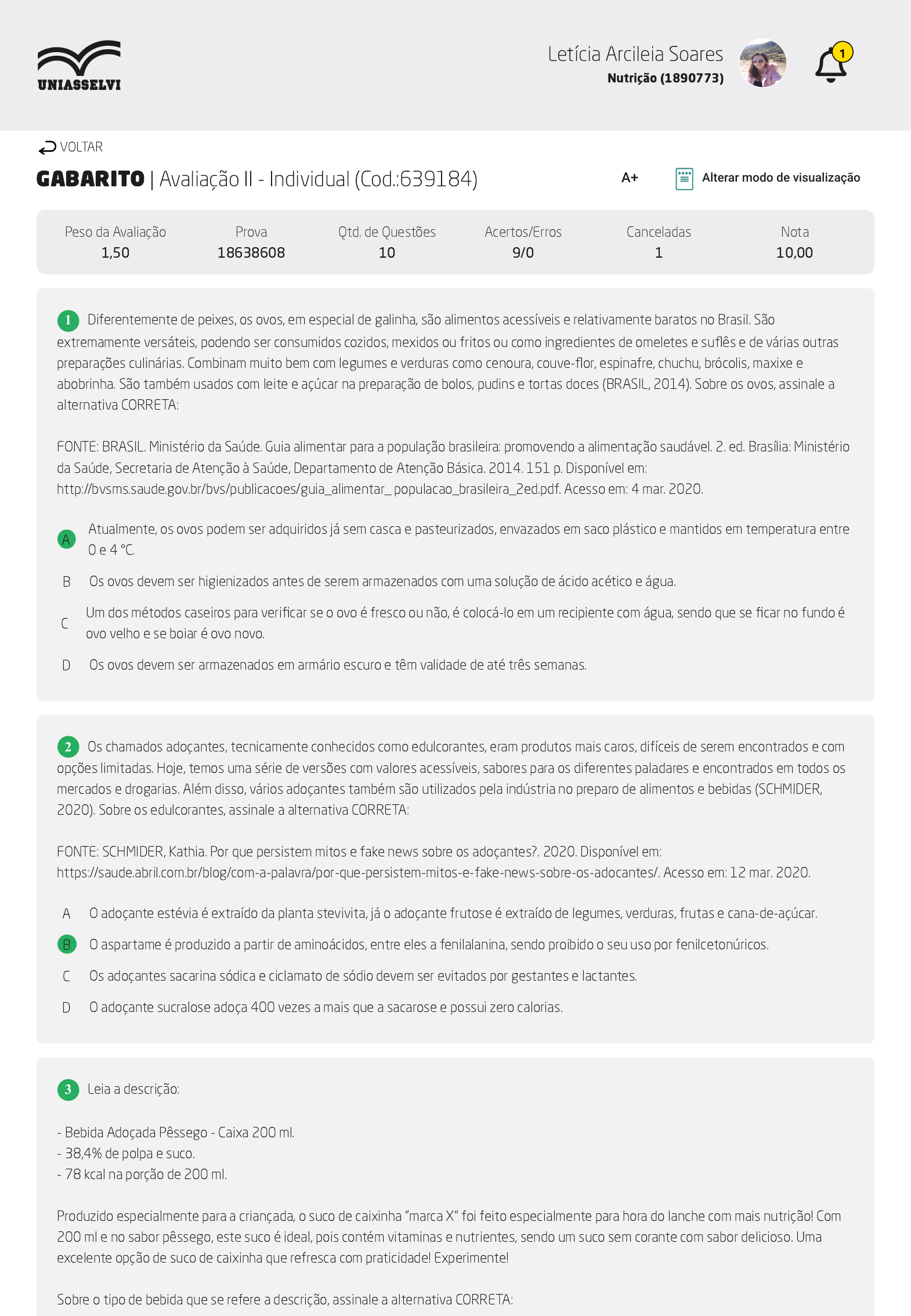 05/05/2023, 12:27 AVA https://ava2.uniasselvi.com.br/subject/grades-and-tests/answer-book/eyJ0ZXN0Ijp7InRlc3RDb2RlIjoiNjM5MTg0IiwiZGVzY3JpcHRpb24iOiJBdmFsaWHDp8OjbyBJSSAtIEluZGl2aWR1YWwiLCJwYXJhbWV0ZXIiOjU0… 1/4 GABARITO | Avaliação II - Individual (Cod.:639184) Peso da Avaliação 1,50 Prova 18638608 Qtd. de Questões 10 Acertos/Erros 9/0 Canceladas 1 Nota 10,00 Diferentemente de peixes, os ovos, em especial de galinha, são alimentos acessíveis e relativamente baratos no Brasil. São extremamente versáteis, podendo ser consumidos cozidos, mexidos ou fritos ou como ingredientes de omeletes e suflês e de várias outras preparações culinárias. Combinam muito bem com legumes e verduras como cenoura, couve-flor, espinafre, chuchu, brócolis, maxixe e abobrinha. São também usados com leite e açúcar na preparação de bolos, pudins e tortas doces (BRASIL, 2014). Sobre os ovos, assinale a alternativa CORRETA: FONTE: BRASIL. Ministério da Saúde. Guia alimentar para a população brasileira: promovendo a alimentação saudável. 2. ed. Brasília: Ministério da Saúde, Secretaria de Atenção à Saúde, Departamento de Atenção Básica. 2014. 151 p. Disponível em: http://bvsms.saude.gov.br/bvs/publicacoes/guia_alimentar_ populacao_brasileira_2ed.pdf. Acesso em: 4 mar. 2020. A Atualmente, os ovos podem ser adquiridos já sem casca e pasteurizados, envazados em saco plástico e mantidos em temperatura entre 0 e 4 °C. B Os ovos devem ser higienizados antes de serem armazenados com uma solução de ácido acético e água. C Um dos métodos caseiros para verificar se o ovo é fresco ou não, é colocá-lo em um recipiente com água, sendo que se ficar no fundo é ovo velho e se boiar é ovo novo. D Os ovos devem ser armazenados em armário escuro e têm validade de até três semanas. Os chamados adoçantes, tecnicamente conhecidos como edulcorantes, eram produtos mais caros, difíceis de serem encontrados e com opções limitadas. Hoje, temos uma série de versões com valores acessíveis, sabores para os diferentes paladares e encontrados em todos os mercados e drogarias. Além disso, vários adoçantes também são utilizados pela indústria no preparo de alimentos e bebidas (SCHMIDER, 2020). Sobre os edulcorantes, assinale a alternativa CORRETA: FONTE: SCHMIDER, Kathia. Por que persistem mitos e fake news sobre os adoçantes?. 2020. Disponível em: https://saude.abril.com.br/blog/com-a-palavra/por-que-persistem-mitos-e-fake-news-sobre-os-adocantes/. Acesso em: 12 mar. 2020. A O adoçante estévia é extraído da planta stevivita, já o adoçante frutose é extraído de legumes, verduras, frutas e cana-de-açúcar. B O aspartame é produzido a partir de aminoácidos, entre eles a fenilalanina, sendo proibido o seu uso por fenilcetonúricos. C Os adoçantes sacarina sódica e ciclamato de sódio devem ser evitados por gestantes e lactantes. D O adoçante sucralose adoça 400 vezes a mais que a sacarose e possui zero calorias. Leia a descrição: - Bebida Adoçada Pêssego - Caixa 200 ml. - 38,4% de polpa e suco. - 78 kcal na porção de 200 ml. Produzido especialmente para a criançada, o suco de caixinha "marca X" foi feito especialmente para hora do lanche com mais nutrição! Com 200 ml e no sabor pêssego, este suco é ideal, pois contém vitaminas e nutrientes, sendo um suco sem corante com sabor delicioso. Uma excelente opção de suco de caixinha que refresca com praticidade! Experimente! Sobre o tipo de bebida que se refere a descrição, assinale a alternativa CORRETA: VOLTAR A+ Alterar modo de visualização 1 2 3 Letícia Arcileia Soares Nutrição (1890773) 1 05/05/2023, 12:27 AVA https://ava2.uniasselvi.com.br/subject/grades-and-tests/answer-book/eyJ0ZXN0Ijp7InRlc3RDb2RlIjoiNjM5MTg0IiwiZGVzY3JpcHRpb24iOiJBdmFsaWHDp8OjbyBJSSAtIEluZGl2aWR1YWwiLCJwYXJhbWV0ZXIiOjU0… 2/4 A Néctar. B Refrigerante. C Refresco. D Suco integral. Conforme o Guia Alimentar para a População Brasileira (BRASIL, 2014), as carnes vermelhas são excelentes fontes de proteína de alta qualidade e têm teor elevado de muitos micronutrientes, especialmente ferro, zinco e vitamina B12. No entanto, tendem a ser ricas em gorduras em geral e, em especial, em gorduras saturadas, que, quando consumidas em excesso, aumentam o risco de doenças do coração e de várias outras doenças crônicas. Além disso, há evidências convincentes de que o consumo excessivo de carnes vermelhas pode aumentar o risco de câncer de intestino. No pré-preparo de carnes, muitas vezes são necessárias ações para amaciar a carne. Considerando o exposto, classifique V para as sentenças verdadeiras e F para as falsas: ( ) Podem ser utilizadas quatro tipos de ações: enzimática, química, mecânica e biológica. ( ) No dia a dia das famílias brasileiras é comum o uso do batedor de carne ou batedor de bife que é considerada uma ação mecânica para o amaciamento de carnes. ( ) As carnes consideradas mais duras ou com menor teor de gordura não devem ser colocadas em tempero de vinagre ou vinho, pois o meio ácido enrijece as fibras da carne. ( ) O uso de enzimas naturais como a papaína e a bromelina podem ser utilizadas no preparo de carnes para pessoas idosas e com dificuldade na mastigação. Assinale a alternativa que apresenta a sequência CORRETA: FONTE: BRASIL. Ministério da Saúde. Guia alimentar para a população brasileira: promovendo a alimentação saudável. 2. ed. Brasília: Ministério da Saúde, Secretaria de Atenção à Saúde, Departamento de Atenção Básica. 2014. 151 p. Disponível em: http://bvsms.saude.gov.br/bvs/publicacoes/guia_alimentar_ populacao_brasileira_2ed.pdf. Acesso em: 4 mar. 2020. A F - V - F - V. B V - F - V - F. C V - V - F - F. D V - F - F - V. Temperos, especiarias, ervas aromáticas e essências são amplamente utilizadas nos preparos de pratos. Inicialmente eram utilizados somente com o objetivo de melhorar e realçar o sabor, hoje, o uso de especiarias é recomendado p