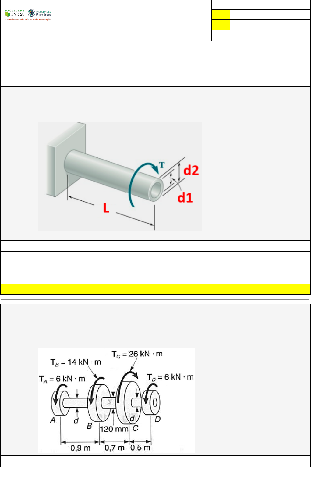 Pincel Atômico - 05/05/2023 15:39:09 1/3 CLEITON SALES OLIVEIRA SOUZA Avaliação Online (SALA EAD) Atividade finalizada em 02/05/2023 15:24:27 (876958 / 1) LEGENDA Resposta correta na questão # Resposta correta - Questão Anulada X Resposta selecionada pelo Aluno Disciplina: MECÂNICA DOS SÓLIDOS I [240516] - Avaliação com 5 questões, com o peso total de 15,00 pontos [capítulos - 4,5,6] Turma: Graduação: ENGENHARIA DE PRODUÇÃO - Grupo: AGOSTO/2021 - EP/AGO/21 [24494] Aluno(a): 91240623 - CLEITON SALES OLIVEIRA SOUZA - Respondeu 4 questões corretas, obtendo um total de 12,00 pontos como nota [361742_184583] Questão 001 Um eixo circular vazado de aço cilíndrico tem comprimento L = 2 m e diâmetros interno e externo iguais a 30 e 50 mm, respectivamente. Qual eÌ• o maior torque que pode ser aplicado ao eixo circular, sabendo que a tensão de cisalhamento não deve exceder 110 MPa? Autor (2019) T= 4,35 kN.m T= 5,35 kN.m T= 8,35 kN.m T= 6,35 kN.m X T= 2,35 kN.m [361742_185134] Questão 002 .(Adaptada de BEER, 1995). O eixo circular BC é vazado, e tem diâmetros de 90 mm e 120 mm, respectivamente interno externo. Os eixos AB e CD são maciços, com diâmetro d. Determinar, para o carregamento indicado: (a) o valor máximo e o valor mínimo da tensão de cisalhamento no eixo BC (b) qual o diâmetro necessário nos eixos AB e CD se a tensão admissível no material é 65 MPa. (a) τmáx=0,862 MPa; τmín=68,MPa (b) d=25,6 mm Pincel Atômico - 05/05/2023 15:39:09 2/3 (a) τmáx=3,67 MPa; τmín=68,MPa (b) d=25,6 mm (a) τmáx=36,7 MPa; τmín=64,MPa (b) d=25,6 mm X (a) τmáx=86,2 MPa; τmín=64,MPa (b) d=77,8 mm (a) τmáx=8,62 MPa; τmín=68,MPa (b) d=7,78 mm [361742_185150] Questão 003 (Adaptada de BEER, 1995). Um tubo circular com um diâmetro externo de 80 mm e um diâmetro interno de 60 mm está submetido a um torque T=4,0 kNm conforme a figura abaixo. O tubo é feito de uma liga de alumínio 7075-T6. Determine a tensão de cisalhamento máxima atuante no tubo. τmáx=58,2 MPa τmáx=5,82 MPa τmáx=582,6 MPa τmáx=32,4 GPa τmáx=37,8 GPa τmáx=582,6 MPa τmáx=5,82 MPa X τmáx=58,2 MPa τmáx=37,8 GPa τmáx=32,4 GPa [361743_184620] Questão 004 Para a viga e o carregamento mostrados na figura a seguir, projete a seção transversal da viga, sabendo que o tipo da madeira utilizada tem uma tensão normal admissível de 12 MPa. Autor (2021) X h = 31 mm Pincel Atômico - 05/05/2023 15:39:09 3/3 h = 61 mm h = 361 mm h = 1 mm h = 36 mm [361744_184601] Questão 005 Na figura abaixo, temos uma junta de dupla superposição em aço. Considerando que os elementos são finos e que a porca não está muito apertada, podemos desprezar o atrito entre os elementos. Sendo os elementos finos podemos desprezar também o momento criado pela força F. Neste caso, a qual tipo de tensão a área da seção transversal do parafuso e a superfície de fixação entre os elementos estão principalmente sendo solicitadas? Autor (2019) Pressão axial. X Tensão de cisalhamento duplo. Tensão normal. As estruturas listadas não estão sendo submetidas a nenhum tipo de tensão. Tensão de compressão.