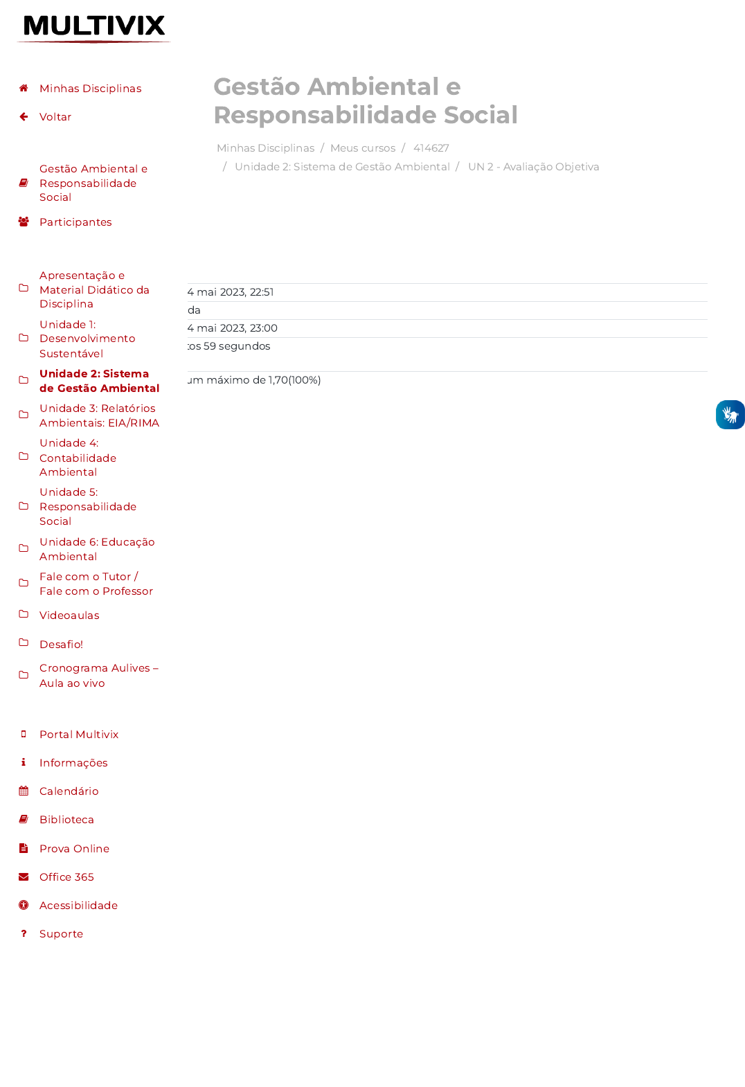 04/05/2023, 23:00 UN 2 - Avaliação Objetiva: Revisão da tentativa https://avap.multivix.edu.br/mod/quiz/review.php?attempt=2902911&cmid=1305869 1/6 Minhas Disciplinas / Meus cursos / 414627 / Unidade 2: Sistema de Gestão Ambiental / UN 2 - Avaliação Objetiva Gestão Ambiental e Responsabilidade Social Iniciado em quinta, 4 mai 2023, 22:51 Estado Finalizada Concluída em quinta, 4 mai 2023, 23:00 Tempo empregado 8 minutos 59 segundos Avaliar 1,70 de um máximo de 1,70(100%) Minhas Disciplinas Voltar Gestão Ambiental e Responsabilidade Social Participantes Apresentação e Material Didático da Disciplina Unidade 1: Desenvolvimento Sustentável Unidade 2: Sistema de Gestão Ambiental Unidade 3: Relatórios Ambientais: EIA/RIMA Unidade 4: Contabilidade Ambiental Unidade 5: Responsabilidade Social Unidade 6: Educação Ambiental Fale com o Tutor / Fale com o Professor Videoaulas Desafio! Cronograma Aulives – Aula ao vivo Portal Multivix Informações Calendário Biblioteca Prova Online Office 365 Acessibilidade Suporte https://avap.multivix.edu.br/my/ https://avap.multivix.edu.br/course/view.php?id=20119 https://avap.multivix.edu.br/course/view.php?id=20119§ion=3 https://avap.multivix.edu.br/mod/quiz/view.php?id=1305869 https://avap.multivix.edu.br/my/ https://avap.multivix.edu.br/course/view.php?id=20119 https://avap.multivix.edu.br/user/index.php?id=20119 https://avap.multivix.edu.br/course/view.php?id=20119§ion=1 https://avap.multivix.edu.br/course/view.php?id=20119§ion=2 https://avap.multivix.edu.br/course/view.php?id=20119§ion=3 https://avap.multivix.edu.br/course/view.php?id=20119§ion=4 https://avap.multivix.edu.br/course/view.php?id=20119§ion=5 https://avap.multivix.edu.br/course/view.php?id=20119§ion=6 https://avap.multivix.edu.br/course/view.php?id=20119§ion=7 https://avap.multivix.edu.br/course/view.php?id=20119§ion=8 https://avap.multivix.edu.br/course/view.php?id=20119§ion=9 https://avap.multivix.edu.br/course/view.php?id=20119§ion=10 https://avap.multivix.edu.br/course/view.php?id=20119§ion=11 https://avap.multivix.edu.br/hooks/portal/ https://avap.multivix.edu.br/mod/page/view.php?id=1252%2F%22%20target%3D%22_blank https://avap.multivix.edu.br/calendar/view.php/ https://avap.multivix.edu.br/local/staticpage/view.php?page=biblioteca https://portalweb.multivix.edu.br/gabaritos/login.aspx https://multivix.edu.br/office-365/ https://multivix.edu.br/acessibilidade/ https://avap.multivix.edu.br/mod/page/view.php?id=7%2F%22%20target%3D%22_blank https://avap.multivix.edu.br/ 04/05/2023, 23:00 UN 2 - Avaliação Objetiva: Revisão da tentativa https://avap.multivix.edu.br/mod/quiz/review.php?attempt=2902911&cmid=1305869 2/6 Questão 1 Correto Atingiu 0,34 de 0,34 Considere o texto a seguir: Conforme Dias (2017), a norma ISO 14001 é a ferramenta de gestão mais difundida no mundo, com mais de 250.000 organizações que a aplica em 167 países. Após 11 anos decorridos da última revisão foi lançada a última versão, a ISO 14001:2015, que estabelece normas para a implantação de um Sistema de Gestão Ambiental (SGA). A certi�cação dessa norma ajuda a prevenir os impactos ambientais utilizando métodos adequados para evitá-los, reduzi-los ou controlá-los. Entre suas vantagens estão a de transmitir o compromisso assumido pela organização de forma direta e crível, viabilizar benefícios econômicos por meio da otimização do consumo de energia, de matérias-primas e de água e pela melhoria dos processos, também reduz os riscos legais de recebimento de multas (DIAS, 2017). A norma ISO 14001:2015 objetiva: I. Apoiar a proteção ao meio ambiente e a prevenção da poluição em equilíbrio com as necessidades socioeconômicas; II. Possibilitar às empresas a implantação e continuação do atendimento das exigências legais e da sua política para o meio ambiente em seus potenciais impactos signi�cativos. III. In�uenciar nas decisões do Estado na resolução de problemas ambientais dos pontos de vista local, regional e nacional. É correto o que se a�rma em: Escolha uma opção: Escolha uma opção: a. III, apenas. b. II e III, apenas. c. I, II e III. d. I e II, apenas. e. I, apenas. Minhas Disciplinas Voltar Gestão Ambiental e Responsabilidade Social Participantes Apresentação e Material Didático da Disciplina Unidade 1: Desenvolvimento Sustentável Unidade 2: Sistema de Gestão Ambiental Unidade 3: Relatórios Ambientais: EIA/RIMA Unidade 4: Contabilidade Ambiental Unidade 5: Responsabilidade Social Unidade 6: Educação Ambiental Fale com o Tutor / Fale com o Professor Videoaulas Desafio! Cronograma Aulives – Aula ao vivo Portal Multivix Informações Calendário Biblioteca Prova Online Office 365 Acessibilidade Suporte https://avap.multivix.edu.br/my/ https://avap.multivix.edu.br/course/view.php?id=20119 https://avap.multivix.edu.br/user/index.php?id=20119 https://avap.multivix.edu.br/course/view.php?id=20119§ion=1 https://avap.multivix.edu.br/course/view.php?id=20119§ion=2 https://avap.multivix.edu.br/course/view.php?id=20119§ion=3 https://avap.multivix.edu.br/course/view.php?id=20119§ion=4 https://avap.multivix.edu.br/course/view.php?id=20119§ion=5 https://avap.multivix.edu.br/course/view.php?id=20119§ion=6 https://avap.multivix.edu.br/course/view.php?id=20119§ion=7 https://avap.multivix.edu.br/course/view.php?id=20119§ion=8 https://avap.multivix.edu.br/course/view.php?id=20119§ion=9 https://avap.multivix.edu.br/course/view.php?id=20119§ion=10 https://avap.multivix.edu.br/course/view.php?id=20119§ion=11 https://avap.multivix.edu.br/hooks/portal/ https://avap.multivix.edu.br/mod/page/view.php?id=1252%2F%22%20target%3D%22_blank https://avap.multivix.edu.br/calendar/view.php/ https://avap.multivix.edu.br/local/staticpage/view.php?page=biblioteca https://portalweb.multivix.edu.br/gabaritos/login.aspx https://multivix.edu.br/office-365/ https://multivix.edu.br/acessibilidade/ https://avap.multivix.edu.br/mod/page/view.php?id=7%2F