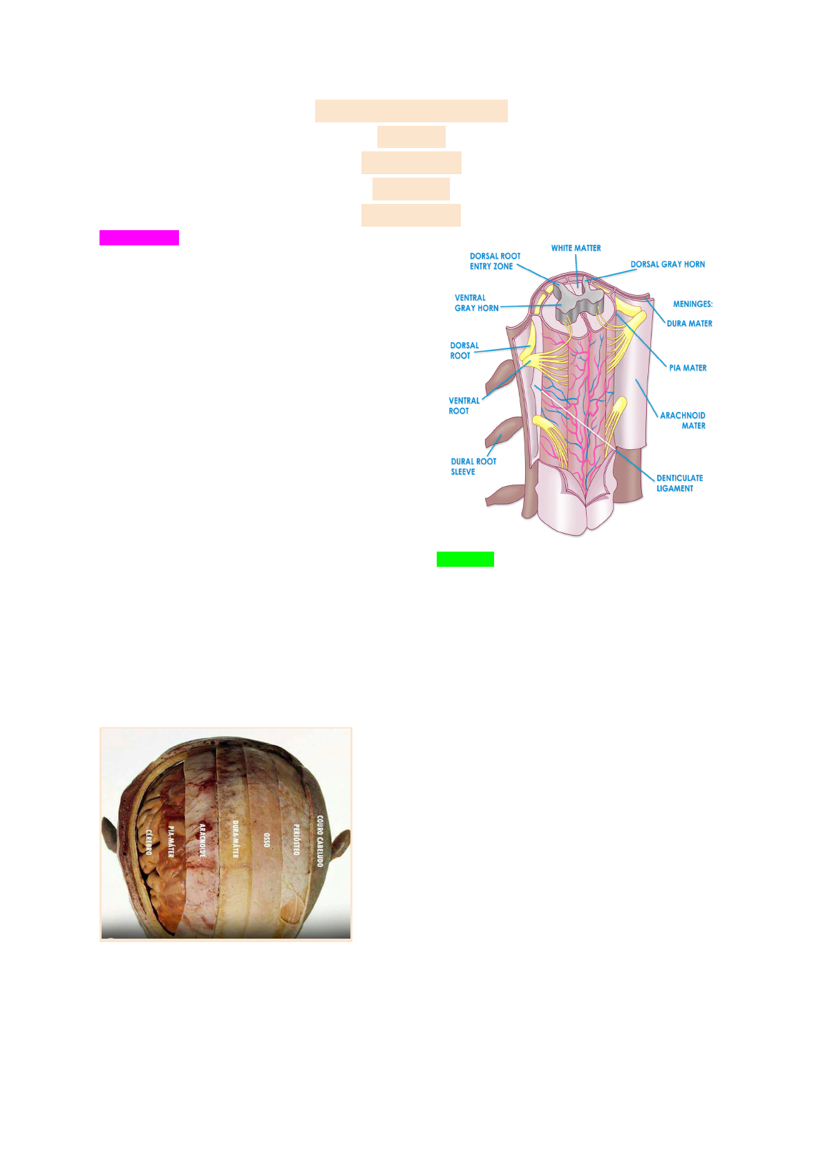 Resumo de Saúde integral do adulto I Luana simões Ciclo 2 - 5 Período Clínica médica Professor: Josué, Meningites meninges são as membranas do tecido conjuntivo que vão proteger o sistema nervoso. temos tres meninges: •Dura-máter; se insere na estrutura óssea e faz a função como se fosse um periósteo na camada interna •Aracnoide; abaixo da aracnóide tem um único espaço verdadeiro que é o espaço subaracnóide e preenchido por líquor → líquido Cefalorraquidiano e abaixo desse líquido temos a pia-máter •Pia-máter; meninge que vai se aderir aos tecidos neural → recobre o cérebro, medula e cerebelo. Em condições patológicas - no crânio pode surgir dois novos espaço → espaço epidural (em cima da dura máter) e subdural (abaixo da dura máter) (esses espaços existem na medula e não no interior do crânio) As meninges estão no encefalo e cobrindo a medula. LÍQUOR •Ultrafiltrado de sangue: NaCl, glóbulos brancos e hormônios; líquido produzido pelo plexo coróide se localiza nos ventrículos encefálicos •Atua na nutrição, remoção de eliminação dos metabólitos (ser o sistema linfático do cérebro que não existe) e proteção contra impactos; •Produzido pelos plexos coróides dos ventrículos III, lateral e IV ventrículo; •Circula no espaço subaracnóideo, sendo absorvido pelas vilosidades aracnóides e nos seios da dura-máter: •O controle da produção e da sua absorção preserva a PIC; MENINGITE •Meningoencefalite x meningite; •Infecção das membranas que protegem o SNC, levando a inflamação local, aumento da Pressão Intracraniana e sintomas sistêmicos; •Rápida evolução e alta mortalidade mesmo fazendo o tratamento adequadamente; abrupto e evolui para sua gravidade •Assépticas (não é causada por microrganismos) x sépticas causadas por microrganismos - bactérias, vírus, fungos e parasitas; EPIDEMIOLOGIA •Infrequente em países desenvolvidos; evolução vacinal caiu •Brasil: redução de casos após imunização para agentes causadores no calendário vacinal: •Meningo C (Meningococo); •Pneumo 10 (Pneumococo); •Pentavalente (H. influenza tipo B) •Risco mais elevado em extremos de idade: < 5 anos (pacientes jovens - menos de 5 anos que não tem o sistema imune completamente formado) e > 60 anos (queda natural do sistema imune); •1,2 milhão casos/ano; ETIOLOGIA Meningite asséptica •Rara, infrequente., menor gravidade; •Causas: •Tumores; efeito de pressão, resposta inflamatória •Traumas sem porta de entrada, processo inflamatório → lesão, meningite •Vasculites; afeta a vascularização das meninges •LES: lúpus eritematoso sistêmico atacar membranas de tecido conjuntivo •Fármacos: sulfametoxazol-trimetoprim, ciprofloxacino, cefalexina, metronidazol, penicilina, isoniazida, AINES; MENINGITE BACTERIANA •Colonização do espaço subaracnóide e disseminação bacteriana na meninge; •Resulta em sintomas sistêmicos e elevação da Pressão Intracraniana; •Via de contaminação: vias aéreas superior - sinusite, otite, tonsilite •Secundária a IVAS = infeccão de via aerea superior (90%); •Secundária a trauma, contiguidade (sem passar pela via sanguínea) e outras portas de entrada (10%); IMPORTANTEEEE O QUADRO EM ROSA! 0-3 meses ** slide errado FISIOPATOLOGIA •Porta de entrada: vias aéreas respiratórias superior → vascularizada como contaminação? por gotículas (pessoas assintomáticas e sintomáticas → atinge a próxima pessoa e quando invade a mucosa e proliferam e gera o quadro de IVAS e posteriormente elas ganham corrente sanguínea ), aerosol e saliva •Acesso à circulação sanguínea pela mucosa (corrente sanguínea→ bactérias capsuladas)--> vai até o plexo coroide → o corpo não consegue se defender dessas bactérias não? escapa do sistema autoimune=> cápsula polissacarídea impede a fagocitose => colonização de do plexo coróide e acesso ao liquor; toda capsula revestida de açúcares → consegue escapar facilmente desses sistemas autoimune → consegue viajar na corrente sanguinea e chegar no plexo coroide → atua como filtro e consegue alcançar o liquor •Líquor (é um otimo meio de cultura →tem glicose- baixa quantidade de proteinas e baixa quantidade de celulas de defesa) longo consegue se proliferar livremente. possui poucas defesas, sendo adequado para proliferação bacteriana; Consegue disseminar no liquor e nas meninges, os leucocitos que estão nesse liquor que embora seja pouco começam a produzir pequena estrago •Resposta imune do hospedeiro gerado pela infecção liquórica é causa de maior parte de síntomas: TNF-a e interleucina 1B (substâncias quimiotáticas)--> que atraem as células, aumento de leucócitos (produzem anticorpos) => leucocitose e aumento de proteínas no líquor; •Citocinas e Espécies Reativas de Oxigênios (ERO’s) → radicais livres geram => morte celular (dano na celula) e alteração da permeabilidade da barreira hematoencefálica (edema vasogênico); → impede que substâncias do plasma penetrem de forma livre ao encéfalo → quebra da barreira hematoencefálica → tem a passagem do líquido do plasma para encefalo e ele vai depositar do interstício → edema vasogênico •Exsudato obstrui fluxo de líquor => hidrocefalia obstrutiva => edema intersticial; •Menor fluxo sanguíneo resulta em isquemia cerebral e edema citotóxico; •Edema vasogênico, intersticial e citogênico => aumento da PIC; Resposta Imune → Desregulação vascular → a vasculatura do cérebro é muito precisa e regulada → processo inflamatório temos alteração das substâncias produzidas temos desregulamentei vascular → inicialmente o cérebro vai receber um hiperfluxo e o fluxo do cérebro vai cair → hipofluxo baixa de oxigênio e gera uma ISQUEMIA → a falta de oxigênio a célula não consegue produzir, não gera ATP e nao ativa a bomba de Na + e K+, o sódio eleva no interior da célula se