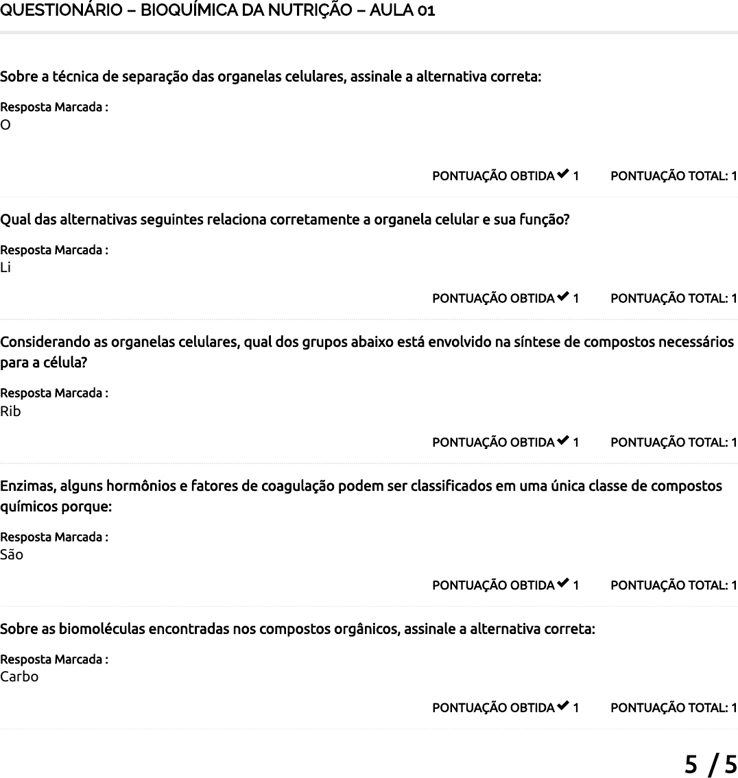 04/05/2023 21:07 Course Status – AVA Saúde Unifaveni https://ava.saude.unifaveni.com.br/course-status/ 1/1 5 / 5 QUESTIONÁRIO – BIOQUÍMICA DA NUTRIÇÃO – AULA 01 PONTUAÇÃO TOTAL: 1PONTUAÇÃO OBTIDA 1 Sobre a técnica de separação das organelas celulares, assinale a alternativa correta: Resposta Marcada : Os passos envolvidos na separação de organelas celulares são, em ordem: lise celular para rompimento da membrana, centrifugação para separação das frações celulares, lavagens para puri�cação. PONTUAÇÃO TOTAL: 1PONTUAÇÃO OBTIDA 1 Qual das alternativas seguintes relaciona corretamente a organela celular e sua função? Resposta Marcada : Lisossomo – degradação celular PONTUAÇÃO TOTAL: 1PONTUAÇÃO OBTIDA 1 Considerando as organelas celulares, qual dos grupos abaixo está envolvido na síntese de compostos necessários para a célula? Resposta Marcada : Ribossomo, retículo endoplasmático rugoso, retículo endoplasmático liso PONTUAÇÃO TOTAL: 1PONTUAÇÃO OBTIDA 1 Enzimas, alguns hormônios e fatores de coagulação podem ser classi�cados em uma única classe de compostos químicos porque: Resposta Marcada : São formados por cadeias de aminoácidos. PONTUAÇÃO TOTAL: 1PONTUAÇÃO OBTIDA 1 Sobre as biomoléculas encontradas nos compostos orgânicos, assinale a alternativa correta: Resposta Marcada : Carboidratos são cadeias de açúcares ligados entre si por ligações glicosídicas. Total de Pontos