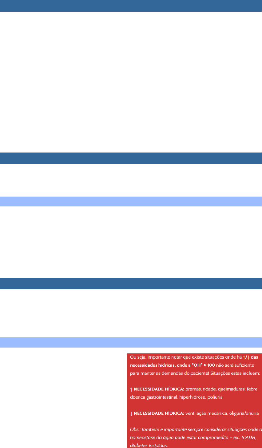 Fluidoterapia pediátrica PLUS Plasma lite, ringer lactato, ringer ou soro fisiológico Reidratação para desidratação grau B: 50-100 ml/kg oral Choque: 20ml/kg a cada 20 min Desidratação grave 25ml/kg/hora – 2 horas 1. Vias de acesso · Acesso central (jugular interna, subclávia) (até 4 semanas) · Periférico (basílica, antecubital, cefálica, safena) (3-4 dias) · Intraósseo (realizado na parta plana da tíbia (6 horas) OBS Principais indicações de intra-ossea: choque hipotensivo em P5, PCR, mal convulsivo com depressão respiratória Objetivo Manutenção da homeostase corporal nos pacientes em jejum Oferece quantidade adequada de água e eletrólitos para as perdas fisiológicas (diurese, suor, respiração) Principais componentes Soro Eletrólitos (sódio, potássio, magnésio) Soro glicosado OBS: nutrição da criança com jejum >5-7 dias deve ser enteral ou parenteral (soro de manutenção não nutre) Componentes Agua Eletrólitos (Na, K..) Glicose – glicosado 5 a 10% Demanda e Peso calórico Fórmula Holliday e Segar (estima demanda hídrica pelo gasto energético) 0 a 10kg = 100ml/kg/dia 10 a 20kg = 1000ml + 50ml para cada kg acima de 10 20 a 40/80kg = 1500ml + 20ml para cada kg acima de 20 Superfície corpórea = 4p + 7) / (p + 90) EX: 25kg 1500 + 20.5 = 1600 ml/dia Peso calórico (PC): quantas 100kcl necessitamos para manter 100ml de H2O em 24h Basicamente a taxa hídrica/100. EX: criança de 25 quilos: · Taxa hídrica = 1500ml + 5x20 =1600 ml · Peso calórico = 16kg Fórmula prática do PC Até 10kg – PC = peso corporal 10-20kg – PC = 10 + 0,5 x Restante >20 -40/80 – PC = 15 + 0,2 x Restante E LEMBRAR: Taxa hídrica = PC x 100 (operação inversa) Sódio A necessidade média de crianças é de 2-4 mEq para cada 100ml de H2O. Como o peso calórico = Taxa hídrica (H2O necessário/dia) / 100 Na = 2-4 mEq x PC EX: Na = 3; peso = 10kg · TxH: 100 x 10 = 1000ml · PC: 1000/100 = 10 · Na = 3x10 = 30 mEq Atenção à soluções hipotônicas causando hiponatremia, tendo preferido isotônicas (136 mEq/L de sódio) Potássio A necessidade média de crianças é de 2-3 mEq para cada 100ml de H2O (geralmente 2,5 mEq) Como PC = TxH /100 K = 2-3 mEq x PC Paciente anúrico é contraindicação absoluta para reposição de potássio (lembrar que excreção é renal) EX: K = 2,5 mEq/100ml; peso = 10kg · TxH: 100 x 10kg = 1000ml/dia · PC = 1000/100 = 10kg · K = 2,5 mEq / 10kg = 25 mEq/dia Glicose e TIG Evita hipoglicemia, mas não nutre Geralmente é soro glicosado 5% TIG: taxa de infusão de glicose (constante determinada) Necessidade diária de glicose (g/dia) = TIG x PC x 1,44 · VIG é a velocidade de mg por kg por min VIG = mg/kg/min de glicose infundida Soro 5% = 5g de glicose para cada 100ml de solução Se o paciente está em infusão de 1000ml/dia (paciente com 10kg) de soro 5%, será infundido 50g de glicose em 24h. a VIG é em mg!!! 50.000 mg em 24h para criança com 10kg. LOGO, 50.000 / 10kg = 5000 mg/kg de glicose em 24h 24h = 1440 minutos. Então 5000 em 1440 min = VIG = 3,47 mg/kg/min Prescrição A base da prescrição se baseia nos principais elementos do soro de manutenção (ao lado) Mg e Ca é prescrito apenas após dosagem de nível sérico Vamos utilizar um exemplo de 20kg TxH: 1500 mL/dia (3x 500ml de 8/8h) em BIC = 500/8 = 62,5 ml/h de SG 5% PC: 15kg Na: 136 mEq/L. logo 136-1000ml, x –500 = 68mEq de Na na solução para ficar isotônica (professor usa mEq) Usando solução de NaCl 20% (3,4 mEq Na/ml) 3,4 –1 68 – x = 20 ml de NaCl 20% K: 2,5 mEq x PC/dia. Paciente precisa de 15x2,5 = 37,5 mEq de K Usando a solução de KCl 19,1% 2,5Meq – 1ml ..... 37,5 ---- x = 15 ml de KCl 19,1%/dia. Note que para o K, a quantidade de solução é igual ao PC No fim, a prescrição fica dessa forma. OBS: BIC = volume/h gotas/min = volume/3xhoras Regra prática Ou para cada 500 ml de SG 5%, 20ml NaCl (20%) e 5 kCL (19,1%) Isso porque é como se estivesse fazendo com peso de 5kg (facilita, pois o soro glicosado geralmente é 500ml já) Para solução hipotônica Para cada 500ml de SG 5%, 4,6 NaCl e 5 KcL OBS: solução hipotônica tem menos concentração do que a sérica (<135 mEq/L) EXTRA Ca = 0,5 a 1 MEq x PC/dia gluconato de Ca 10% - 1ml = 0,5 mEq Mg 0,5 a 1 mEq x PC/dia MgSO4 50% - 1ml = 4 mEq Esse resumo não utiliza a TIG nos exemplos, então utilizaremos a TIG nos abaixo TIG é a taxa necessária de glicose O cálculo da TIG mensura quanto de soro utilizaremos. Lembrando que podemos utilizar soro 25% ou 50% e retirar 50 a 100ml se não chega na TIG esperada com o soro 5% Se ao final, faltar até 30ml de solução total, pode completar com SG 5% para almejar a taxa hídrica TxH: 1000 + 4x50 = 1200ml PC = 12Kg TIG = 4 x 12 x 1,44 = 69,1 g de glicose/dia Na: 2 x 12 = 24 mEq/dia NaCl 20% - 3,4 mEq – 1 ml .... 24 – x = 7ml K: 2 x 12 = 24 mEq/dia KCl 19,1% - 2,5 mEq – 1 ml ..... 24 – x = 9,6 ml Soro glicosado 5% 5g-100ml ......... x – 1200ml = 60 g. Falta 9g SE VAMOS RETIRAR 50ML, TEMOS QUE CALCULAR A QUANTIDADE DE GLICOSE EM 1150 NOVAMENTE Acertando com SG 50% 5g – 100ml ----- 9 – x = 18ml SG 5% --------- 1165 ml TOTAL = 1184,6 ml + 15,4 ml de SG 5% SG 50% ------- 18ml NaCl 20% ----- 7 ml KCl 19,1% ---- 9,6 ml Dividido em 3 soros de 500ml SG 5% ------------- 388 ml SG 50% ---------- 6 ml NaCl 20% ------- 2,3 ml KCl 19,1% ------ 3,2 ml Infusão IV em BIC 50ml/h de 8/8h por dia Regra prática 100 x 4 x 1 TIG 69 SG 5%1200ml x NaCL 20% 48ml x KCl 19,1% 4ml SE VAMOS RETIRAR 100ML, TEMOS QUE CALCULAR A QUANTIDADE DE GLICOSE EM 1100 NOVAMENTE TESTAR com soro a 5%, para ver quantos ml para bater a meta de glicose 25g – 100ml ---- 9g – x = 36 1122 ml SG 5% 374 36 ml SG 25% 12 48ml NaCl 20% 16 4ml KCl 19,1% 1,3 ml 1188