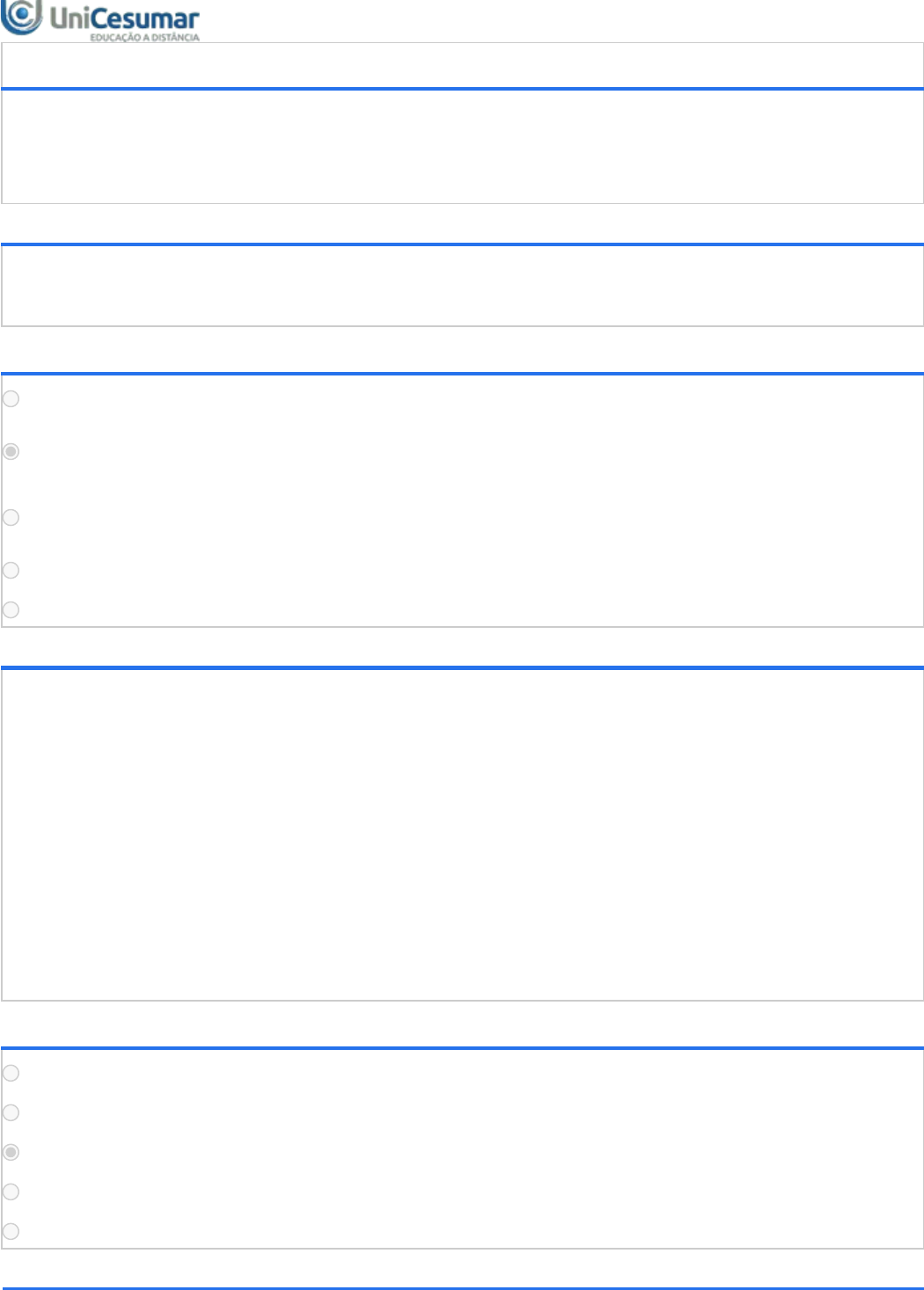 03/05/2023, 19:49 Unicesumar - Ensino a Distância about:blank 1/5 PROVA - NEUROBUSINESS E GESTÃO VOLTADA AO RESULTADO - 42/2023 Período:03/04/2023 08:00 a 13/05/2023 23:59 (Horário de Brasília) Status:ABERTO Nota máxima:6,00 Gabarito:Gabarito será liberado no dia 14/05/2023 00:00 (Horário de Brasília) Nota obtida: 1ª QUESTÃO Uma das características do mundo contemporâneo é a velocidade com que as mudanças ocorrem, assim sendo: ALTERNATIVAS É necessário que se fomente a alta rotatividade nos ambientes organizacionais. É fundamental que se fomente o foco nos resultados por meio de um trabalho orientado e articulado com os indivíduos. Os elementos do comportamento individual devem ser substituídos por aqueles que compõem o ambiente organizacional. Diminua-se a competitividade global e tecnológica. Nenhuma das alternativas está correta. 2ª QUESTÃO Leia atentamente os trechos apresentados: A _______ __________ rápida e automática da mente são responsáveis pela maioria das nossas decisões cotidianas. A ação do dirigente se dá em constante ________________no contexto organizacional. A ______________ dos exageros precisa ser superada, levando a um formato de gestão mais flexibilizado no qual racionalidade e intuição se complementem. O trabalho do executivo pouco tem de ____________ e de____________, em termos de um determinado número de funções. Assinale a alternativa que apresenta as palavras que completarem as lacunas: ALTERNATIVAS Tomada de decisão. Comunicação. Contraposição. Continuo. Focado. Parte racional. Contraposição. Chamada. Focado. Contínuo. Parte intuitiva. Movimento. Contraposição. Sistemático. Contínuo. Atividade. Estabilidade. Questão. Estável. Momentâneo. Nenhuma das alternativas está correta. 3ª QUESTÃO 03/05/2023, 19:49 Unicesumar - Ensino a Distância about:blank 2/5 Analise atentamente os excertos apresentados a seguir: O _____________ ___________ é variável e ao mesmo tempo variante. O entendimento das __________ _________ funciona como ferramenta de apoio para compreender como as pessoas são e como agem, o que ajuda a preparar e tomar decisões. A capacidade de _____________ dos indivíduos é muito grande. Na neurociência sustenta essa afirmação o conceito de ____________ ______________. Assinale a alternativa com as palavras que preencham as lacunas de cada sentença. ALTERNATIVAS Indivíduo sozinho. Forças individuais. Adaptação. Comportamento individual. Comportamento humano. Potencialidades individuais. Plasticidade. Comportamento cerebral. Comportamento humano. Diferenças individuais. Adaptação. Plasticidade Cerebral. Fluxo organizacional. Capacidades individuais. Adaptação. Adaptação cerebral. Nenhuma das alternativas está correta. 4ª QUESTÃO A liderança pode ser apresentada como um processo de influência pelo qual os indivíduos líderes por meio de suas ações, facilitam o movimento de um grupo de pessoas rumo a metas comuns ou compartilhadas. Assim, sobre esse processo é correto afirmar que: I - Tem como um de seus focos a busca por resultados. II - Impulsiona as pessoas para o desenvolvimento de ações. III - Traz como característica o convencimento e a persuasão de outras pessoas em prol de objetivos definidos. IV - Também traz como foco elevar o potencial humano. Assinale a alternativa correta: ALTERNATIVAS Está correto somente o que se afirma em I e II. Está correto somente o que se afirma em II e III. Está correto somente o que se afirma em II, III e IV. Está correto o que se afirma em I, II, III e IV. Nenhuma das alternativas está correta. 5ª QUESTÃO Em busca do aprimoramento do comportamento organizacional o foco de ensino considerado tradicional tem evoluído para uma pedagogia centrada no aluno, levando-o a reflexão crítica sobre casos reais. Considerando essa premissa, e, focando no mundo das organizações, é correto afirmar que: ALTERNATIVAS 03/05/2023, 19:49 Unicesumar - Ensino a Distância about:blank 3/5 Os indivíduos são tratados de forma homogênea. Houve um descolamento para o desenvolvimento individual, considerando que os estímulos oferecidos aos indivíduos levam o seu cérebro a funcionar de forma diferente. Os estímulos oferecidos ao indivíduo fazem com que o seu cérebro funcione de formas iguais. Razão e emoção deixam de ser consideradas importantes para os estudos a respeito do comportamento humano. Nenhuma das alternativas está correta. 6ª QUESTÃO A liderança foi estudada enquanto um processo de gestão e condução de pessoas no qual se consideram as boas relações interpessoais e o bom rendimento da dinâmica organizacional. Considerando a relação estabelecida com a neurociência, é correto afirmar que: I - Fala-se em neuroliderança, uma forma de gestão associada às formas de funcionamento do cérebro humano. II - Uma forma de exercer a neuroliderança nos ambientes organizacionais é desenvolver a percepção de segurança nas equipes, suscitando assim a confiança. III - O conhecimento sobre o funcionamento do cérebro, no que diz respeito ao comportamento e emoções para orientar as decisões dos líderes, fomenta melhores resultados. IV - Por ser uma característica individual, o comprometimento no trabalho não é influenciado pelo estímulo do líder, mesmo que este se utilize dos princípios da neurociência. Assinale a alternativa correta: ALTERNATIVAS Está correto somente o que se afirma em I e II. Está correto somente o que se afirma em II e IV. Está correto somente o que se afirma em I, II e III. Está correto somente o que e afirma em II, III e IV. Nenhuma das alternativas está correta. 7ª QUESTÃO 03/05/2023, 19:49 Unicesumar - Ensino a Distância about:blank 4/5 Considerando as discussões propostas a respeito do controle, feedback no processo de liderança, marque V para verdadeiro e F para falso nas sentenças a seguir: ( ) A comparação entre as atividades realizadas e o alcance dos objetivos propos