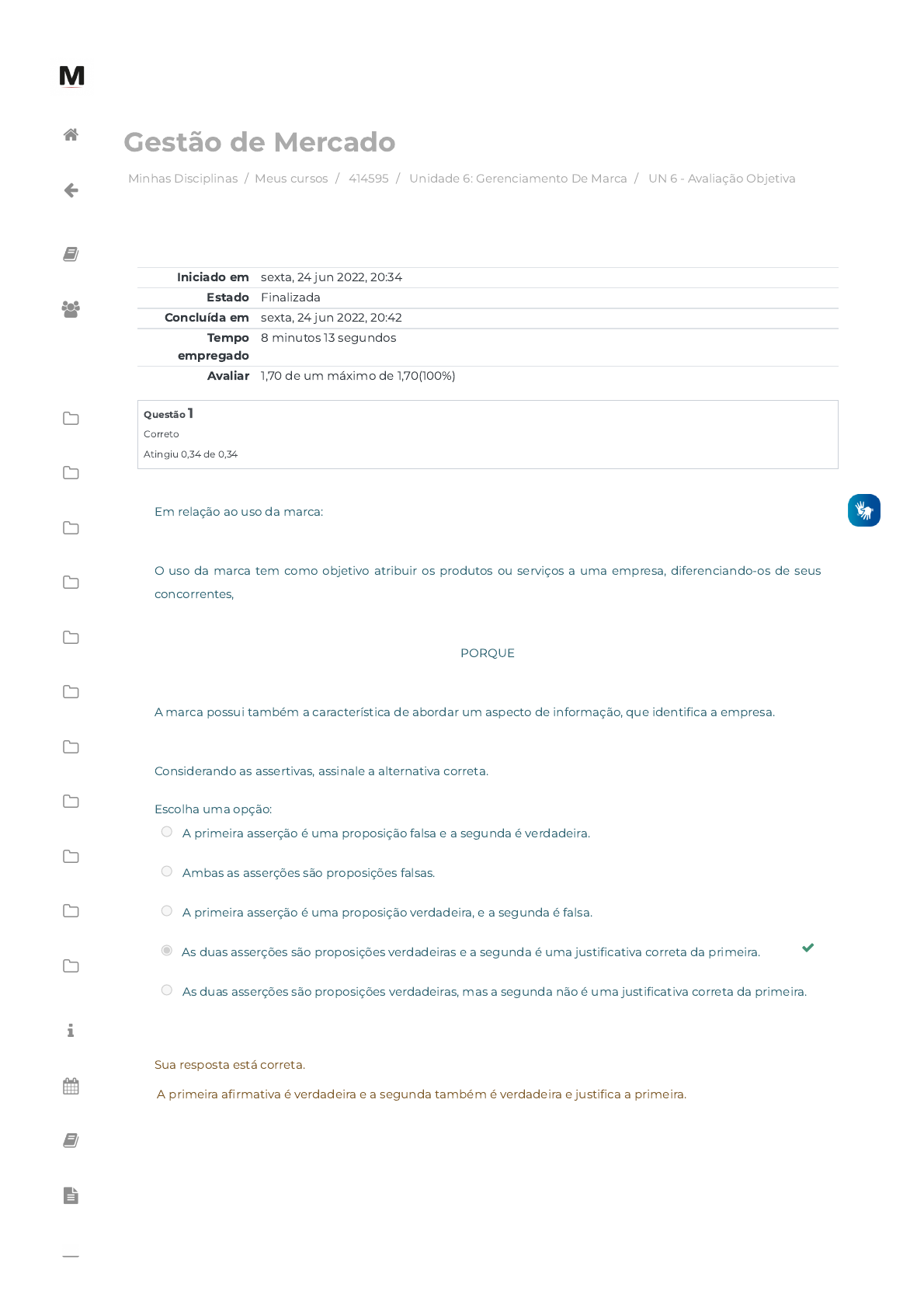 24/06/2022 20:42 UN 6 - Avaliação Objetiva: Revisão da tentativa https://avap.multivix.edu.br/mod/quiz/review.php?attempt=1566174&cmid=1033551 1/5 Minhas Disciplinas / Meus cursos / 414595 / Unidade 6: Gerenciamento De Marca / UN 6 - Avaliação Objetiva Gestão de Mercado Iniciado em sexta, 24 jun 2022, 20:34 Estado Finalizada Concluída em sexta, 24 jun 2022, 20:42 Tempo empregado 8 minutos 13 segundos Avaliar 1,70 de um máximo de 1,70(100%) Questão 1 Correto Atingiu 0,34 de 0,34 Em relação ao uso da marca: O uso da marca tem como objetivo atribuir os produtos ou serviços a uma empresa, diferenciando-os de seus concorrentes, PORQUE A marca possui também a característica de abordar um aspecto de informação, que identi�ca a empresa. Considerando as assertivas, assinale a alternativa correta. Escolha uma opção: A primeira asserção é uma proposição falsa e a segunda é verdadeira. Ambas as asserções são proposições falsas. A primeira asserção é uma proposição verdadeira, e a segunda é falsa. As duas asserções são proposições verdadeiras e a segunda é uma justi�cativa correta da primeira. As duas asserções são proposições verdadeiras, mas a segunda não é uma justi�cativa correta da primeira. Sua resposta está correta. A primeira a�rmativa é verdadeira e a segunda também é verdadeira e justi�ca a primeira. https://avap.multivix.edu.br/my/ https://avap.multivix.edu.br/course/view.php?id=13926 https://avap.multivix.edu.br/course/view.php?id=13926§ion=7 https://avap.multivix.edu.br/mod/quiz/view.php?id=1033551 https://avap.multivix.edu.br/my/ https://avap.multivix.edu.br/course/view.php?id=13926 https://avap.multivix.edu.br/user/index.php?id=13926 https://avap.multivix.edu.br/course/view.php?id=13926§ion=1 https://avap.multivix.edu.br/course/view.php?id=13926§ion=2 https://avap.multivix.edu.br/course/view.php?id=13926§ion=3 https://avap.multivix.edu.br/course/view.php?id=13926§ion=4 https://avap.multivix.edu.br/course/view.php?id=13926§ion=5 https://avap.multivix.edu.br/course/view.php?id=13926§ion=6 https://avap.multivix.edu.br/course/view.php?id=13926§ion=7 https://avap.multivix.edu.br/course/view.php?id=13926§ion=8 https://avap.multivix.edu.br/course/view.php?id=13926§ion=9 https://avap.multivix.edu.br/course/view.php?id=13926§ion=10 https://avap.multivix.edu.br/course/view.php?id=13926§ion=11 https://avap.multivix.edu.br/mod/page/view.php?id=1252%2F%22%20target%3D%22_blank https://avap.multivix.edu.br/calendar/view.php/ https://avap.multivix.edu.br/local/staticpage/view.php?page=biblioteca https://portalweb.multivix.edu.br/gabaritos/login.aspx https://multivix.edu.br/office-365/ https://avap.multivix.edu.br/ 24/06/2022 20:42 UN 6 - Avaliação Objetiva: Revisão da tentativa https://avap.multivix.edu.br/mod/quiz/review.php?attempt=1566174&cmid=1033551 2/5 Questão 2 Correto Atingiu 0,34 de 0,34 Avalie as a�rmativas abaixo referentes à importância da marca para o consumidor: Quando se percebe a presença de marcas conhecidas, o cliente se sente mais tranquilo ao realizar a compra. A marca deve considerar os benefícios dos produtos, envolvendo tanto sua parte funcional quanto emocional. Se a imagem criada combinar com as aspirações dos clientes, maiores são as chances desse público adquirir o produto. A marca cria identidade do produto. Considerando as assertivas, assinale a alternativa correta. Escolha uma opção: I, II e IV III e IV I, III e IV I e II I, II, III e IV Sua resposta está correta. Todas as alternativas estão corretas. https://avap.multivix.edu.br/my/ https://avap.multivix.edu.br/course/view.php?id=13926 https://avap.multivix.edu.br/user/index.php?id=13926 https://avap.multivix.edu.br/course/view.php?id=13926§ion=1 https://avap.multivix.edu.br/course/view.php?id=13926§ion=2 https://avap.multivix.edu.br/course/view.php?id=13926§ion=3 https://avap.multivix.edu.br/course/view.php?id=13926§ion=4 https://avap.multivix.edu.br/course/view.php?id=13926§ion=5 https://avap.multivix.edu.br/course/view.php?id=13926§ion=6 https://avap.multivix.edu.br/course/view.php?id=13926§ion=7 https://avap.multivix.edu.br/course/view.php?id=13926§ion=8 https://avap.multivix.edu.br/course/view.php?id=13926§ion=9 https://avap.multivix.edu.br/course/view.php?id=13926§ion=10 https://avap.multivix.edu.br/course/view.php?id=13926§ion=11 https://avap.multivix.edu.br/mod/page/view.php?id=1252%2F%22%20target%3D%22_blank https://avap.multivix.edu.br/calendar/view.php/ https://avap.multivix.edu.br/local/staticpage/view.php?page=biblioteca https://portalweb.multivix.edu.br/gabaritos/login.aspx https://multivix.edu.br/office-365/ https://avap.multivix.edu.br/ 24/06/2022 20:42 UN 6 - Avaliação Objetiva: Revisão da tentativa https://avap.multivix.edu.br/mod/quiz/review.php?attempt=1566174&cmid=1033551 3/5 Questão 3 Correto Atingiu 0,34 de 0,34 Avalie as a�rmativas a seguir referentes aos elementos desejáveis da marca: Familiaridade: rápida identi�cação por parte do consumidor. Autoridade: fonte de promessa con�ável de alta qualidade e liderança. Facilidade de leitura, pronúncia e lembrança em vários idiomas. Deve ser moderna sem a necessidade de transmitir a tradição da empresa. É CORRETO o que se a�rma em: Escolha uma opção: I, apenas I, II e III III, apenas II, apenas IV, apenas Sua resposta está correta. A marca deve transmitir a tradição da empresa. https://avap.multivix.edu.br/my/ https://avap.multivix.edu.br/course/view.php?id=13926 https://avap.multivix.edu.br/user/index.php?id=13926 https://avap.multivix.edu.br/course/view.php?id=13926§ion=1 https://avap.multivix.edu.br/course/view.php?id=13926§ion=2 https://avap.multivix.edu.br/course/view.php?id=13926§ion=3 https://avap.multivix.edu.br/course/view.php?id=13926§ion=4 https://avap.multivix.edu.br/course/view.php?id=13926§ion=5 https://avap.multivix.edu.br/course/view.php?id=13926§ion=6 https://avap.multivix.edu.br/course/view.php?id=139