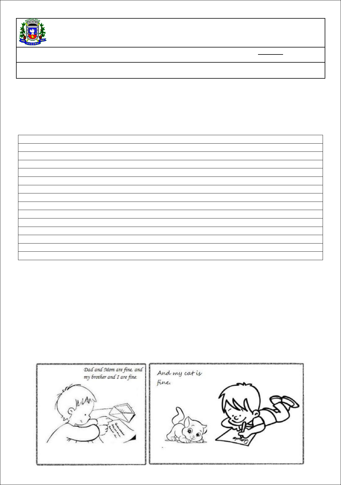 PREFEITURA MUNICIPAL DE ITABORAÍ ESTADO DO RIO DE JANEIRO SECRETARIA MUNICIPAL DE EDUCAÇÃO, CULTURA E TURISMO Escola Municipal Genesio da Costa Cotrim Prof:________________________________________________Disciplina: Inglês Ano: ____6°___ Turma:______ Turno: ___________ / Data:____/____/_____. Aluno(a): ______________________________________________________________________ Nº:_____ VERB TO BE O verbo “to be” pode expressar dois significados: ser ou estar. Logo, tanto para dizer que eu sou uma professora (I am a teacher), quanto para dizer que eu estou na escola (I am at school), deve-se utilizar o verbo “to be”. O verbo “to be” no presente se conjuga em “am”, “is” e “are”. Segue uma tabela para indicar o uso correto do verbo “to be” no presente: I am – Eu sou / estou You are – você é/ está He is – ele é/ está She is- ela é / está It is – ele ,ela é / está ( para coisas , objetos e animais) We are – nós somos / estamos You are – vocês são/ estão They are – eles, elas são/ estao Ex.: You are a student. (Você é um aluno). He is my neighbor. (Ele é meu vizinho). She is at the supermarket. (Ela está no supermercado). The dog is outside. (O cão está lá fora). We are friends. (Nós somos amigas). You are my enemies. (Vocês são meus inimigos). They are upstairs. (Eles estão lá em cima). Leia a tirinha com a ajuda do vocabulário e marque a alternativa correta Vocabulário: Dad : papai are : são / estão. Is : é / está Fine : bem Brother: irmão I : eu 1) A tradução do texto do primeiro quadrinho corresponde a: a) ( ) Papai e mamãe estão passando mal e minha irmã e eu estamos também. b) ( ) Papai e mamãe estão bem, e meu irmão e eu estamos bem. 2) Circule os verbos “to be” usados nas frases “Dad and Mom are fine, and my brother and I are fine. And my cat is fine.” 3) Observe a imagem e complete as falas com o verbo adequado, consulte a caixa de texto ao lado: