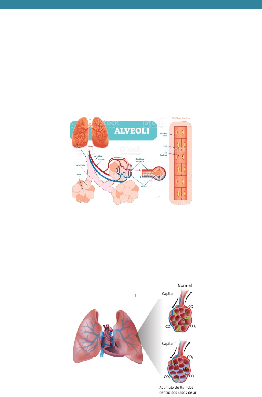 EDEMA PULMONAR E SÍNDROME DA ANGÚSTIA RESPIRATÓRIA AGUDA INTRODUÇÃO Para entendermos o porquê ocorre o edema pulmonar precisamos revisar sobre a troca de fluidos na microcirculação pulmonar, que ocorre através de pequenos espaços entre as células endoteliais e usualmente não atingem o espaço aéreo por causa das junções intercelulares do epitélio alveolar, preservadas no pulmão normal. Em condições fisiológicas, há movimento de fluidos continuamente do espaço intravascular para o interstício, controlado pela permeabilidade da membrana capilar, de acordo com a diferença entre as pressões hidrostática e osmótica. Lembrando que o sistema linfático é o responsável pela drenagem, retira o “aumento” da filtração transcapilar. FONTE: https://www.istockphoto.com/es/fotos/alv%C3%A9olo Pronto, o edema pulmonar é uma síndrome decorrente do desequilíbrio entre a filtração intersticial de liquido e a drenagem linfática, ocorre um desequilíbrio entre as pressões hidrostática e oncótica, levando ao acúmulo anormal de fluidos nos compartimentos extravasculares do pulmão (interstício e espaço aéreo). FONTE: Alila Medical Media/Shutterstock.com Os 2 tipos principais são o edema cardiogênico e não cardiogênico, mas outras causas incluem: FONTE: livro TÓRAX, da série Colégio Brasileiro de Radiologia e Diagnóstico por Imagem, 2010 (a fonte do livro está nas referências, coloquei aqui assim mal feito só para saber de onde tirou). Quanto aos tipos principais: EDEMA CARDIOGÊNICO (também conhecido como edema hidrostático ou hemodinâmico), sua causa mais comum é a elevação da pressão venosa pulmonar (aumento da pressão hidrostática nos capilares pulmonares) secundária à hipertensão atrial esquerda, suaves elevações da pressão atrial esquerda (18 a 25 mmHg) podem causar edema, geralmente resultante de falência ventricular, disfunção da valva mitral, obstrução da via de saída do VE ... que resulta no aumento das vias de filtragem de fluidos e conseqüente rompimento do epitélio pulmonar, inundando o alvéolos com líquido pobre em proteínas. OBS: Uma típica história de dispneia noturna paroxística ou ortopneia sugere edema pulmonar cardiogênico. NÃO CARDIOGÊNICO (também conhecido como edema de alta permeabilidade), ocorre devido a injúria endotelial capilar ou do epitélio alveolar que promovem o aumento na permeabilidade vascular do pulmão com consequente influxo de proteína e fluido para o espaço aéreo e interstício, sua manifestação mais grave = SARA. ACHADOS FISIOPATOLÓGICOS Logo, identificamos duas fases fisiopatológicas (que serão também radiológicas, como vamos apresentar adiante): comprometimento intersticial e preenchimento alveolar, cuja intensidade e duração estão relacionadas com o grau de aumento de pressão que é determinado pela relação entre a pressão hidrostática e a osmótica. Explicando melhor, quando a pressão hidrostática microvascular aumenta e a pressão osmótica proteica intraluminal decai, há transudação de fluidos do espaço intravascular para o interstício, configurando edema pulmonar intersticial. À medida que a capacidade de armazenamento e remoção de fluidos pelo interstício atinge seu limiar, ocorre preenchimento do espaço aéreo, configurando o edema alveolar. Pode coexistir também o derrame pleural, caso a pressão no espaço pleural seja menor do que a hidrostática, culminando no movimento de fluido através da pleura visceral. A magnitude do preenchimento alveolar e a velocidade de remoção de fluidos do espaço aéreo pulmonar estão diretamente relacionadas com a extensão do edema intersticial - presença ou ausência de dano; e a capacidade do epitélio alveolar de remover de forma ativa o liquido do espaço aéreo. A rápida elevação da pressão hidrostática e o consequente aumento da taxa de filtração transvascular de fluidos são as marcas do edema cardiogênico e/ ou decorrente de sobrecarga de volume. ACHADOS CLÍNICOS E LABORATORIAIS A apresentação clínica do edema pulmonar carcliogênico e não cardiogênico é semelhante. O edema intersticial leva à dispneia, o preenchimento alveolar por líquido causa hipoxemia, podendo estar associado à tosse e à expectoração de líquido espumoso. Logo, as manifestações mais comuns são: dispneia, taquipneia, cianose, crepitações inspiratória e expiratória em todo o tórax, edema periférico, elevação da pressão venosa e, em casos mais graves, hemoptise. EDEMA PULMONAR CARDIOGÊNICO NÃO CARDIOGÊNICO ALTERAÇÕES CARDIOVASCULARES PERMEABILIDADE DA MICROCIRCULAÇÃO ELEVADA AUSCULTA DE GALOPE (3º BULHA) PNEUMONIA MURMÚRIO CONSISTENTE COM ESTENOSE OU REGURGITAÇÃO VALVAR SEPSE INGURGITAMENTO JUGULAR ASPIRAÇÃO DE CONTEÚDO GÁSTRICO HEPATOMEGALIA SARA EDEMA PERIFÉRICO EDEMA PULMONAR CARDIOGÊNICO Ausculta de galope da terceira bulha = relativamente específica para pressão diastólica final aumentada e disfunção ventricular esquerda. Edema periférico, sugerindo aumento da pressão venosa central. ACHADOS FISIOPATOLÓGICOS Identificam-se duas fases fisiopatológicas e radiológicas distintas: comprometimento intersticial e preenchimento alveolar, cuja intensidade e duração estão relacionadas com o grau de aumento de pressão que é determinado pela relação entre a pressão hidrostática e a osmótica. A elevação da pressão hidrostática na microcirculação é acompanhada por aumento na taxa de filtração transvascular de fluidos. Quando a pressão hidrostática microvascular aumenta e a pressão osmótica proteica intraluminal decai, há transudação de fluidos do espaço intravascular para o interstício, configurando edema pulmonar intersticial. À medida que a capacidade de armazenamento e remoção de fluidos pelo interstício atinge seu limiar, ocorre preenchimento do espaço aéreo, configurando o edema alveolar. Haverá também derrame pleural caso a pressão n
