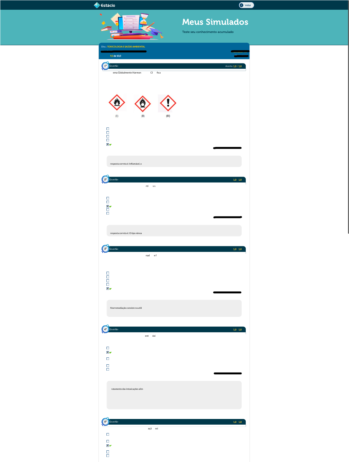 Meus Simulados Teste seu conhecimento acumulado Disc.: TOXICOLOGIA E SAÚDE AMBIENTAL Aluno(a): NICOLY PEREIRA DUARTE SENA 202102116465 Acertos: 9,0 de 10,0 07/11/2022 Acerto: 1,0 / 1,0 O Sistema Globalmente Harmonizado de Classi�cação e Rotulagem de Produtos Químicos (GHS) é uma abordagem que traz orientações para a comunicação [...] de perigos físicos, à saúde e ao meio ambiente, e estabelece critérios uniformes para a classi�cação e a comunicação da informação sobre os mesmos. Entre os meios de comunicação estão os pictogramas, que se tratam de um conjunto de elementos grá�cos, incluindo um símbolo, que representa a classe de perigo associada ao produto, e uma borda. [...] O GHS estabelece nove pictogramas distintos associados às classes de perigos físicos, à saúde e ao meio ambiente. As �guras abaixo são exemplos de pictogramas estabelecidos pelo GHS: De acordo com o GHS, os pictogramas I, II e III advertem sobre os seguintes perigos, respectivamente: Corrosivo a pele, in�amável e carcinogênico In�amável, oxidante e substância não perigosa Oxidante, in�amável e substância não perigosa Oxidante, in�amável e carcinogênico In�amável, oxidante e irritação da pele e dos olhos Respondido em 07/11/2022 17:46:03 Explicação: A resposta correta é: In�amável, oxidante e irritação da pele e dos olhos Acerto: 1,0 / 1,0 Aerodispersoides é a dispersão de partículas sólidas ou líquidas no ar, ou seja, é uma espécie de mistura de substâncias sólidas ou líquidas com o ar que respiramos. Essas partículas dispersas no ar têm entre 0,5 e 200 microns de tamanho. Em relação ao tipo de aerodispersoide, assinale a a�rmativa correta. O tipo fumo é composto por partículas no estado físico gasoso. O tipo névoa é composto por partículas no estado físico gasoso. O tipo névoa é composto por partículas no estado físico líquido. O tipo poeira é composto por partículas no estado físico gasoso. O tipo neblina é composto por partículas no estado físico sólido. Respondido em 07/11/2022 17:47:20 Explicação: A resposta correta é: O tipo névoa é composto por partículas no estado físico líquido Acerto: 1,0 / 1,0 Os resíduos tóxicos quando são destinados de forma inadequada podem contaminar e causar danos ao ecossistema, sendo necessário em alguns casos, a utilização de técnicas de remediação para minimizar os danos. Assinale a alternativa que corresponde a um processo de remediação que utiliza espécies vegetais para remoção de contaminantes. Biorremediação. Quimiorremediação. Destruição do contaminante. Filtração em membranas de celulose. Fitorremediação. Respondido em 07/11/2022 17:47:54 Explicação: A �torremediação consiste na utilização de espécies vegetais que podem assimilar alguns contaminantes e removê-los do solo. A biorremediação é a utilização de microrganismos para degradar ou inativar contaminantes ambientais. A �ltração é um processo físico para remoção de poluente. A destruição do contaminante é uma forma de remediar através de alguma tecnologia. Acerto: 1,0 / 1,0 A Toxicologia alimentar estuda os agentes tóxicos propagados pelos alimentos, determinando a presença, concentração e a origem do xenobiótico no produto alimentício, fatores que in�uenciam o seu aparecimento, bem como os efeitos nocivos na saúde do consumidor. Com base nos fundamentos da Toxicologia de Alimentos, assinale a alternativa correta: Os contaminantes dos alimentos estão naturalmente presentes nos alimentos processados. Os inibidores de tripsina e quimiotripsina são exemplos de substâncias antinutricionais, pois atrapalham a absorção e utilização dos nutrientes provenientes da dieta. Compostos que alteram a absorção de algum nutriente são denominados não nutrientes, como por exemplo, a tiaminase encontrada em algumas espécies de peixe. Faz parte da área de atuação da Toxicologia de Alimentos a prevenção e o tratamento da intoxicação alimentar. As substâncias nutrientes são os principais constituintes dos alimentos e responsáveis pelas intoxicações humanas. Respondido em 07/11/2022 17:48:24 Explicação: O tratamento das intoxicações alimentares é premissa da Toxicologia Clínica. Paralelamente, a Toxicologia de alimentos estuda todos os aspectos envolvidos na exposição dos seres humanos aos xenobióticos presentes nos alimentos, atuando especialmente na prevenção dessas intoxicações. O alimento é composto por nutrientes, não nutrientes e os antinutritivos. Os primeiros compreendem as substâncias encontradas nos alimentos, que são úteis para o metabolismo e indispensáveis para o crescimento, desenvolvimento e manutenção das funções vitais dos organismos vivos. Os não nutrientes são os principais constituintes dos alimentos, sendo, primordialmente, a principal fonte de agentes tóxicos de origem natural. As substâncias antinutricionais atuam diminuindo a biodisponibilidade dos nutrientes, seja alterando a absorção, favorecendo a eliminação ou ainda degradando os nutricionais. Acerto: 1,0 / 1,0 Em relação às medidas de descontaminação, assinale a alternativa correta. Medidas provocadoras de vômitos são recomendadas no atendimento pré-hospitalar, independentemente do agente tóxico e da idade do paciente. Na descontaminação gástrica, o objetivo é aumentar a excreção do toxicante. A realização de lavagem gástrica, após duas horas de ingestão do tóxico, deve ser considerada para as substâncias que retardam o esvaziamento gástrico. A lavagem gástrica, apesar de ser um procedimento mais invasivo que a êmese, não apresenta risco para o paciente. Recomenda-se o emprego de carvão ativado, em dose única, em todos os casos de ingestão de substâncias potencialmente tóxicas. Questão1 a Questão2 a Questão3 a Questão4 a Questão5 a https://simulado.estacio.br/alunos/inicio.asp javascript:voltar();