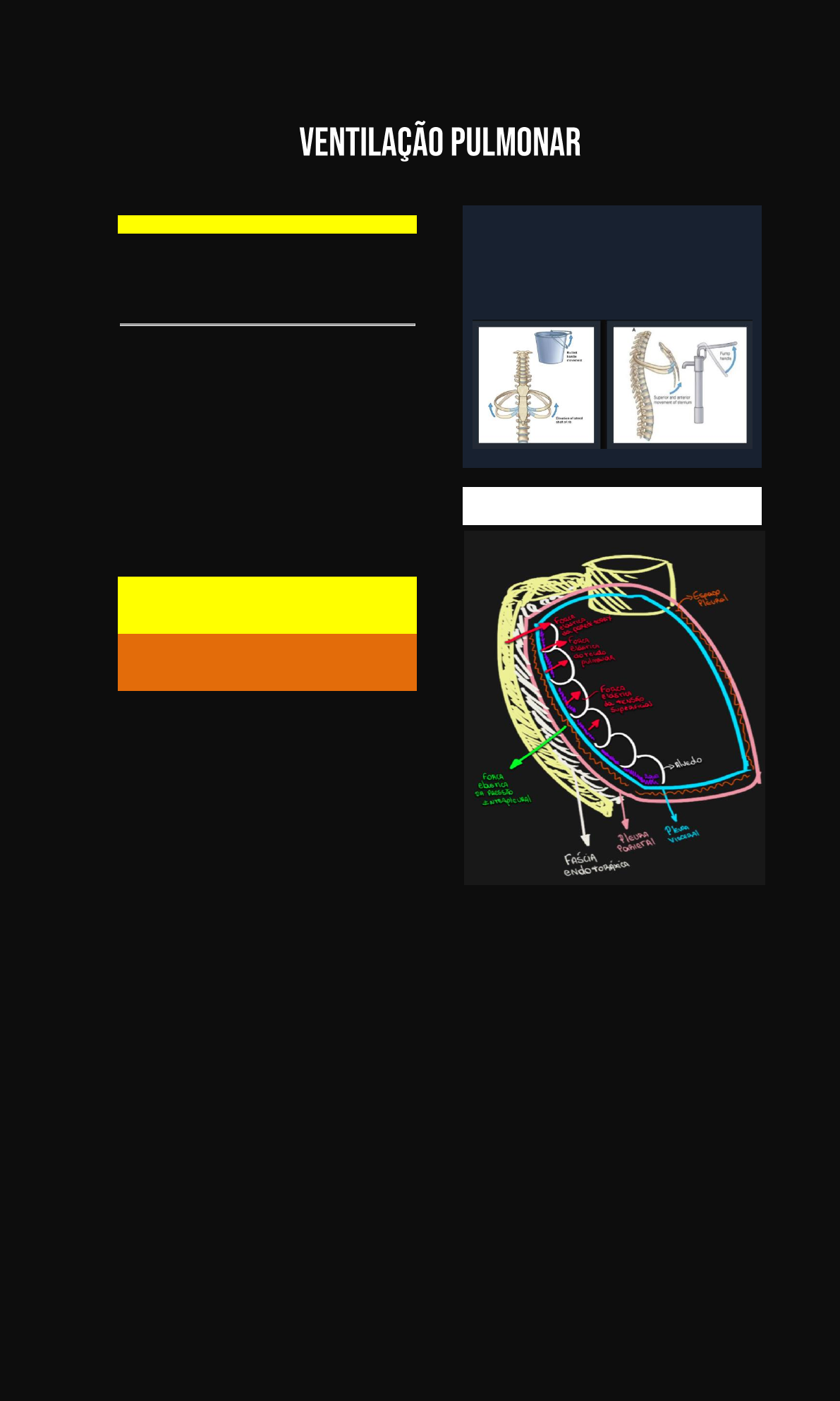 Índice-chave: 1- Mecânica da ventilação pulmonar; 2- Volumes e capacidades pulmonares; 3- Ventilação alveolar; Os processos que envolvem a respiração incluem: 1) Ventilação – que é a entrada e saída de ar dos alvéolos; 2) Difusão – troca de O2 e CO2 entre os capilares e os alvéolos; 3) Transporte – transporte do CO2 e O2 dos e para os tecidos; 4) Regulação – devem existir mecanismos pra regular essa respiração. VENTILAÇÃO PULMONAR Mecânica da ventilação pulmonar Na respiração normal os músculos auxiliam no aumento do volume da caixa torácica, e, por conseguinte o pulmão se expande. Na expiração, o diafragma se relaxa e própria elasticidade da caixa torácica, dos pulmões e dos órgãos abdominais promove a expiração. Agora imagine um atleta correndo, sua expiração deve ser rápida, pra permitir uma ventilação adequada, nesse caso de respiração forçada, os músculos auxiliam na inspiração, mas na expiração eles não utilizam apenas a complacência, mas a contração de músculos auxiliares. E quais são esses músculos? Inspiração: diafragma, músculos intercostais internos, esternocleidomastoideo, escaleno e serrátil anterior. Expiração: reto abdominal e músculos intercostais externos. Relembre: os músculos intercostais externos elevam as costelas e o externo em dois movimentos clássicos, alça de balde lateralmente e alavanca de bomba anteriormente. Pressões que causam o movimento do ar para os pulmões Para entendermos o mecanismo pressórico durante a inspiração e expiração, precisamos entender que é como se fosse um cabo de guerra, em que forças opostas promovem diferenças de pressões e isso promove movimento, entrada ou saída de ar. Começando pela inspiração. Durante a inspiração, os músculos se contraem, exercendo uma força sob a parede torácica, elevando as costelas e expandindo seu volume. Nesse momento o espaço pleural começa a aumentar de volume, ficando com uma pressão mais negativa (lembrando que ele já apresenta uma pressão negativa em repouso de -5 cmH2O que é promovida pela filtração linfática) atingindo cerca de -6 cmH2O (pressão intrapleural). Nesse ponto, o pulmão vai se expandir puxado por essa pressão, fazendo com que a pressão dentro dos alvéolos fique negativa, atingindo cerca de -1 cmH2O (pressão intra-alveolar). A glote se abre, e o ar entra, fazendo com que a pressão intra-alveolar retorne a 0 cmH2O, enquanto a pressão intrapleural alcançou -7,5 cmH2O, isso porque os músculos continuaram contraindo. Agora começa a expiração. A força elástica da parede torácica, a água dentro dos alvéolos (tensão superficial) e a força elástica do tecido pulmonar vão começar a puxar o pulmão de volta ao repouso. Com isso, a pressão intrapleural começa a ficar mais positiva (até -5 cmH2O), assim como a pressão intra- alveolar (+1 cmH2O). O ar então é expelido, até a pressão intra-alveolar alcançar 0 cmH2O e se igualar com a atmosférica. Conceitos importantes: Agora que vimos o mecanismo, vamos concluir com alguns conceitos importantes. - Pressão transpulmonar: é a diferença de pressão entre a pressão intrapleural e intra-alveolar. - Complacência pulmonar: é o volume de ar que adentra o pulmão pra cada variação da pressão transpulmonar. Corresponde a 200 ml/cmH2O, pros pulmões isolados, e cerca de 110 ml/cmH2O pro sistema pulmão-caixa torácica. Pra existir essa pressão são necessárias forças. As forças que atuam com objetivo de retornar o pulmão ao repouso (colapso) são: - Força elástica de tensão superficial: essa força é ocasionada pela tensão superficial da água que reveste os alvéolos, representa 2/3 das forças que tendem a colapsar o pulmão. Pressão de tensão superficial = 2 . força de tensão superficial / raio do alvéolo - Força elástica do tecido pulmonar: promovida pelas fibras de colágeno e de elastina. - Força elástica da caixa torácica: promovida pelos ossos e tecidos moles da caixa torácica. As forças que atuam com objetivo de inflar o pulmão (contra o colapso) são: - Força de contração muscular: exercido pela musculatura de inspiração. Temos que nos lembrar de uma coisa importante: a força de tensão superficial de líquido que tem nos alvéolos é uma força muito exagerada, e isso pode ocasionar problemas. Pense que uma pessoa tem essa força exagerada; logo, ela vai precisar executar muito mais trabalho muscular e pressórico pra que a pressão intrapleural consiga superar essa pressão alveolar exercida por essa força de colapso. Muitas vezes, nem conseguindo. Isso diminuiria a complacência pulmonar. É aí que entra o surfactante. O surfactante é um líquido constituído de apoproteínas, cálcio e dipalmitoil fosfatidilcolina, e é produzido pelos pneumócitos tipo II. Ele atua diminuindo a tensão superficial a 1/12 da metade da tensão natural, uma pressão cerca de 4,5x menor, aumentando a complacência pulmonar e impedindo um colabamento exagerado. Volumes e capacidades pulmonares Para o estudo dos volumes pulmonares, é realizada a espirometria. A espirometria é importante para verificar como está a ventilação pulmonar, muito afetada em doenças obstrutivas (como a asma ou a DPOC) ou doenças restritivas (como a miastenia grave). A espirometria é realizada por meio de um bocal e um cilindro com ar, imerso na agua que boia conforme o contrapeso. Esse exame registra uma curva, que é dividida em volumes e capacidades. Capacidades sempre vão ser somas de volumes. - Volume corrente: é o volume de ar que entra e sai do pulmão numa respiração normal. Corresponde a 500ml. - Volume de reserva inspiratório: é o volume de ar que entra numa inspiração forçada a partir da inspiração normal. Corresponde a cerca de 3000ml. - Volume de reserva expiratório: corresponde ao volume de ar que sai numa expiração forçada pós expiração normal. Corresponde a cerca de 1100ml. - Volume 