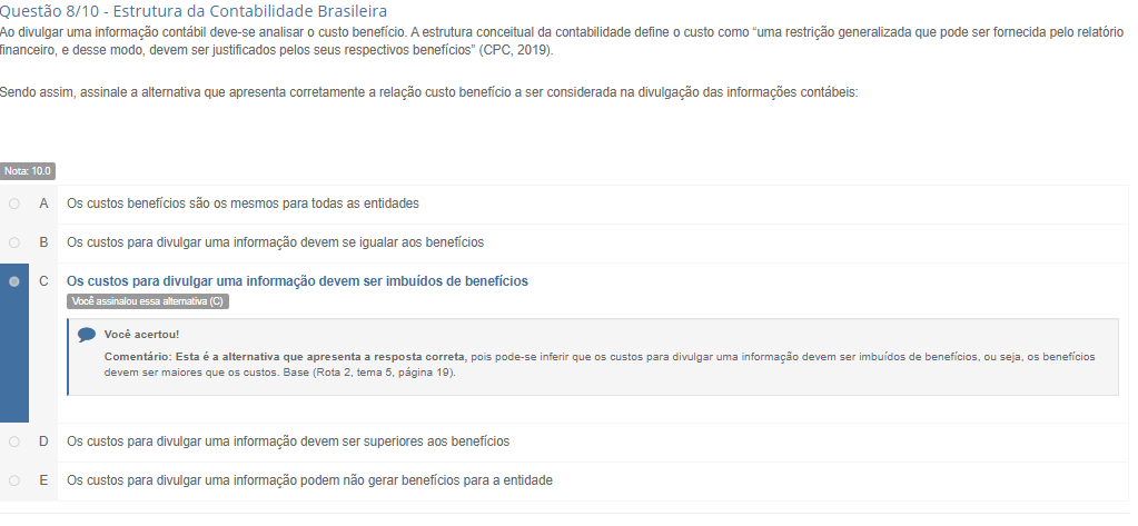 Ao divulgar uma informação deve-se analisar 0 custo A estrutura conceitual da contabilidade define 0 custo como 'uma restrição generalizada que pode ser fornecida pelo relatório e desse modo, devem ser justificados pelos seus respectivos benefícios' (CPC, 2019). Sendo assim, assinale a alternativa que apresenta corretamente a relação custo benefício a ser considerada na divulgação das informações
