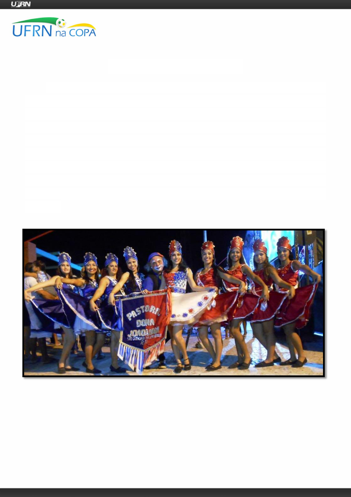 PASTORIL DONA JOAQUINA O Pastoril é um auto natalino tradicional de alguns estados do Nordeste, sendo no Rio Grande do Norte representado por grupos de vários municípios. Entre eles, o de São Gonçalo do Amarante, O Pastoril Dona Joaquina, preser- va, dentro do contexto da atualidade, as tradições desta dança desde sua chegada no município, no início da colonização pelos portugueses. Apenas meninas (pastorinhas) dançam, dividas por duas fileiras, uma azul e outra en- carnada, representando, respectivamente, o sagrado e o profano, os cristãos e os mouros, em uma animada disputa mediada pela figura da Diana. O grupo mantém os moldes tradicionais do “palhaço”, que conduz o andamento das jornadas.