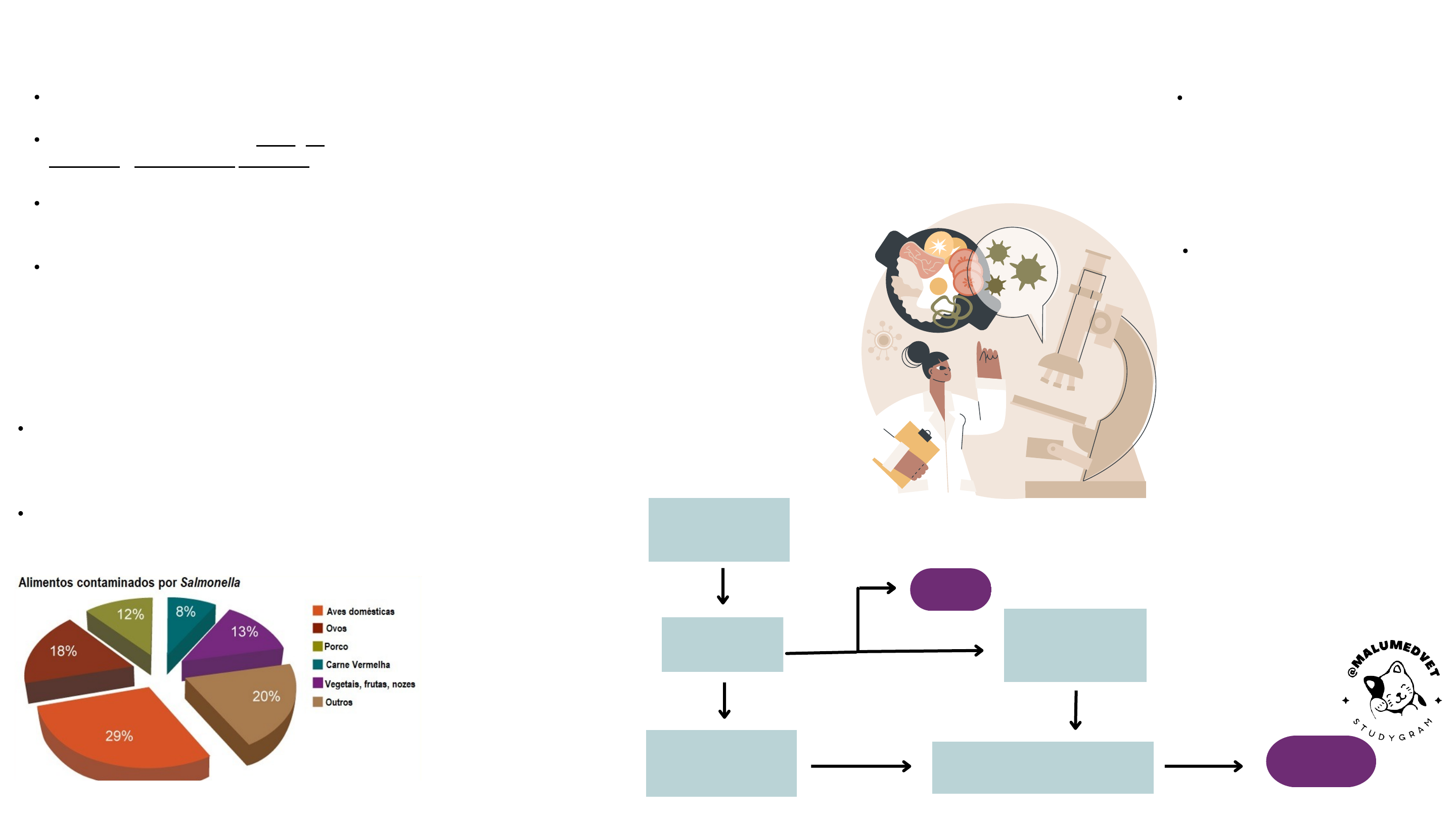 salmonella Fonte de transmissão Patogenia O gênero Salmonella faz parte da família Enterobacteriaceae; É constituído de três espécies: S. bongori, S. enterica e S. subterranea. S. enterica contém seis subespécies. A salmonelose é uma infecção gastrointestinal causada por várias cepas de Salmonella. Bactérias Gram-negativas, que pode causar doenças em humanos e animais. A salmonelose é transmitida por meio do consumo de alimentos contaminados, especialmente alimentos de origem animal, como carnes, ovos, leite e frutos do mar. Também pode ser transmitida por contato direto com fezes ou outras secreções de animais infectados. As medidas de prevenção incluem práticas de higiene pessoal, como lavar as mãos com frequência e manter superfícies e utensílios de cozinha limpos. Além disso, é importante evitar o consumo de alimentos crus ou mal cozidos, especialmente alimentos de origem animal. Os alimentos devem ser armazenados adequadamente e a carne deve ser cozida a temperaturas seguras antes de ser consumida. A patogenia da Salmonella envolve a ingestão de bactérias vivas, que se multiplicam no trato gastrointestinal e podem causar inflamação, diarreia e febre. A bactéria pode penetrar nas células do intestino e se disseminar para outras partes do corpo, causando infecções mais graves. Conceito Sinais ClínicosDiagnóstico Medidas de Prevenção O tratamento da salmonelose envolve o controle dos sintomas, como diarreia e febre, e a prevenção da desidratação. A maioria dos casos de salmonelose é autolimitada e não requer tratamento específico com antibióticos. No entanto, em casos graves, pode ser necessária a hospitalização e o uso de antibióticos. TRATAMENTO O diagnóstico da salmonelose é feito por meio de análises de amostras de sangue, urina ou fezes do paciente. Testes de laboratório são usados para identificar a presença da bactéria e determinar o melhor tratamento. Os sintomas da salmonelose incluem: ➞Diarreia ➞Dor abdominal ➞Febre ➞Náuseas ➞Vômitos A infecção pode durar de alguns dias a várias semanas, e em casos graves pode levar a complicações como desidratação, infecção generalizada (septicemia) e infecções em outros órgãos Salmonellas ingeridas em alimentos ou água contaminado Os organismos atigem o ileo terminal Invadem a parede do intestino- ulceração, perfuração e hemorragia. Espalham para os vasos linfáticos intestinais- fagocitose por macrófagos Disseminam para ossos, rins, pulmões, fígado e cérebro ENTERITE FEBRE ENTÉRICA (TIFO) maioria dos sorotipos Infecção limitada