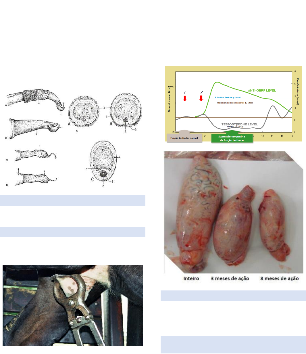 AFECÇÕES CIRÚRGICAS DO SISTEMA REPRODUTOR MASCULINO DE RUMINANTES - Boi possui o S peniano; - Pênis fibroelástico; - Corpo cavernoso; - Ereção advém do relaxamento do S peniano. - Cálculo formado na bexiga > irá dar problema na uretra (no S peniano) > maior parte das rupturas são próximas ao S > nunca amputa mais para baixo, e sim para cima. AVALIAÇÃO DO PÊNIS - Exposição do pênis por eletroejaculador. ORQUIECTOMIA EM BOVINOS - Burdizzo > alicate que esmaga o funículo percutâneo sem cortar a pele > causa edema. COMPLICAÇÕES - Funiculite; - Anestesia geral (inalatória e endovenosa) > ideal > não é feito por conta dos efeitos cumulativos feitos durante a cirurgia: → Barbitúricos (tiopental); → Não barbitúricos: (propofol). - No campo > TIVA > alfa-2 (detomidina, xilazina) + cetamina/midazolam + EGG (com mesma quantidade de alfa-2 e cetamina/midazolam que utilizou para induzir). IMUNOCASTRAÇÃO - Inibição do GnRF > inibição do LH e FSH > queda da testosterona; - 2 doses: intervalo entre a primeira e a segunda dose determina o tempo de castração; - Castração só é efetiva após a segunda dose; - Temporário. ORQUIECTOMIA EM OVINOS ADULTOS - Muito sensíveis para tétano; - Remoção parcial da bolsa escrotal; - Prolapso de reto = Dorper (raça de ovino). EPIDIDIMOTOMIA X EPIDIDIMECTOMIA X VASECTOMIA - Barreira hematotesticular > contato do espermatozoide com sangue > degeneração testicular. - Epididimectomia (tira um pedaço do epidídimo) e epididimotomia (corta o epidídimo); - Vasectomia. COMPLICAÇÕES EM RUFIÕES - Deiscência de pontos; - Hematoma; - Necrose > lidocaína sem vasoconstritor para não causar necrose > lidocaína com vasoconstritor causa isquemia e necrose. FIMOSE - Dificuldade de expor o pênis; - Corta o prepúcio. PARAFIMOSE - Pênis exposto não quer voltar. ACROBUSTITE/POSTITE - Inflamação + prolapso da mucosa do prepúcio; - Semelhante ao prolapso de reto. POSTECTOMIA: - Retira a mucosa afetada para manter a mucosa interna; - Mantém a mucosa interna por conta da glande. ANESTESIA PRINCIPAIS NERVOS DO PREPÚCIO - N. torácico lateral; - N. íleo-hipogástrico; - N. íleo-inguinal; - N. genito-femural; - N. pudendo. BLOQUEIO DO NERVO PUDENDO: - Agulha paralela ao reto, próximo ao forame isquiático menor; - Utiliza agulha de 15cm. CIRURGIA - Decúbito lateral direito; - Cirurgia em estação. COMPLICAÇÕES - Estenose; - Inflamação > fazer anti-inflamatório; - Isquemia; - Exposição da glande; - Ruptura de uretra. FALECTOMIA EM BOVINOS - Bloqueio do nervo pudendo; - Em casos de hematoma/fratura de pênis.