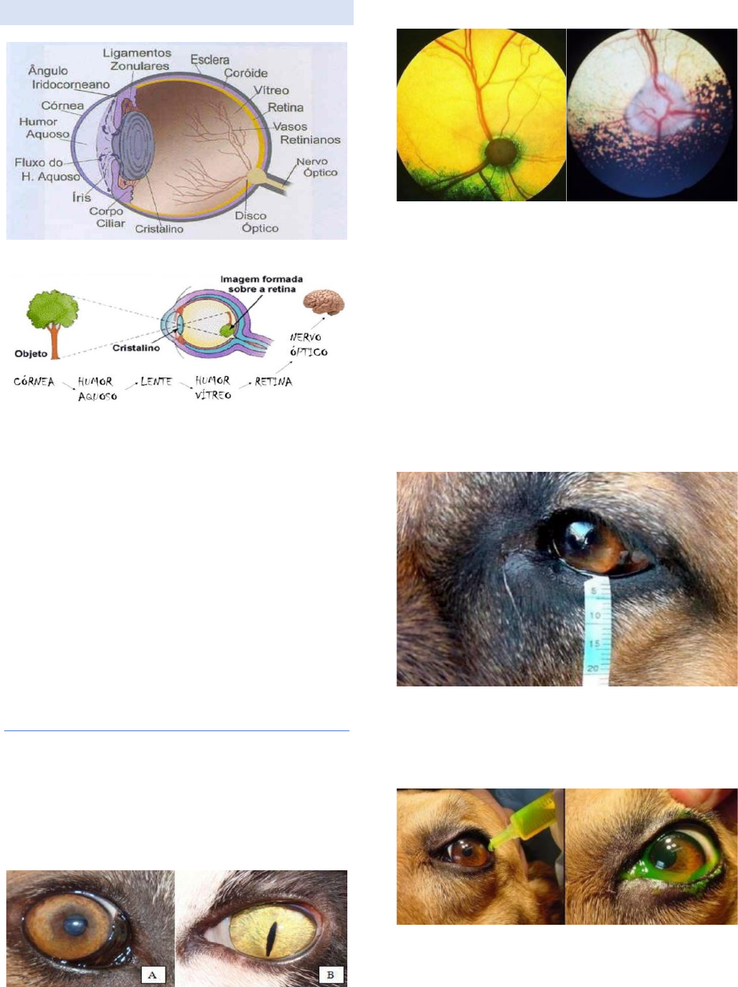 DESORDENS OFTÁLMICAS OLHO FORMAÇÃO DA IMAGEM: TESTES: - Teste Lacrimal de Schirmer > mensuração da produção lacrimal; - Teste de Fluoresceína > corante para avaliação de lesões corneanas; - Teste de Jones > avaliar a integridade das vias lacrimais. - Teste de Aplanação (Tonopen) > aferição da pressão intraocular; - Biomicroscopia com Lâmpada de Fenda; - Oftalmosscopia indireta> avaliação do fundo do olho. EXAMES COMPLEMENTARES: - Eletrorretinografia – avaliação da retina; - Citologias e histopatologias oculares; - Análises microbiológicas; - Exame de reflexo pupilar fotocromático; - Ultrassonografia ocular. EXAME OFTALMOLÓGICO - Sala escura; - Foco de luz para visibilização de estruturas> córnea, íris, cristalino e anexos (pálpebras, cílios e membrana nictitante); TESTE DO REFLEXO DIRETO E INDIRETO DAS PUPILAS: Cão x gato. DILATAÇÃO DAS PUPILAS COM COLÍRIO MIDRIÁTICO: - Visibilização do cristalino (em casos de catarata); - Exame de fundo de olho (oftalmoscopia) > inspeção de retina. Cão x gato. - Cães e gatos enxergam até 6x mais no escuro do que humanos > adaptação ao longo da evolução das espécies; - Lux captada pela retina > transmitida até o cérebro pelo nervo óptico > formação da imagem; - Quantidade de luz amplificada pelo tapetum (funciona como um espelho) > luz passa pela retina duas vezes > possibilita caça com pouca luz; - Tapetum é brilhante e colorido. TESTE DE SCHIRMER: - Para medir a produção da lágrima normal entre 15-20 mm/min; - 10-15 > suspeito. TESTE DE JONES: - Colírio/fita de fluoresceína, lissamina verde; - Verifica a existência de lesões na córnea (úlceras); - Tonometria > mensura a pressão intra-ocular (PIO). CONJUNTIVITES - Inflamação da mucosa conjuntival ocular e palpebral. ETIOLOGIA: - Geralmente secundárias. SINAIS: - Blefarite (inflamação das pálpebras); - Vasos episclerais; - Quemose (edema das pálpebras e conjuntivas); - Epífora (lacrimejamento; - Secreção mucopurulenta. TRATAMENTO: - Colírios/pomadas – AINES ou esteroidais + antibióticos; - Keravit pomada (V) – gentamicina + hidrocortisona; - Tobradex (H), Tobramax (V) > tobramicina + dexametasona; - Tobrasyn (V) > tobramicina; - Ciprovet (V) Ciprofloxacina – 1 a 2 vezes ao dia; - Maxitrol (H) – neomicina, polimixina B + dexametasona - Garasone (H) – gentamicina + betametasona; - Dexafenicol (H) – cloranfenicol + dexametasona; - Acular (H) – Cetorolaco de Trometamina (AINE); - Still (H) – Diclofenaco 3 vezes ao dia; - Ocufen (H) – Flurbiprofeno. - PredFort – acetado de prednisolona > glicocorticoide 3 a 5x maior que a potência anti-inflamatória da hidrocortisona. - Glicocorticoides inibem edema, deposição de fibrina, dilatação capilar, migração fagocitária da resposta inflamatória aguda, proliferação capilar, depósito de colágeno e formação de cicatriz. CERATOCONJUNTIVITE - Inflamação da conjuntiva e da córnea simultaneamente; - Ceratoconjuntivite seca (KKS) > redução, instabilidade ou ausência da produção de lágrimas > “olho seco”. ETIOLOGIA: - Imunomediada; - Cocker Spaniel Americano, Buldogue Inglês, Schnauzer miniatura, Pug, Yorkshire Terrier, Pequinês, West Highland White Terrier. English Springer Spaniel, Samoyeda, Shih-tzu e Boston Terrier etc. - Secundária a Cinomose, Leishmaniose, Hespervirus em gatos - Idiopática. TRATAMENTO: - Ciclosporina A (Optimmune; Restasis col. 0,05%) pomada (V) BID; - Tacrolimus; - Substitutos da lágrima (Tears V; Lacrima Plus etc.). KKS: - Ciprovet colírio (V) – Ciprofloxacina e sulfato de condroitina A > 1 a 2 vezes ao dia. DOENÇAS DA CÓRNEA CERATITE PIGMENTAR DO PUG - Predisposição a ter qualquer lesão na córnea; - Traumas, atritos. PANNUS – CERATITE SUPERFICIAL CRÔNICA - Acomete mais Pastor Alemão; - Começa vermelho e se torna pigmentado. FLORIDA SPOTS = CEROPATIA TROPICAL: - Lesões múltiplas; - Sem desconforto, inflamação, secreção, dor...; - Muito comum; - Não há tratamento; - Não há nenhuma relação com catarata. SINEQUIA ANTERIOR - Sequela da úlcera de córnea; - Aderência da íris à córnea > fibrose; - Inflamação provavelmente não tratada ou maltratada. SEQUESTRO CORNEAL FELINO - Sinônimos: ceratite necrosante, córnea negra, necrose da córnea, mumificação corneana focal. - Lesão focal; - Necrosa tecido da córnea parcialmente; - Comum em persa. PERSISTÊNCIA DA MEMBRANA PUPILAR - Semelhante a vermes; - Defeito hereditário > má formação. CERATITE ULCERATIVA - Lesão na córnea, superficial ou profunda; → Quanto mais superficial, mais dói; → Conforme vai se aprofundando, consome os nervos e não sente mais nada. ETIOLOGIA: - Infecções virais (HVF-1, Cinomose), trauma, exposição a produtos químicos; - Córnea normal: avascular, transparente, 4 camadas; - Se passa a membrana de Descemet e chega no endotélio > expõem o conteúdo > não é mais clinicamente tratável. SINAIS: - Dor – fotofobia; - Epífora. DIAGNÓSTICO: - Clínico – exame oftalmológico; - Fluoresceína/rosa bengala/lissamina verde. TRATAMENTO: - Antibióticos > aminoglicosídeos (Trobracimina), quinolonas (Vigamox), ciprofloxacino (Biamotil), Regencel pomada oftálmica (Cloranfenicol + vitamina A); - AINEs sistêmicos > meloxicam; - Colar elizabetano; - Soro heterólogo/autólogo > aplicação de gotas no olho; - NÃO utilizar corticoides; - Lubrificantes (hialuronidade); - EDTA + 2,5ml solução fisiológica no frasco do hemograma; - Colírios de Midriacyl (tropicamida – menos intenso na midríase); - Não utiliza atropina em gatos >efeito muito forte, dura mais tempo do que deveria; - Substância para não deixar fazer sinequia > midriático > íris não se adere à córnea. CERATITE HERPÉTICA EM GATOS: - Causada pelo herpesvírus; - Úlcera herpética = dendrítica corada por fluoresceína. Tratamento: - Fanciclovir (Penvir) – 90mg/kg BID VO por 21 dias > sai pela lágrima, não precisa ser colírio. - A 