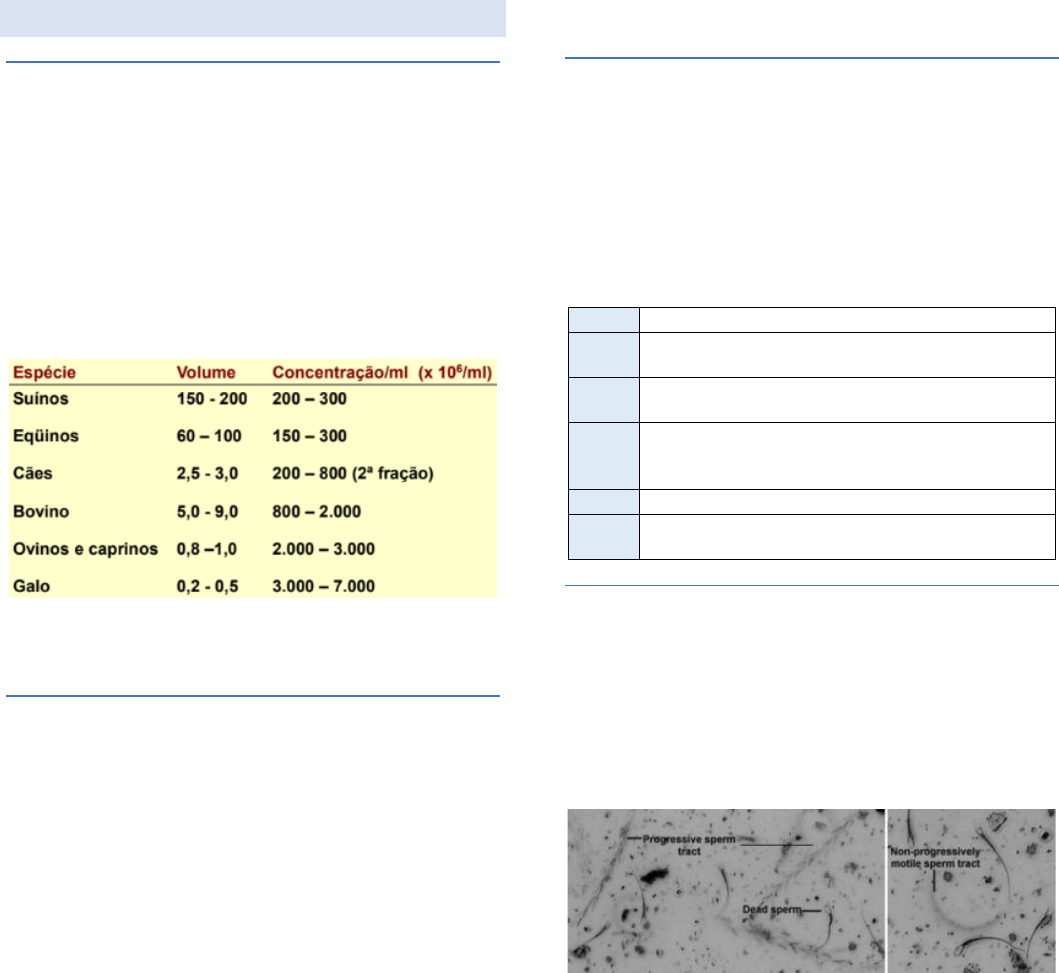 ASPECTOS FÍSICOS E MORFOLÓGICOS DO EJACULADO AVALIAÇÃO DE ASPECTOS FÍSICOS DO SÊMEN VOLUME VARIA DE ACORDO COM: - Técnica de coleta; - Espécie; - Raça; - Manejo; - Alimentação. - Sangue no ejaculado > por ter pH diferente, pode dar problema. - Cão ejacula em 3 frações > primeira é descartada, segunda é mais concentrada, terceira tem volume elevado. ASPECTOS GERAIS: COR, CHEIRO ETC. COR: - Esbranquiçado; - Branco; - Marfim; - Amarelado ou amarelo citrino; - Esverdeado > contaminação, bactérias no sêmen; - Sanguinolento. - Ruminantes > esbranquiçado, branco, marfim (principalmente em carneiros – branco denso por conta da concentração), amarelado ou amarelo citrino (bovinos). ASPECTO: - Cremoso ou marmóreo; - Leitoso; - Opaco ou opalescente > muito diluído, ou animal muito jovem (concentração espermática menor); - Aquoso > muito claro, oligospermia (fisiológica ou patológica). - Associações empíricas com concentração-temerário! Touro: 1. Cremoso - mais de 1 milhão de Sptz/mL; 2. Leitoso - 500 mil a 1 milhão de Sptz/mL; 3. Opaco - 200 mil a 500 mil Sptz/mL; 4. Aquoso - < 200 mil Sptz/mL. Ovinos: 1. Cremoso espesso - 2,5 milhões Sptz/mL; 2. Cremoso - 2,0 milhões Sptz/mL; 3. Cremoso fino - 1,0 milhão Sptz/mL; 4. Acinzentado - 100 mil Sptz/mL; 5. Aquoso - < 50 mil Sptz/mL. TURBILHONAMENTO - Motilidade de massa é resultado da associação entre concentração e motilidade; - Microscopia óptica comum objetiva com aumento de 4 a 10x; → Se ocular for de 10x = aumento de 100x. - Uma gota sobre lâmina; - Preferência: lâmina aquecida a 37°C. 0 Ausência de turbilhão + Movimento lento, ondas rasas com áreas densas ocasionais ++ Movimento moderado, ondas ainda rasas, início de aparecimento de aglomerações de sptz +++ Movimento ativo, ondas nítidas e aglomerações ou turbilhões com aparecimento de algumas áreas escuras a negras ++++ Movimento ativo e forte, ondas pronunciadas +++++ Movimento ativo e intenso, ondas com contracorrente e formação de áreas negras densas MOTILIDADE - Microscopia + avaliação subjetiva; - Porcentagem de espermatozoides móveis; - Uma gota de sêmen entre uma lâmina (pré-aquecida a 37°C) e uma lamínula; - Microscopia óptica comum > aumento de 100 ou 400x; - 200x ocular de 5x e objetiva de 40x. Fotomicrografia. AVALIAÇÃO COMPUTADORIZADA – CASA: - Microscópio trinocular de contraste de fase; - Platina aquecedora; - Computador de alta velocidade; - Câmera preto e branco; - Software próprio para análises; - Monitor de vídeo. - Contagem, percentual e concentração (milhões/mL) do total de espermatozoides, os móveis e os progressivos; - VAP Média, VSL, VCL, ALH, BCF, STR, LIN, elongação e área; - Distribuição dos espermatozoides em: rápidos, médios, lentos ou estáticos. SPERM CLASS ANALYSER – SCA: - Motilidade e concentração, contraste de fase negativo. Varrão x salmão. VIGOR - Motilidade progressiva individual; - Intensidade de deslocamento retilíneo da célula no campo do microscópio; - Escala de 0 a 5; - Realizada junto com a motilidade. VIVOS – MORTOS: - Uma gota de sêmen + 2 gotas de corante eosina-nigrosina, eosina pura associada ao citrato de sódio ou fast-green; - Ler em objetiva de 40, sob imersão; - Célula viva > não se cora. PREPARAÇÃO DA AMOSTRA PARA ENVIO AO LABORATÓRIO Meios de conservação: - Solução formol-salina a 10%; - Solução de DMPBS a 4% de formol; - Gluteraldeido. CONCENTRAÇÃO ESPERMÁTICA 1. Determinação pelo aspecto do ejaculado; 2. Câmara de newbauer ou hematimétrica; 3. Fotocolorimetria ou espectrofotômetro. - Câmara de Newbauer ou Hematimétrica: → Diluição prévia de volume conhecido de sêmen em meio de conservação previamente conhecido; → 1mL --------- 20 µL - 1/50; → 2mL --------- 20 µL - 1/100; → 4mL --------- 20 µL - 1/200; → 8mL --------- 20 µL - 1/400. - Preencher a câmara e deixar em repouso por 5 minutos. - Conta cabeças de espermatozoides, e não caudas; - Faz média da contagem; - Se na contagem houver diferenças dos dois lados superior a 10%, faz tudo de novo. - Microscopia de luz sob aumento de 100x ou 400x; - Contagem de cinco quadrados em cada lado da câmara; - Se houver diferença entre os dois lados da câmara > 10%, faz-se nova preparação da câmara e recontagem; - Somente cabeças espermáticas são contadas. 1 200 × 1 5 × 1 10.000 = 1 10.000.000 1 200 = 0,02 𝑚𝑙 𝑑𝑒 𝑠ê𝑚𝑒𝑛 4 𝑚𝑙 𝑑𝑒 𝑠𝑜𝑙𝑢çã𝑜 𝑓𝑜𝑟𝑚𝑜𝑙−𝑠𝑎𝑙𝑖𝑛𝑎 1 5 = 25 quadrados em sêmen fresco contam-se cinco em diagonal > equivale a 1/5 da câmara. Se contar os 25 quadrados, equivalerá a um inteiro (25/25). 1 10.000 = Volume da câmara considerando a área de 25 As = 1mm² com altura de 0,1mm > Volume = 0,1mm³ = 0,0001 cm³ = 1/10.000ml. 1 10.000.000 = Contagem da câmara x 10 x 106 Contagem 20 = 20 x 10 x 106 = 200 x 106 sptz/mL - Cada sptz contado na câmara equivale a 10 milhões de sptz/ml, mas isto é feito em sêmen cujas características estão dentro de um padrão normal (numa determinada faixa de concentração); - Em sêmen de baixa concentração usa-se contar os 25 quadrados para diminuir o erro. - Então a fórmula fica: 1 200 × 1 10.000 = 1 2.000.000 - Cada espermatozoide equivalerá a 2 milhões/mL; - Concentração/mL → Contagem = 20 x 2 x 106 = 40 x 106 sptz/mL; - Volume do ejaculado= 10 ml; - Concentração total = concentração/mL x volume do ejaculado = 40 x 106 x 10mL= 400 x 106 sptz totais. - Dependendo da diluição (1/100, 1/200 etc.), concentração fica diferente; - Necessário muita precisão quando se trabalha com sêmen congelado. ESPÉCIE VOLUME CONCENTRAÇÃO/ML JOVEM/ADULTO (X 10 6/ML) DILUIÇÃO Suínos 150-200 200-300 1/100 ou 1/200 Equinos 60-100 150-300 1/50 ou 1/100 Cães 2,5-3,0 200-800 (2ª fração) 1/50 ou 1/100 Bovino 5-9 800-2.000 1/100 ou 1/200 Caprinos e ovinos 0,8-1,0 2.000-3.000 1/100 ou 1/200 Galo 0,2-0,5