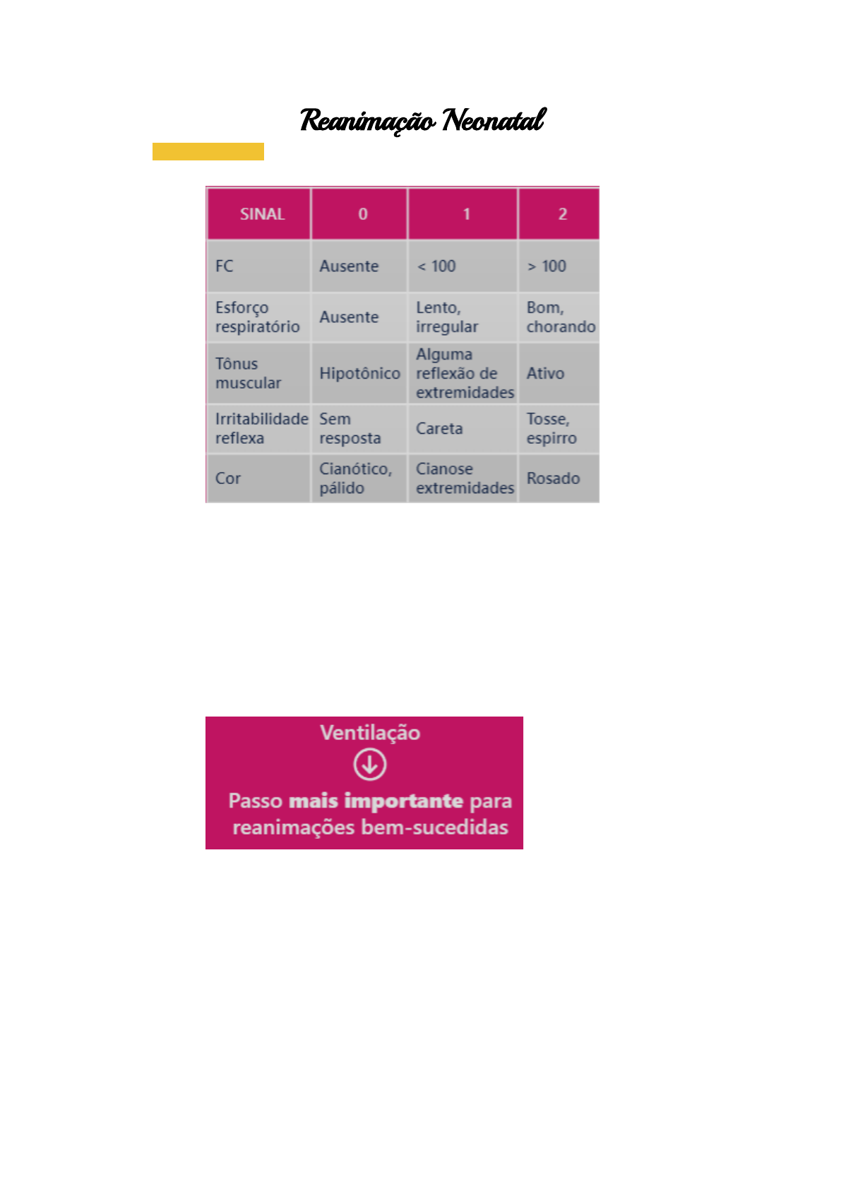 Reanimação Neonatal ● CAI NA PROVA: ○ Apgar: ○ Apgar do 1º X 5º minuto ■ geralmente no 1 minuto, o RN nunca nasce rosado. E por isso, o apgar ideal é de 9. E no 5 minuto, já estará rosado e o ideal é 10 pontos no apgar. ● Pegadinha: ○ Apgar: ■ não é utilizado para indicar a reanimação ■ permite avaliar a resposta das manobras ● Qual é a emergência mais comum na sala de parto? ○ R: Falha em iniciar e manter a respiração ● Dados: ● 3 perguntas: ○ 1- o neonato é a termo? ○ 2- está respirando ou chorando? ○ 3- tem bom tônus muscular? ○ Caso a resposta para uma ou mais das questões seja NÃO: ■ Categorias de ação em sequência ■ ABC da ressuscitação neonatal ● ABC da ressuscitação neonatal: ○ A - medidas iniciais de estabilização ○ B- ventilação ○ C- compressões torácicas (massagem cardíaca externa) ○ D- administrar adrenalina e/ou usar volume para expansão ○ A reanimação depende da avaliação simultânea de: respiração e frequência cardíaca ○ O RN deve ser capaz de: respirar regularmente e frequência cardíaca > 100 bpm ○ Frequência cardíaca avaliada por meio de: ausculta do precórdio e palpação do pulso (cordão umbilical) ○ Avaliação da coloração da pele e mucosas do RN: NÃO é mais utilizada para decidir procedimentos na sala de parto ○ Melhor momento do clampeamento do cordão umbilical? ■ Clampeamento tardio → benéfico em relação aos índices hematológicos na idade de 3 - 6 meses, etapa essa que pode elevar a necessidade de fototerapia. Assistência ao recém-nascido com necessidade de reanimação ● RN a termo, saudável: ○ RN a termo, posicionado sobre o abdome da mãe por 1 minuto (mínimo), antes de clampear o cordão umbilical. Ou seja, ja não tem mais limite final, como era de 1 a 3 minutos. ● Recém nascido é prematuro e apresenta boa vitalidade: ● Prematuro ou a termo, não está respirando e/ou apresenta-se hipotônico: ● Ressuscitação neonatal: ○ pacientes sem vitalidade adequada ao nascer precisam ser conduzidos à mesa de reanimação, indicando-se os seguintes passos: ■ prover calor ■ posicionar a cabeça ■ aspirar vias aéreas (se necessário) ■ secar ○ tais passos devem ser executados em, no máximo, 30 segundos. ○ Medidas iniciais de estabilização: ■ aquecer (RN sob fonte de calor) ■ posicionar a cabeça ■ aspirar vias aéreas (caso necessário) ■ secar ■ reposicionar ■ simultaneamente avaliar respiração e FC ○ 1º passo: manter a temperatura corporal ■ pré aquecer a sala de parto (temperatura ambiente de 23 a 26 graus) ■ manter a temperatura corporal em RN prematuro ● < 34 semanas ○ saco plastico ○ touca ■ manter a permeabilidade das vias aéreas ● posiciona a cabeça do recém-nascido ● Excesso de secreções nas vias aéreas: ○ AVAS (boca e, depois as narinas) ● Aspiração de vias aéreas: ○ pacientes que apresentam obstrução na respiração espontânea por secreções ○ necessidade de ventilação com pressão positiva (VPP) ● Ressuscitação: ○ após os cuidados iniciais: ■ respiração ineficaz ou FC < 100 BPM: ● iniciar VPP (bolsa + máscara) ■ esta precisa ser iniciada nos primeiros 60 segundos de vida (MINUTO DE OURO - “The golden minute”), ● Pegadinha: ○ Em um atendimento ao RN na sala de parto, após as medidas iniciais, a criança com um respiração irregular e ineficaz, além de uma FC = 40 bpm ■ qual o próximo passo? ■ suporte à ventilação ou massagem cardíaca? ● Equipamentos para a ventilação: ○ Balão auto inflável X ventilador mecânico manual em T ● Balão autoinflável: ○ baixo custo ○ não necessita de fonte de gás comprimido para funcionar ○ não fornece um pico de pressão inspiratória constante e/ou prolongado ○ não gera CPAP nem PEEP confiável ● Ventilador mecânico manual em T: ○ ventilação com pressão positiva com ventilador mecânico em T e máscara ○ usado cada vez mais na reanimação neonatal ○ há necessidade de uma fonte de gás comprimida ○ manuseio fácil ○ gera pressão inspiratória e PEEP constantes ○ permite a aplicação de CPAP nos pacientes que respiram espontaneamente ● Técnica da ventilação com balão e máscara: ○ FR: 40 a 60 irpm - “aperta / solta / solta / aperta…” ● Oxigênio suplementar: ○ idade gestacional > ou = 34 semanas ■ inicial a ventilação com ar ambiente ○ Nascidos com idade gestacional < 34 semanas: ■ concentração inicial de 30% (blender) ■ O2 suplementar guiado pela oximetria de pulso ● Oxímetro: ○ sensor neonatal no MSD ○ RN > ou = 34 semanas: região do pulso da radial ○ RN < 34 semanas: no pulso ou na palma da mão ○ Valores de saturação O2 pré-ductais desejáveis, segundo a idade: ○ RN > ou = 34 semanas não melhora e/ou não atinge os valores desejáveis de saturação de O2 → Oxigênio suplementar ● Mistura de O2 / ar (blender): ○ inicialmente O2 a 40% ● IMPORTANTE: ○ Qual é o sinal de que a ventilação está sendo útil na ressuscitação? ■ melhora da FC (> 100 bpm) ● Ventilação efetiva leva a: ○ elevação da FC ○ melhora do tônus muscular ○ respiração espontânea ● Falha após 30 segundo de VPP: ○ RN mantém FC < 100 bpm ou não retoma a respiração regular ● Falha na VPP: ○ corrigir técnica da ventilação ○ aumentar a oferta de oxigênio ○ intubação traqueal ● Técnica da ventilação com balão e cânula traqueal: ○ Indicações: ■ ventilação com máscara ineficaz ou prolongada ■ aplicação de massagem cardíaca e/ou de adrenalina ● Intubação orotraqueal: ○ A confirmação da cânula é obrigatória. Como fazê-lá? ■ condutas da prática: exemplo - ausculta e expansão do tórax ■ detecção de dióxido de carbono exalado é recomendada → capnógrafo (diminui o tempo para confirmar a posição da cânula) ○ Falha: ■ após 30 segundo de