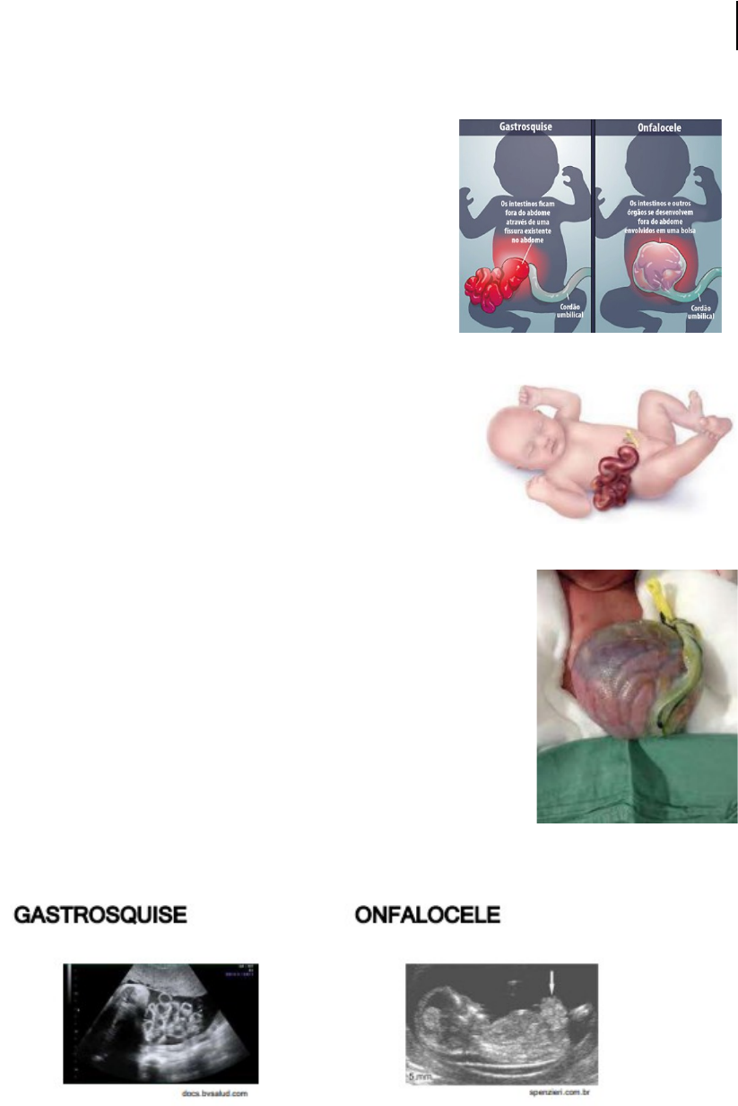 SMI II – PED GASTROSQUISE E ONFALOCELE 1 Gastrosquise e onfalocele 1. EMBRIOLOGIA · Parede abdominal se fecha na linha média por volta da 6ª semana de gestação. A gastrosquise acontece por falha neste fechamento. · Intestino médio faz uma herniação para fora do anel umbilical e continua a crescer. Por volta da 11ª semana de gestação retorna para cavidade abdominal e empreende rotação e fixação normais, juntamente com fechamento do cordão umbilical. O não retorno provoca a onfalocele. 2. GASTROSQUISE · 1:2000 · Herniação de vísceras, não cobertas por membrana, sempre do lado direito do anel umbilical e com cordão umbilical íntegro. · Em geral, é uma anomalia isolada. Mas em 17% dos casos tem alterações intestinais associadas, como atresias e anormalidades de rotação (problemas no próprio intestino). · Só 1,2% tem alteração cromossômica descrita. 3. ONFALOCELE · 1:4000 · Herniação de vísceras através do cordão umbilical. · Vísceras são recobertas pela membrana amniótica externamente e pelo peritônio internamente. · Mais de 50% dos RN têm anomalia cromossômica associada. · Também associada (20%) com outras anomalias – Sd. Beckwith-Wiedmann (onfalocele + macroglossia + gigantismo + hipoglicemia), Tetralogia de Fallot, defeitos de septo atrial, extrofia de bexiga, extrofia de cloaca, criptorquidia, anus imperfurado, mielomeningocele... 4. DIAGNÓSTICO PRÉ-NATAL · US obstétrico 20ª semana 5. MOMENTO E VIA DE PARTO · Assunto controverso – segue a gestação normalmente. · A obstrução intestinal intrauterina do intestino herniado pode produzir polidrâmnio na mãe, exigindo parto prematuro. · RN com gastrosquise pode necessitar de parto prematuro porque uma proporção significativa desenvolve sofrimento fetal. · O parto cesáreo eletivo precoce é considerado por alguns especialistas como benéfico para o bebê, pois evita a exposição do conteúdo da hérnia ao mecônio, que pode causar peritonite, serosite, aderências, obstrução, hipoperfusão e possivelmente dano isquêmico 6. ABORDAGEM INICIAL · UTI neonatal e Equipe de Cirurgia Pediátrica. · Suporte respiratório se necessário, manter a termorregulação e iniciar a hidratação de manutenção. · A proteção intestinal deve ser instituída imediatamente, especialmente em bebês sem cobertura de membrana amniótica, aplicando um envoltório estéril impregnado com solução salina (SF) sobre o defeito/conteúdo abdominal exteriorizado. · Pacientes com gastrosquise (defeito de parede) geralmente requerem administração de fluidos adicionais devido a extravazamento para terceiro espaço no conteúdo abdominal exposto, frequentemente edemaciado. · Uma sonda nasogástrica é colocada para descompressão gástrica e intestinal ao nascimento. 7. TRATAMENTO 7.1 Tratamento gastrosquise · Duas opções: fechamento primário imediato ou tardio (com colocação de silo). · 10% a 20% dos RNs com gastroquise podem apresentar as chamadas formas complicadas. Estes incluem aqueles com atresia intestinal associada, necrose ou perfuração, podendo exigir atenção cirúrgica imediata/em horas. · Entretanto, maioria dos casos de gastrosquise simples pode ser fechada primariamente de forma urgente no primeiro dia de vida (situação menos emergente do que nas formas complicadas, mas ainda assim a cirurgia deve ser realizada tão logo que possível). · Se a cavidade abdominal for hipoplásica devido à longa localização extra-abdominal dos órgãos intra-abdominais, um fechamento escalonado usando um silo na parede abdominal (protege as alças) permite ao cirurgião reduzir gradualmente o conteúdo da hérnia de volta para a cavidade abdominal sem pressão indevida e programar correção tardia. 1. Sutura da parede abdominal 2. Dispositivo que vai lentamente posicionando as alças para que não tenha problemas com síndrome compartimental. 7.2 Tratamento onfalocele · Há três opções de tratamento: fechamento primário, fechamento em etapas com colocação de silo ou fechamento após epitelização (como se fosse uma ferida fechando por segunda intenção) · Em defeitos pequenos (10cm) ou quando o RN prematuro tem disfunção respiratória, um agente esclerosante tópico pode ser aplicado temporariamente até que o tratamento definitivo seja possível. · O fechamento primário reduz o risco de contaminação bacteriana, sepse, acidose, hipotermia, mas pode ser difícil quando o tamanho da cavidade abdominal for limitado. Deve-se ter cuidado, a fim de evitar um aumento de pressão intra-abdominal excessivo. · A alça toda fica envolvida com o dispositivo e faz uma pressão para que as alças retornem para o abdome lentamente e seja possivel corrigir com a cirurgia. 8. PROGNÓSTICO · O prognóstico depende mais das anomalias cromossômicas ou anatômicas associadas do que das patologias em si. · Outro fator prognóstico importante é a prematuridade, comum nesses casos, principalmente na gastrosquise. · A sobrevida da onfalocele é cerca de 90%, enquanto a da gastrosquise ultrapassa os 90%. · A gastrosquise tem o prognóstico mais favorável dos defeitos de parede abdominal, uma vez que anomalias concomitantes fora do sistema gastrointestinal e cromossomopatias são raramente encontradas. Intestino da criança está todo pra fora do abdome. O generalista precisa conhecer a doença e tentar fazer o diagnóstico, uma vez que ele é clínico. Olhando assim, é gastroquise ou onfalocele. Nesse caso é um defeito de parede, chamado gastrosquise. PÂMELA MARTIS BUENO