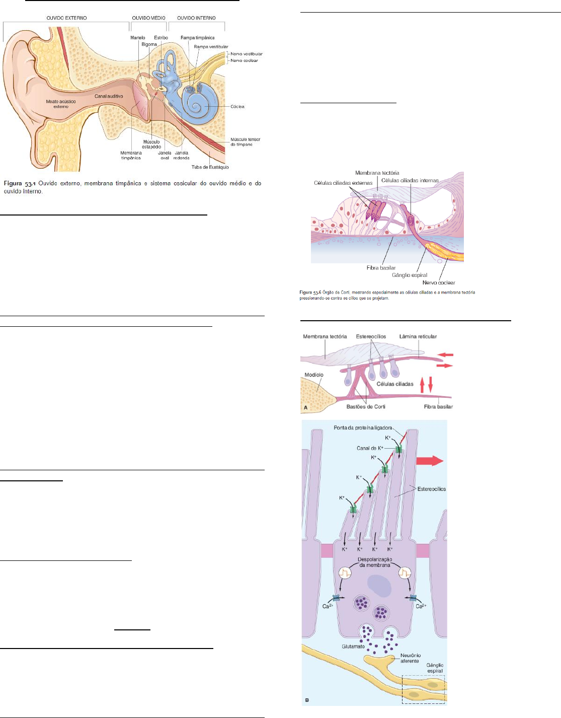 Capítulo 53 – Guyton O Sentido da Audição Giovanna Gabriele MEMBRANA TIMPÂNICA E O SISTEMA OSSICULAR Condução do som da membrana timpânica para a cóclea A membrana timpânica tem a forma de cone e o cabo do martelo está fixado no seu centro. A cadeia ossicular também inclui a bigorna, que está ligada ao martelo por meio de ligamentos e, por isso, os dois ossos se movem juntos quando a membrana timpânica vibra. Na sua outra extremidade, a bigorna se articula com o estribo, que, por sua vez, está ligado à janela do vestíbulo do labirinto membranáceo. O músculo tensor do tímpano, ligado ao martelo, mantém a membrana timpânica tensa. O casamento de impedâncias entre as ondas sonoras no ar e as ondas sonoras no líquido coclear é mediado pela cadeia ossicular A cadeia ossicular não amplifica as ondas sonoras pelo aumento do movimento do estribo. Como a área da membrana timpânica é tão grande em relação à área de superfície da janela do vestíbulo o sistema de alavanca multiplica a pressão da onda sonora exercida contra a membrana timpânica por um fator de 22. O líquido no labirinto membranáceo tem inércia muito maior do que no ar; a amplificação adicional da pressão pela cadeia ossicular é necessária para provocar a vibração do líquido. Juntos, a membrana timpânica e os ossículos fornecem um casamento de impedância entre as ondas sonoras no ar e as vibrações do som no líquido do labirinto membranáceo. Na ausência de uma cadeia ossicular funcionante, os sons normais são quase imperceptíveis. A contração dos músculos estapédio e tensor do tímpano atenua a condução do som Quando sons extremamente altos são transmitidos através da cadeia ossicular, um reflexo de amortecimento do martelo é acionado pelo músculo estapédio, que atua como antagonista do músculo tensor do tímpano. Desse modo, a rigidez do ossicular cadeia aumenta e a condução do som, particularmente em frequências baixas, diminui bastante. Transmissão do som através do osso Como a cóclea está dentro do osso, a vibração do crânio pode estimular a cóclea. No entanto, até mesmo sons relativamente altos no ar não têm energia suficiente para permitir audição efetiva através da condução óssea. CÓCLEA Transmissão de ondas sonoras na cóclea – “onda viajante” Quando uma onda sonora atinge a membrana timpânica, os ossículos se movimentam e a base do estribo é empurrada para dentro do labirinto membranáceo na janela oval. Essa ação inicia uma onda sonora que viaja ao longo da membrana basilar em direção ao helicotrema. Os padrões de vibração são induzidos por diferentes frequências sonoras O padrão de vibração iniciado na membrana basilar varia de acordo com as diferentes frequências sonoras. Cada onda é relativamente fraca em seu início, porém se torna mais forte na parte da membrana basilar que tem uma frequência de ressonância igual à da onda sonora. A onda “morre” essencialmente fora deste ponto e não afeta o restante da membrana basilar. Além disso, a velocidade de propagação da onda sonora é maior perto da janela oval; em seguida, diminui gradualmente à medida que prossegue em direção ao helicotrema. Os padrões de vibração são induzidos por diferentes amplitudes de som A amplitude máxima de vibração da frequência sonora se propagada de forma organizada sobre a superfície da membrana basilar. Por exemplo, a vibração máxima de um som de 8.000 ciclos/s (Hertz [Hz]) ocorre perto da janela oval, enquanto a vibração máxima deum som de 200 Hz está localizada perto do helicotrema. O principal método para a discriminação do som é o “local” da vibração máxima da membrana basilar para esse som. Função do Órgão de Corti O órgão de Corti possui dois tipos de células receptoras: a células ciliadas internas e as células ciliadas externas. Aproximadamente 95% das fibras sensitivas do oitavo nervo craniano, que inerva a cóclea, constituem contato sináptico com as células ciliadas internas. Os corpos celulares das fibras sensitivas se localizam no gânglio espiral, o qual está localizado no modíolo ósseo (o centro), que serve como suporte para a membrana basilar em uma das suas extremidades. Os processos centrais dessas células ganglionares entram no tronco encefálico, na medula rostral, para estabelecer sinapses nos núcleos cocleares. A vibração da membrana basilar excita as células ciliadas A superfície apical das células ciliadas dá origem a muitos estereocílios e a um único cinocílio que se projetam para cima na membrana tectória sobrejacente. Quando a basilar membrana vibra, os cílios das células ciliadas incorporadas na membrana tectória são inclinados em uma direção e, em seguida, na outra direção. Mecanicamente, esse movimento abre os canais iônicos, levando à despolarização ou à hiperpolarização da célula ciliada, dependendo da direção da inclinação. Legenda: A -> estimulação das células ciliadas pelo movimento de vaivém dos cílios que se projetam no revestimento de gel da membrana tectória. B -> transdução da energia mecânica em sinais neurais pelas células ciliadas. Quando os estereocílios se curvam na direção dos mais longos, os canais de K+ se abrem, provocando a despolarização, que, por sua vez, abre os canais de Ca2+ dependentes de voltagem. O influxo de Ca2+ aumenta a despolarização e induz a liberação do glutamato, que despolariza o nervo sensorial. Os potenciais receptores das células ciliadas ativam as fibras do nervo coclear Em torno de 100 cílios se projetam da superfície apical das células ciliadas e aumentam progressivamente de comprimento desde a região de fixação na membrana basilar em direção ao modíolo. O mais longo desses cílios é referido como um cinocílio. Quando os estereocílios são inclinados em relação ao quinocílio, os canais de potássio na membrana da célula ciliadas são aberto