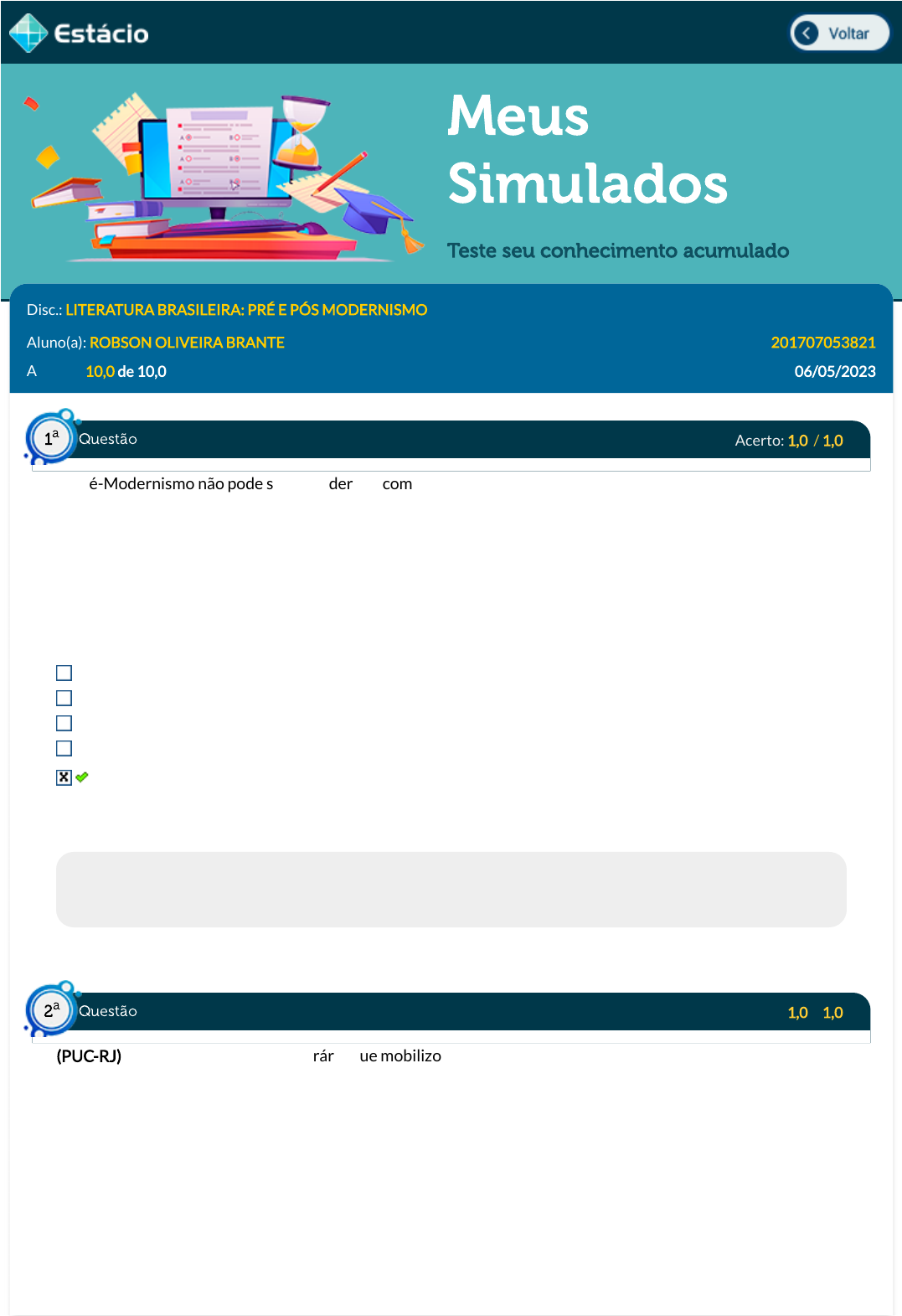 06/05/2023, 15:40 Estácio: Alunos https://simulado.estacio.br/bdq_simulados_avaliacao_parcial_resultado.asp?cod_hist_prova=307792701&cod_prova=6262473165&f_cod_disc= 1/6 Meus Simulados Teste seu conhecimento acumulado Disc.: LITERATURA BRASILEIRA: PRÉ E PÓS MODERNISMO Aluno(a): ROBSON OLIVEIRA BRANTE 201707053821 Acertos: 10,0 de 10,0 06/05/2023 Acerto: 1,0 / 1,0 O Pré-Modernismo não pode ser considerado como uma escola literária no sentido de uma tendência estética compartilhada por todos os escritores da época, mas é possível identi�car pontos em comum entre as obras do período. Assinale o aspecto que NÃO se aplica ao Pré-Modernismo Inclinação regionalista Interesse em expor e denunciar uma realidade brasileira Acentuada ligação com os fatos políticos Interesse especial pelos tipos humanos marginalizados Subjetividade poética Respondido em 06/05/2023 15:12:22 Explicação: Não se observam textos líricos ou que apresentem subjetividade signi�cativa no Pré-Modernismo Acerto: 1,0 / 1,0 (PUC-RJ) O movimento artístico-literário que mobilizou parcela signi�cativa da intelectualidade brasileira durante a década de 20 e procurou romper com os padrões europeus da criação tinha como proposta: I. a tentativa de buscar um conteúdo mais popular para a problemática presente nas diferentes formas de manifestação artística. II. a tentativa de recuperação das idealizações românticas ligadas à temática do índio brasileiro. III. a valorização do passado colonial, ressaltada a in�uência portuguesa sobre a nossa sintaxe. IV. a tentativa de constituição, no campo das artes, da problemática da nacionalidade, ressaltadas as peculiaridades do povo brasileiro. V. a desvalorização da problemática regionalista, contida nas lendas e mitos brasileiros. Sobre as a�rmações acima, assinale a opção correta. Questão1 a Questão2 a https://simulado.estacio.br/alunos/inicio.asp javascript:voltar(); 06/05/2023, 15:40 Estácio: Alunos https://simulado.estacio.br/bdq_simulados_avaliacao_parcial_resultado.asp?cod_hist_prova=307792701&cod_prova=6262473165&f_cod_disc= 2/6 somente as a�rmativas I e IV estão corretas. somente as a�rmativas II e III estão corretas. somente as a�rmativas I e III estão corretas. somente as a�rmativas II e V estão corretas. somente as a�rmativas I e V estão corretas. Respondido em 06/05/2023 15:39:07 Explicação: O Modernismo procurou aproximar a arte da língua falada no Brasil. Além disso, primou pela valorização da nacionalidade. Acerto: 1,0 / 1,0 É correto a�rmar sobre a poesia da segunda fase modernista: tematizou sobre questões sociais e existenciais. preocupou-se somente com a forma. tematizou sobre a questão agrária. mostrou-se alheia às questões sociais. valorizou o soneto. Respondido em 06/05/2023 15:36:15 Explicação: "A poesia não mais apresenta a irreverência da primeira fase, há recusa do poema-piada e os poetas optam por temas e técnicas mais elaboradas, com sagacidade de pensamento. É uma poesia engajada, preocupada com o difícil momento de nosso país. Há tendência para os temas religiosos, sociais, metafísicos e espiritualistas" ( Livro proprietário, p.64) Gabarito Comentado Gabarito Comentado Acerto: 1,0 / 1,0 A partir do fragmento apresentado, que foi extraído do auto de Natal Morte e Vida Severina, identifique qual é a sina do sertanejo. (...)Somos muitos Severinos iguais em tudo e na sina: a de abrandar estas pedras suando-se muito em cima, a de tentar despertar terra sempre mais extinta,(...) a de querer arrancar algum roçado da cinza. http://www.releituras.com/joaocabral_morte.asp Questão3 a Questão4 a 06/05/2023, 15:40 Estácio: Alunos https://simulado.estacio.br/bdq_simulados_avaliacao_parcial_resultado.asp?cod_hist_prova=307792701&cod_prova=6262473165&f_cod_disc= 3/6 Trabalhar para dividir os frutos com aqueles que habitam a mesma região. Trabalhar sem objetivo algum. Trabalhar, arduamente, para fazer brotar da terra seca algo para sua sobrevivência. Caminhar pelas pedras do sertão Não trabalhar na região por falta de esperança, pois a terra já havia se transformado em cinza. Respondido em 06/05/2023 15:34:10 Explicação: Nos versos: "(...)a de abrandar estas pedras/suando-se muito em cima,/a de tentar despertar?terra sempre mais extinta,(...)/a de querer arrancar/algum roçado da cinza"., vemos claramente o objetivo do sertanejo: roçar a terra árida para dela extrair algum alimento. Gabarito Comentado Acerto: 1,0 / 1,0 (Faculdade Dom Bosco -2018) Sobre Macunaíma, de Mário de Andrade, não se pode a�rmar que a obra apresenta uma mistura de lendas indígenas, crendices, anedotas e observações pessoais da vida cotidiana brasileira. a obra traz para o campo da arte inovações de linguagem, como o ritmo, o léxico e a sintaxe coloquial para a escrita. a personagem Macunaíma sintetiza o caráter nacional brasileiro do início do século. assim como a personagem Macunaíma passa por uma série de metamorfoses, a linguagem também se transforma ao longo da obra. a história se passa inteiramente na �oresta Amazônica, onde Macunaíma passa toda sua vida ao lado dos irmãos Maanape e Jiguê. Respondido em 06/05/2023 15:33:15 Explicação: A narrativa se passa na �oresta amazônica, mas também no Rio de Janeiro e em São Paulo. Acerto: 1,0 / 1,0 Clarice Lispector utiliza em suas obras dois aspectos inovadores: o �uxo da consciência e a epifania o fantástico e a paródia o �uxo da consciência e o humor o bifrontismo e e a paródia o humor e a paródia Respondido em 06/05/2023 15:28:11 Questão5 a Questão6 a 06/05/2023, 15:40 Estácio: Alunos https://simulado.estacio.br/bdq_simulados_avaliacao_parcial_resultado.asp?cod_hist_prova=307792701&cod_prova=6262473165&f_cod_disc= 4/6 Explicação: Além da linguagem, outro aspecto inovador da prosa de Clarice Lispector é o �uxo da consciência. Para alguns teóricos, é uma experiência muito mais radi