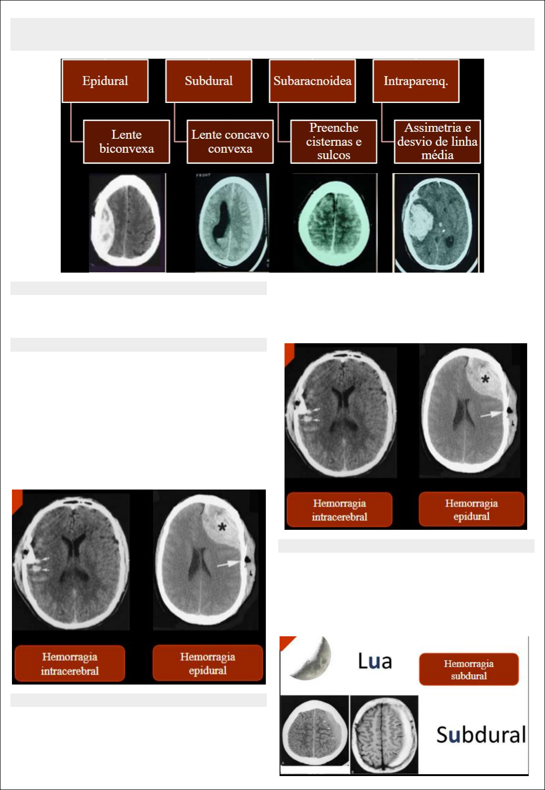 @anabea.rs | Ana Beatriz Rodrigues HEMORRAGIA DEFINIÇÃO Hemorragia é a perda súbita de sangue, originada pelo rompimento de um ou mais vasos sanguíneos. HEMATOMA INTRACEREBRAL Os hematomas intracerebrais tendem a apresentar menos edema circundante do que as contusões corticais, pois representam sangramento em áreas cerebrais relativamente normais. A maioria dos hematomas intracerebrais se localiza na substância branca da região frontotemporal, embora também tenham sido descritos nos núcleos da base. Muitas vezes, estão associados a fraturas cranianas e outras lesões neuronais primárias, incluindo contusões e LAD. HEMATOMA EPIDURAL A maioria dos hematomas epidurais se localiza na região temporal ou temporoparietal, embora também possam surgir hematomas nas regiões frontal e occipital. Hematomas epidurais venosos são menos comuns que arteriais e tendem a ocorrer no vértice, na fossa posterior ou no aspecto anterior da fossa craniana média. Geralmente, hematomas venosos ocorrem como resultado da ruptura dos seios venosos durais. HEMATOMA SUBDURAL Tipicamente, é de origem venosa, resultado do estiramento ou rompimento de veias corticais que atravessam o espaço subdural em seu caminho até os seios durais. Pode também ser consequência do rompimento de ramos penetrantes de artérias cerebrais superficiais. @anabea.rs | Ana Beatriz Rodrigues HEMORRAGIA SUBARACNÓIDEA É comumente encontrada em lesões cranianas; porém, raramente é substancial o suficiente para causar efeito expansivo significativo. A hemorragia resulta do rompimento de pequenos vasos subaracnoides ou da extensão até o espaço subaracnoide de uma contusão ou hematoma. Na TC, a hemorragia subaracnóidea aparece como áreas de alta atenuação nas cisternas e nos sulcos. LESÃO AXÔNICA DIFUSA É um dos tipos mais comuns de lesão neuronal primária em pacientes com traumatismo craniano grave. Como o próprio nome diz, a lesão axônica difusa (LAD) se caracteriza por comprometimento disseminado dos axônios, que ocorre no momento de uma lesão por aceleração ou desaceleração. EDEMA