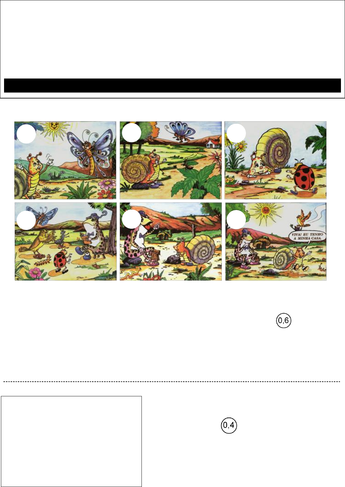 ESCOLA _____________________________________ PROVA BIMESTRAL DE PORTUGUÊS Nome: ________________________________________________________ 2º Ano Professora: ___________________________ Data: __/ 09/ 2018 Valor: 10,0 pontos Nota: _______ pontos Conceito: _______ De 8,0 a 10,0 pontos = A De 6,0 a 7,9 pontos = B De 0 a 5,9 pontos = C Observe algumas cenas do livro Caraoquê, o caracol: 1) Agora, marque com um X as frases que são verdadeiras em relação às cenas da história Caraoquê, o caracol: ( ) Caraoquê sempre foi um caracol feliz. ( ) Caraoquê conversou com o doutor Sapo. ( ) Os animais foram pedir ajuda ao doutor Sapo. ( ) Caraoquê queria ter asas como a borboleta azul. ( ) Mesmo conversando com o doutor Sapo, Caraoquê não conseguiu ficar feliz. ( ) A joaninha e Caraoquê foram passear na casa do doutor Sapo. Leia o texto abaixo e marque a resposta certa: A CASA E O SEU DONO Essa casa é de caco Quem mora nela é o macaco. Essa casa tão bonita Quem mora nela é a cabrita. Essa casa é de cimento. Quem mora nela é o jumento. Essa casa é de lata Quem mora nela é a barata. 2) Quem mora na casa bonita é: ( ) o macaco. ( ) a cabrita. ( ) o jumento. ( ) a barata. 1 2 3 4 5 6 3) Leia o texto e faça um (X) nas frases verdadeiras: O BURRINHO TEIMOSO Renato tem um burrinho que se chama Barroso. O burrinho adora fugir escondido. Um dia, Barroso pulou a cerca e correu para o morro. Renato pegou o burrinho e amarrou em uma árvore. Renato falou para Barroso: ― Que burrinho teimoso! ( ) Barroso é um burrinho teimoso. ( ) Renato levou o burrinho para o morro. ( ) Renato falou que burrinho manhoso. ( ) Depois de pular a cerca, o burrinho correu para o morro. ( ) O burrinho Renato é teimoso. ( ) Renato amarrou o burrinho na árvore. Leia o texto e marque a resposta certa: A FOCA FILOMENA Filomena é uma foca de circo. Fabiano é o domador da foca. Cada vez que ela fica com a bola no nariz, Fabiano lhe dá um peixe. A meninada vê Filomena com a bola e pede “bis”. Ela repete o que fez, dá uma rebolada e sai com um peixe na boca toda feliz! Depois ela vai descansar, para mais tarde fazer outro espetáculo. 4) Na frase “A meninada vê Filomena com a bola e pede bis.”, a palavra BIS significa que as crianças: ( ) gostaram tanto do que Filomena fez que quer ver de novo. ( ) não acharam graça no que Filomena fez e elas querem que a foca vá embora. ( ) preferem ver outro animal fazendo esta apresentação. ( ) batem palmas sem parar. Leia o texto e marque a resposta certa: O RATO RICOTE Ricote é um rato muito levado! Ele mora no porão de uma casa, dentro de um rádio velho. Ricote sai à noite e faz cada uma! Ricote rói tudo o que vê. Ele já roeu o roupão da Renata, a caixa de remédio de Rui, o livro do João, a rede da varanda,... Se ele ouve um ruído, ele perde até o rumo. Ah, rato Ricote, pare de ter fricote! 5) Ricote é um rato muito levado que roeu o roupão: ( ) da Renata. ( ) do Rui. ( ) do João. ( ) que estava na rede. 6) Observe a cena abaixo e marque a frase que a representa: ( ) Lucas gosta de balançar no galho da árvore. ( ) João vê a árvore e fica muito feliz. ( ) Carlos gosta de ver os peixes no rio. Leia o texto abaixo e marque a resposta certa: O rato roeu a roupa do rei de Roma, O rato roeu a roupa do rei da Rússia, O rato roeu o rabo do rodovalho... O rato a roer roía. E a rosa Rita Ramalho Do rato a roer se ria! 7) Este texto é: ( ) uma piada. ( ) uma receita. ( ) um trava-língua. ( ) um bilhete. 8) Quem ria do rato? ( ) O rei da Rússia. ( ) Rita Ramalho. ( ) O rei de Roma. ( ) o gato. Leia o texto abaixo e marque a resposta certa: A TARTARUGA E O COELHO A tartaruga resolveu apostar uma corrida com o coelho. A corrida começou. O coelho saiu na frente e nem enxergou a tartaruga. “Acho que posso dormir um pouco. Ela vai demorar para me alcançar”, pensou o coelho. O coelho pegou no sono e nem viu a tartaruga passar. ― Venci! Venci! – gritava a tartaruga. 9) O coelho dormiu um pouco durante a corrida porque: ( ) ele achava a tartaruga muito lenta. ( ) ele ganhava a corrida de todos os animais da floresta. ( ) ele era muito preguiçoso e vivia dormindo a toda hora. ( ) ele viu que a tartaruga estava muito cansada. 10) É a última palavra do 3º parágrafo: ( ) coelho. ( ) começou. ( ) passar. ( ) tartaruga. Leia o texto do quadro e marque a resposta certa: 11) O primeiro passo da receita é: ( ) bater os ingredientes no liquidificador. ( ) tomar o suco. ( ) bata o açúcar com a manteiga. ( ) tirar as sementes dos limões. 12) Esta receita ensina fazer: ( ) uma torta de morango. ( ) um bolo. ( ) uma bolacha de leite. ( ) um pão de padaria. 13) Complete a cruzadinha, escrevendo o nome dos desenhos: 1 2 3 4 1- 2- 3- 4- 5 6 7 8 5- 6- 7- 8- Leia a frase do quadro abaixo: Chico Bento é um menino muito animado que sabe tocar sua sanfona muito bem. 14) Esta frase tem: ( ) 11 palavras. ( ) 12 palavras. ( ) 13 palavras. ( ) 14 palavras. 15) Procure, no caça-palavras, o nome dos desenhos abaixo: G L A M P E Ã O R O A Z A C H I Q U I N H A A G E L A D E I R A O V A R E L Ó G I O Q D C R P I T Á R V O R E T T E G U I T A R R A H I P O P Ó T A M O H D X C H I Q U I N H A Y A F E G Ê M E O S A Z G I R A F A I O E R C A P C H U P E T A O 16) Forme frases com o nome dos desenhos abaixo: 17) Ditado de palavras e frases: 1- 5- 9- 2- 6- 10- 3- 7- 11- 4- 8- 12- 1- 2- 3- 18) Observe as cenas e faça uma produção de texto:
