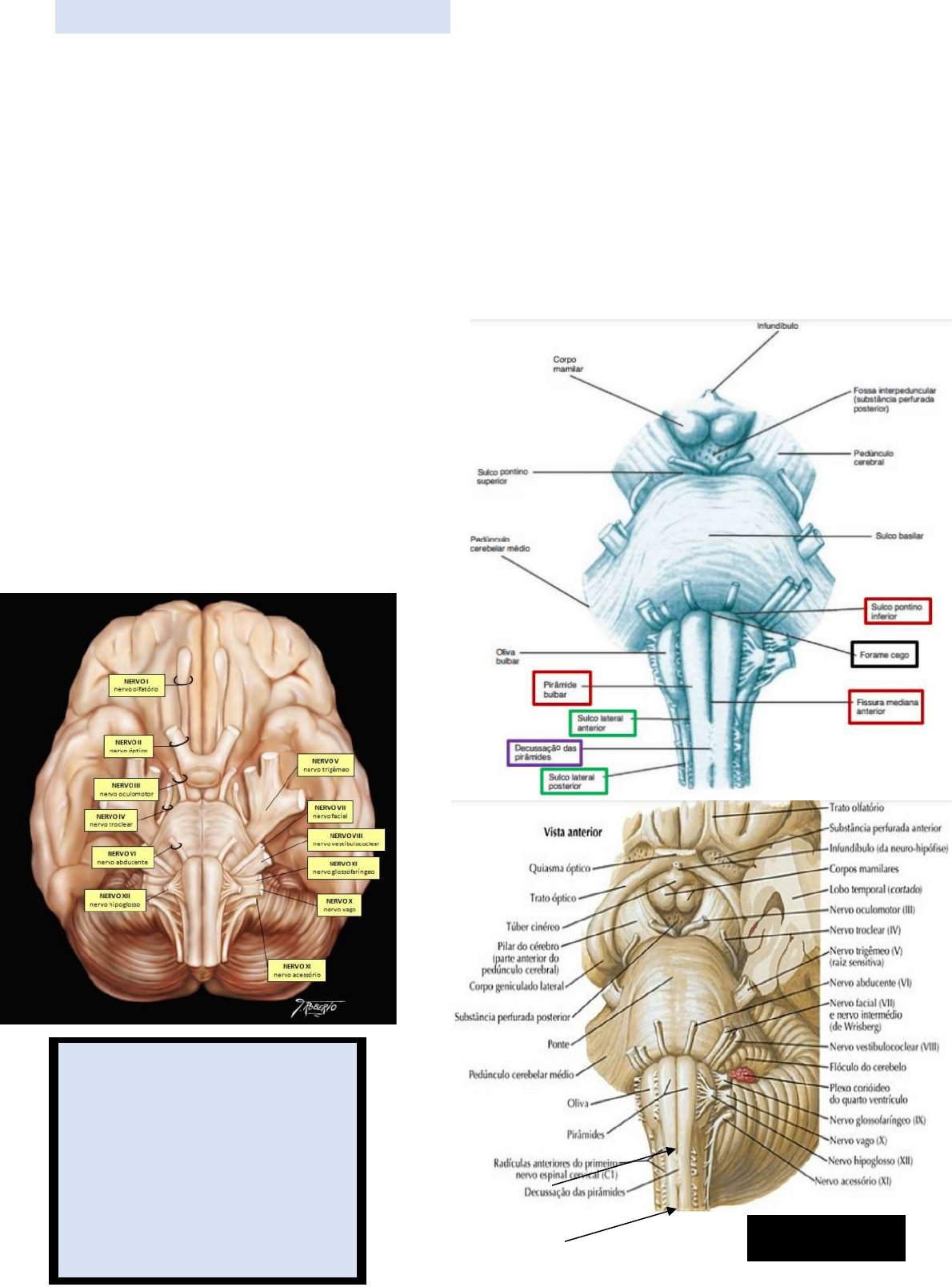 Tronco encefálico Também chamado de tronco cerebral, localiza-se sobre a parte basal do osso occipital, sendo mais anterior à fossa intracraniana posterior, e vai desde a medula espinal até o diencéfalo. Inferior ao cérebro e anterior ao cerebelo. De baixo para cima temos: bulbo, ponte e mesencéfalo. Plano transversal 3 divisões internas: teto, tegmento e base. Apresentam núcleos associados aos 10 pares de nervos cranianos (III ao XII); Contém matriz de neurônios: formação reticular Origens embriológicas: mesencéfalo, rombencéfalo metencéfalo (ponte) mielencéfalo (bulbo) Bulbo Origem: mielencéfalo Formato: cone Localização: região caudal do tronco encefálico e rostral da medula espinal, Divisão: porção caudal ou fechada e porção rostral ou aberta, com base na ausência ou presença do quarto ventrículo. Vista anterior Pirâmides: Fibras descendentes que ligam áreas motoras do cérebro aos neurônios motores da medula. Decussação das pirâmides: fibras que cruzam obliquamente o plano mediano e se encontram na fissura mediana. Olivas: formadas por uma grande massa de substância cinzenta. Envolvidas na aprendizagem motora. O sulco pontino inferior = sulco bulbopontino Vista posterior Conduz impulsos nervosos provenientes dos MMSS e Tronco Superior. Conduz impulsos nervosos provenientes dos MMII e Tronco Inferior Emergem do sulco lateral posterior Emergem do sulco lateral anterior Internamente Ponte Parte do meio do tronco encefálico. Anterior ao cerebelo, superior ao bulbo e inferior ao mesencéfalo. Sulco basilar Sulco pontino inferior Sulco pontino superior Braço da ponte Eminência pontina Vista posterior A ponte é formada por uma parte ventral, ou base da ponte e uma parte dorsal ou tegmento da ponte. O tegmento da ponte tem estrutura muito semelhante ao bulbo e ao tegmento do mesencéfalo. Já a base da ponte tem estrutura muito diferente das outras áreas do tronco encefálico. Tegmento: -núcleos do nervo vestibulococlear; -núcleos dos nervos facial e abducente; - núcleo salivatório superior e núcleo lacrimal; -núcleos do nervo trigêmeo; -fibras longitudinais do tegmento da ponte; Mesencéfalo 1 - Região rostral da fossa rombóide; 2 - área vestibular; 3 - sulco limitante; 4- eminência medial; 5 -recessos laterais; 6 -colículo facial; 7 -forames laterais (de Luschka); 8 -abertura inferior do aqueduto do mesencéfalo; Pedúnculo cerebelar superior Pedúnculo cerebelar médio Pedúnculo cerebelar inferior Localiza-se rostralmente à ponte, estendendo-se superiormente até o diencéfalo e o terceiro ventrículo. Separa-se da ponte pelo sulco pontomesencefálico, ou pontino superior, e do cérebro por um plano que liga os corpos mamilares, pertencentes ao diencéfalo, à comissura posterior. Lâmina quadrigêmea Referências