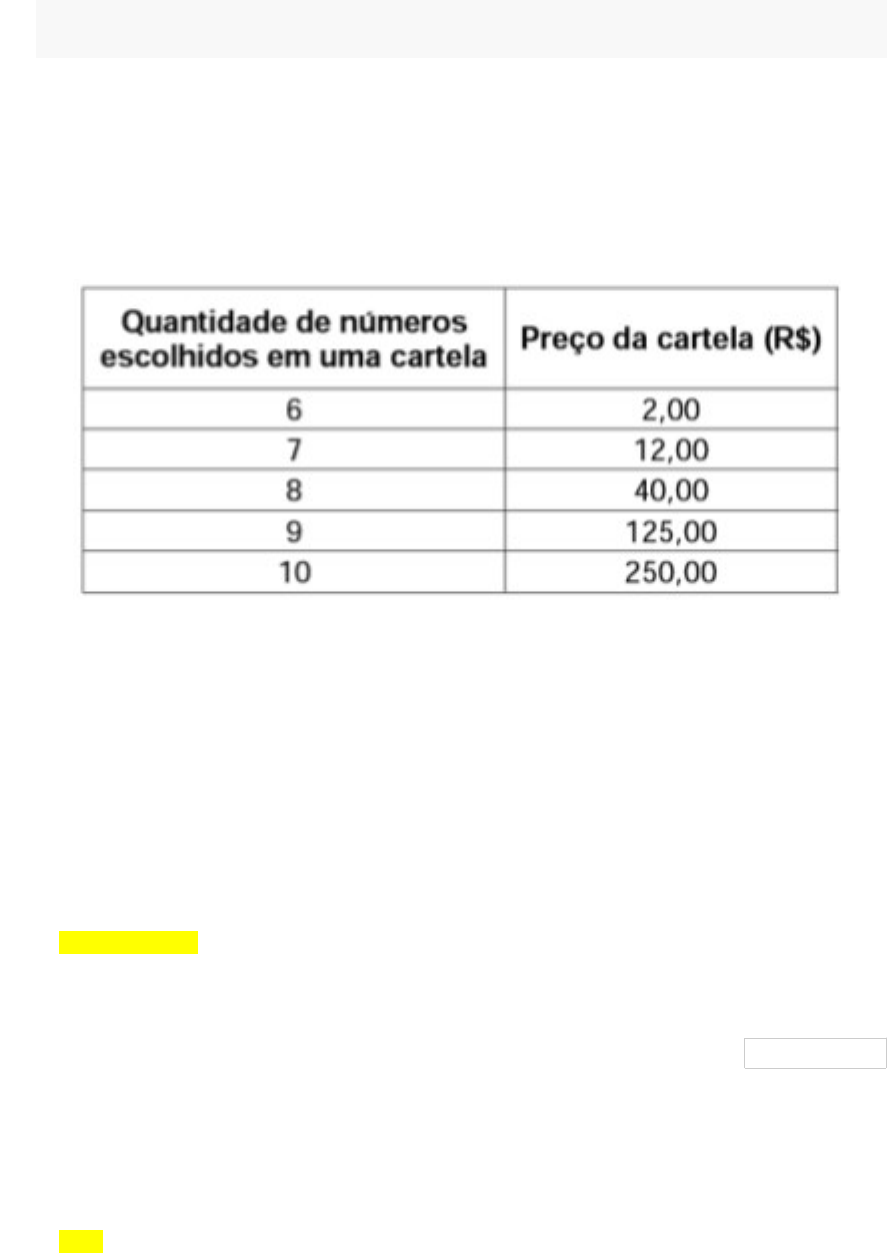 VERIFICAÇÃO DE APRENDIZAGEM: COMBINAÇÕES PERGUNTA 1 1. Considere o seguinte jogo de apostas: "Numa cartela com 60 números disponíveis, um apostador escolhe de 6 a 10 números. Dentre os números disponíveis, serão sorteados apenas 6. O apostador será premiado caso os 6 números sorteados estejam entre os números escolhidos por ele numa mesma cartela." A figura apresenta o preço de cada cartela, de acordo com a quantidade de números escolhidos. Cinco apostadores, cada um com 500,00 para apostar, fizeram as seguintes opções: Arthur: 250 cartelas com 6 números escolhidos; Bruno: 41 cartelas com 7 números escolhidos e 4 cartelas com 6 números escolhidos; Caio: 12 cartelas com 8 números escolhidos e 10 cartelas com 6 números escolhidos; Douglas: 4 cartelas com 9 números escolhidos; Eduardo: 2 cartelas com 10 números escolhidos. Os dois apostadores com maiores probabilidades de serem premiados são: a. n. d. a b. Arthur e Eduardo c. Douglas e Eduardo d. Caio e Eduardo e. Bruno e Caio 0,25 pontos PERGUNTA 2 As 14 crianças de uma família serão separadas em grupos de 5, para que elas arrecadem prendas para a quermesse da fazenda onde vivem. De quantas maneiras as crianças poderão ser agrupadas? a. 1500 b. 2002 c. 2005 d. 1800 0,25 pontos PERGUNTA 3 Em um refeitório há doces e salgados. Cada pessoa receberá um recipiente com 3 doces, dos 8 tipos disponíveis, e apenas 2 salgados, dos 7 tipos fabricados. Quantas são as diferentes possibilidades de preenchimento do recipiente? a. 77 b. n. d. a. c. 9.240 d. 14.112 e. 1.176 0,25 pontos PERGUNTA 4 Com 12 bolas de cores distintas, posso separá-las de quantos modos diferentes em saquinhos, se o fizer colocando 4 bolas em cada saco? a. 300 b. 495 c. 250 d. 400 0,25 pontos Clique em Salvar e Enviar para salvar e enviar. Clique em Salvar todas as respostas para salvar todas as respostas. Parte inferior do formulário