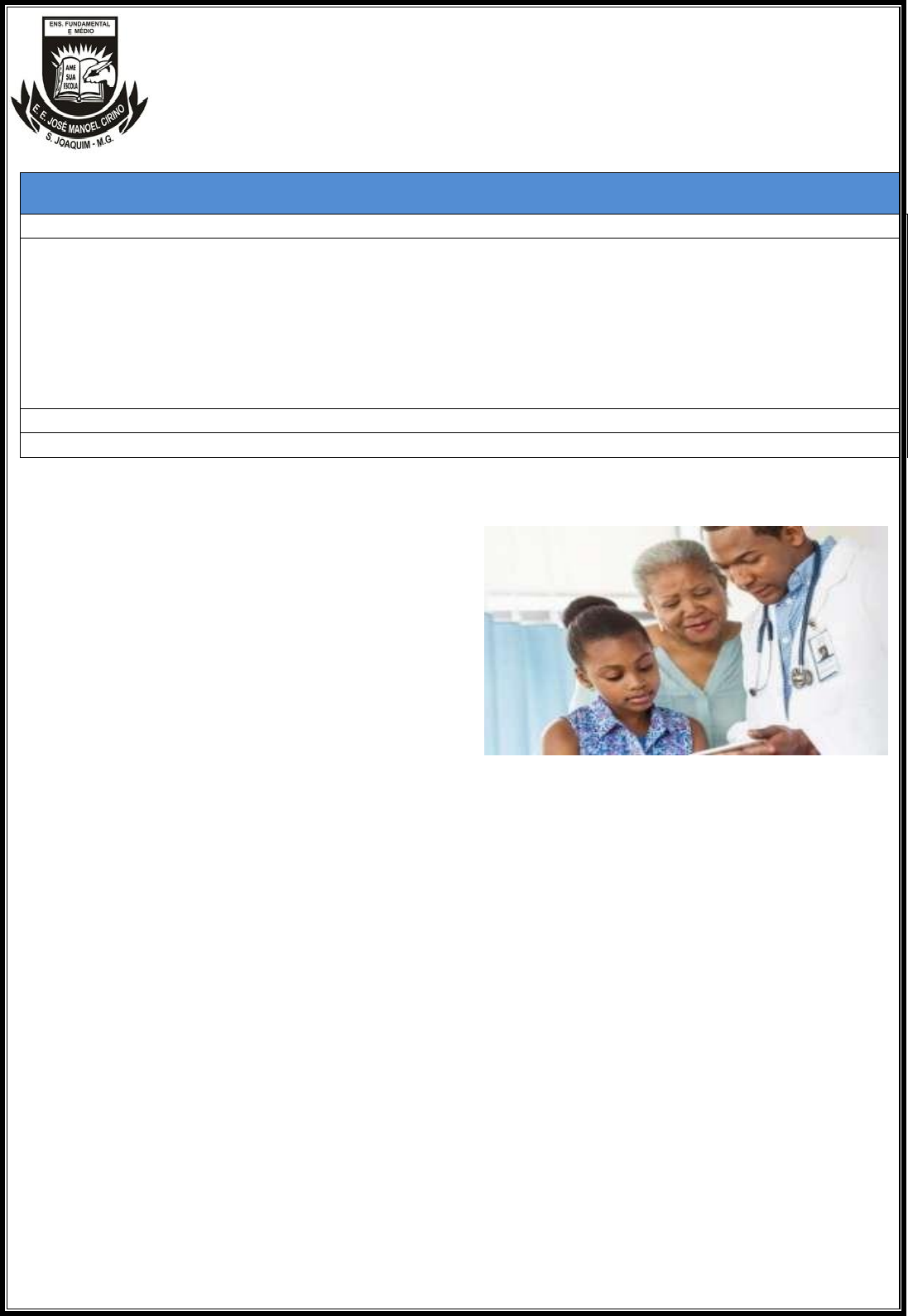 DE ESTADO DE EDUCAÇÃO SUPERINTENDÊNCIA REGIONAL DE ENSINO – JANUÁRIA – MG SECRETARIA ESCOLA ESTADUAL JOSÉ MANOELCIRINO ENSINO FUNDAMENTAL E MÉDIO escola.6269@ededucacão.mg.gov.br A TEXO COM ATIVIDADE ARTES VISUAIS 2022 NOME DO ALUNO:_________________________________ PROFESSOR: JULIAN DERSON TURMA:__ANO ENSINO FUNDAMENTAL DATA:____/____/_____ SEMANA 1 TEMA DO 1º BIMESTRE: Compreendendo o SUS e as estratégias de saúde no âmbito escolar HABILIDADE ASSOCIADA ÀS COMPETÊNCIAS GERAIS DA BNCC: (EMIFCG01) Identificar, selecionar, processar e analisar dados, fatos e evidências com curiosidade, atenção, criticidade e ética, inclusive utilizando o apoio de tecnologias digitais. HABILIDADE ESPECÍFICA: (EMIFLGG001) Investigar e analisar a organização, o funcionamento e/ou os efeitos de sentido de enunciados e discursos materializados nas diversas línguas e linguagens (imagens estáticas e em movimento; música; linguagens corporais e do movimentos, entre outras), situando-os no contexto de um ou mais campos de atuação social e considerando dados e informações disponíveis em diferentes mídias. CONTEÚDOS RELACIONADOS: Linguagem e suas Tecnologias INTERDISCIPLINARIDADE: Língua Portuguesa, Sociologia Estamos começando os estudos da primeira semana do conteúdo Práticas Comunicativas e Criativas. Você irá conhecer a importância do direito à saúde e compreender como isso interfere na qualidade de vida de todo cidadão.ATIVIDADES INSTRUÇÃO: Leia o texto a seguir para responder às questões de 01 a 03. Texto I Direito à saúde A saúde consta na Declaração Universal dos Direitos Humanos, 1948, no artigo XXV, que define que todo ser humano tem direito a um padrão de vida capaz de assegurar lhe e a sua família, saúde e bem-estar, inclusive alimentação, vestuário, habitação, cuidados médicos e os serviços sociais indispensáveis. Ou seja, o direito à saúde é indissociável(inseparavél,juntos,unidos) do direito à vida, que tem por inspiração o valor de igualdade entre as pessoas. No contexto brasileiro, o direito à saúde foi uma conquista do movimento da Reforma Sanitária, refletindo na criação do Sistema Único de Saúde (SUS) pela Constituição Federal de 1988, cujo artigo 196 dispõe que A saúde é direito de todos e dever do Estado, garantido mediante políticas sociais e econômicas que visem à redução do risco de doença e de outros agravos e ao acesso universal e igualitário às ações e serviços para a promoção, proteção e recuperação”. No entanto, direito à saúde não se restringe apenas a poder ser atendido no hospital ou em unidades básicas. Embora o acesso a serviços tenha relevância, como direito fundamental, o direito à saúde implica também na garantia ampla de qualidade de vida, em associação a outros direitos básicos, como educação, saneamento básico, atividades culturais e segurança.(...) QUESTÃO 01. O texto apresenta A-( )Retificações sobre informações relativas ao reconhecimento de direitos constitucionais. B-( )Contestações direcionadas a informações sobre a precariedade da saúde no Brasil. C-( )Divulgações sobre os locais adequados à busca por direito à saúde pública. D-( )Informações relativas a direitos legais do cidadão relativos à saúde. QUESTÃO 02. Depreende-se (entender, compreenderda leitura do texto que um sistema de saúde eficiente A-( )Tem repercussão na qualidade de vida da população de forma ampla. B-( )Parte, inevitavelmente, de reclamações da população. C-( )Focaliza apenas os segmentos mais carentes de uma população. D-( )Deve ser reivindicado por meio de instâncias representativas da sociedade. Questão 03. Escreva um parágrafo de no mínimo 5 linhas descrevendo os pontos mais importantes tratados no texto.______ ________________________________________________________________________________________________________ ________________________________________________________________________________________________________ ________________________________________________________________________________________________________ TURMA:__ANO ENSINO FUNDAMENTAL DATA:____/____/_____ Texto I Direito à saúde