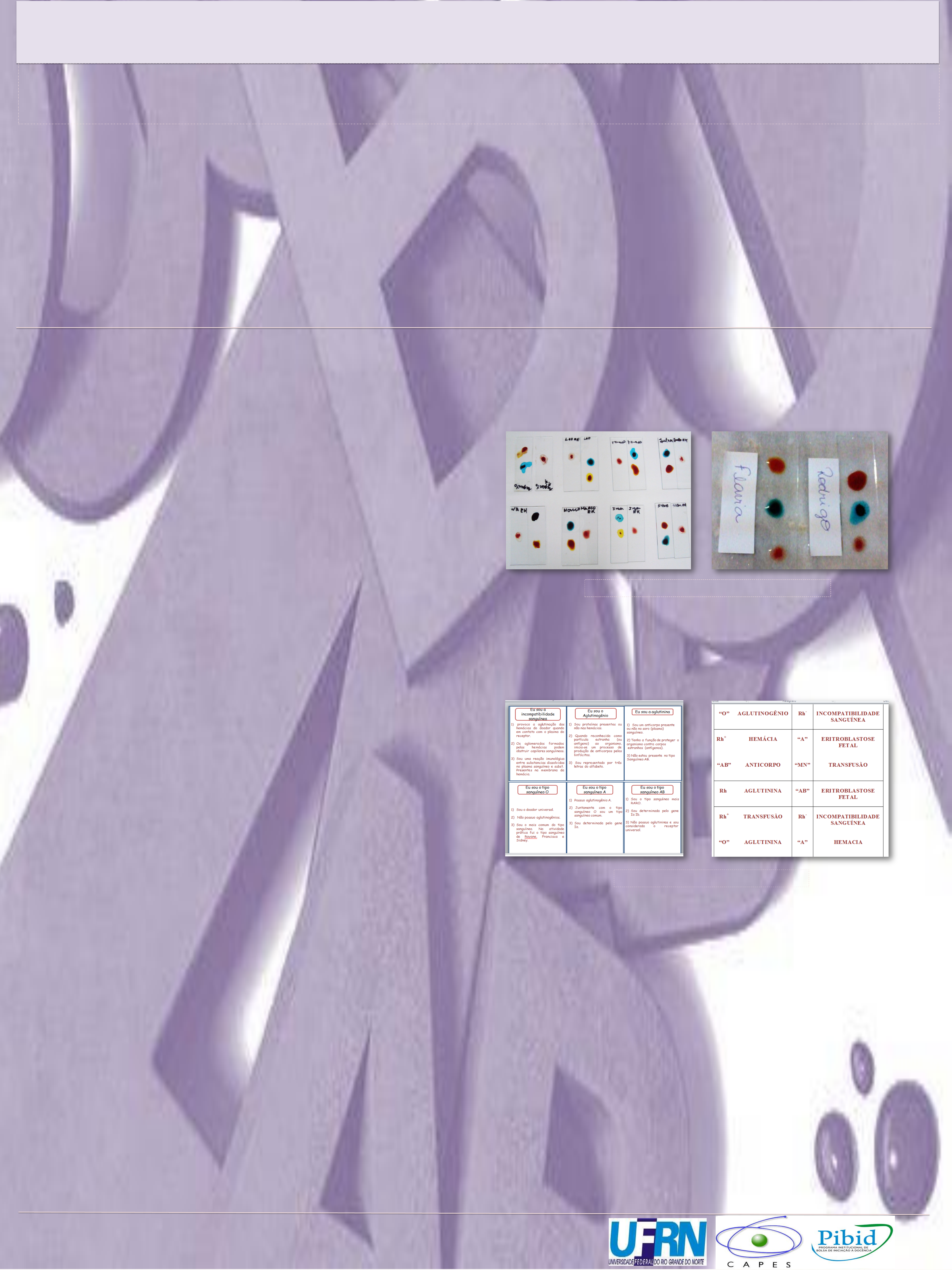 A PRÁTICA EXPERIMENTAL DO SISTEMA ABO COMO INSTRUMENTO MEDIADOR ENTRE O COTIDIANO E A SALA DE AULA PINHEIRO, S.A.1; ALVES, I. S.2 1.Graduandos em Ciências Biológicas, Universidade Federal do Rio Grande do Norte (UFRN); 2. Coordenadora do PIBID/ Biologia, Dra. Professora Adjunta I, UFRN/Centro de Biociências, Depto. Microbiologia e Parasitologia, Lab. de Microbiologia Aquática (LAMAq). ( Sheyla_pinheiro@hotmail.com ) RESUMO Descoberto pelo imunologista Karl Landsteiner em 1900, o sistema sanguíneo ABO é considerado hoje, o mais importante sistema de grupos sanguíneos na medicina transfusional e é considerado um conteúdo de difícil aprendizagem pelos alunos apesar da importância deste conhecimento para a vida cotidiana. Partindo desta considerável importância foi realizada uma intervenção com os alunos do 3º ano do ensino médio de uma escola pública, conveniada ao PIBID/UFRN/Biologia, com objetivo de promover aprendizagem significativa do conteúdo de herança do grupo sanguíneo bem como sua importância cotidiana. A ação foi mediada por uma sequencia didática, organizada com texto de divulgação científica, atividade experimental e dinâmica de grupo para motivar e facilitar a aprendizagem. Sendo diagnosticado por meio de questionários avaliativos que 86% dos alunos não sabiam seu tipo sanguíneo, ou ao menos relacionar e entender como ocorre á incompatibilidade sanguínea e a importância do grupo sanguíneo ABO. Demonstrando desta forma a importância de atividades que envolvam o cotidiano do aluno com os conteúdos abordados em sala. Palavras chaves: sistema sanguíneo ABO; sequência didática; atividade experimental. INTRODUÇÃO Na tentativa de melhorar o ensino, tem se proposto uma nova alternativa de inovação dos currículos escolares com a introdução de atividades práticas experimentais para tornar o ensino de Biologia mais dinâmico e atrativo, proporcionando ideias mais concretas sobre o conteúdo que muitas vezes são abstratos e de difícil aprendizagem. A inclusão de modalidades didáticas diversificadas, empregadas como instrumento de ensino, bem como a utilização de atividades lúdicas e experimentais permite ao docente compreender as varias situações específicas em torno do processo de ensino-aprendizagem, encontrando soluções que se adéquam a cada caso, contemplando diferenças individuais e atraindo o interesse do aluno (Krasilchik, 2004 ). Partindo desta considerável importância foi realizada uma intervenção com os alunos do 3º ano do ensino médio de uma escola pública, conveniada ao Programa Institucional de Bolsas de Iniciação a Docência - PIBID/UFRN/Biologia, com objetivo de promover aprendizagem significativa do conteúdo de herança do grupo sanguíneo ABO. Assim, os alunos serão permitidos a um exercício de interpretação e fixação de conteúdos, descobrindo o valor do conhecimento gênico para agir adequadamente a situações cotidianas votadas a este conteúdo. MATERIAL E METODOS Este trabalho foi desenvolvido na Escola Estadual Lourdes Guilherme localizado no bairro do Conjunto Jíqui – Neópolis, Zona Sul do Natal/RN. Esta interversão foi realizada pelo PIBID/BIOLOGIA/UFRN e contempla alunos do 3º ano do Ensino Médio, aborda os temas de herança do grupo sanguíneo, em sala de aula, com metodologia diversificada. Para tanto, foi elaborada uma sequência didática composta de dois encontros, com duas aulas de 50min cada, nas quais foram trabalhadas: (i) revisão do conteúdo através da leitura de texto científico; (ii) aplicações de questionários pré e pós-testes sobre a temática em estudo; (iii) atividade pratica laboratorial reveladora da tipagem sanguínea; (iv) e atividade dinâmica com a confecção de um jogo didático tendo como tema central sistema ABO e fator Rh, promovendo, assim, uma abordagem diferente do assunto aos alunos e consolidando conceitos. mentos, analisar o material biológico (sangue) e avaliar os resultados obtidos em grupo, promovendo então, uma maior interação aluno/aluno e aluno/professor (Krasilchik, 2004). CONCLUSÃO Com a utilização da sequência didática associada a metodologias que facilitam o aprendizado foi possível notar que os alunos foram estimulados a participarem de cada atividade sendo impulsionados a uma aprendizagem significativa dos conceitos e fixação dos conteúdos. Portanto o uso de questões discursivas possibilitou a identificação na deficiência de expressão advindas dos alunos, a prática da tipagem sanguínea possibilitou novas experiências aos alunos, além de gerar um produto final que é a revelação do tipo de sangue de cada um, e o jogo facilitou o aprendizado, potencializando a exploração e construção de conhecimentos, utilizando a competição como fator estimulante. REFERÊNCIAS Krasilchik, M (2004). Prática de Ensino de Biologia. 4ª ed., São Paulo: Editora da Universidade de São Paulo, 197p. Martinez, E.R.M; Fujihara, R.T; Martins, C. (2008). Show da Genética: um jogo interativo para o ensino de Genética. Genética na Escola, v. 3, n. 2, p. 24-27. DASILIO, Karine Lourenzone de Araújo; PAES, Marcela Ferreira. “Na trilha do sangue”: o jogo dos grupos sanguíneos. Genética na Escola, São Paulo, v. 1, n. 4, p.10-16, 2009. RESULTADOS E DISCUSSÕES No pré-teste “o que penso” é composto por 8 perguntas, sendo 2 objetivas e 6 discursivas. Foi possível observar que os alunos já traziam informações sobre o conteúdo de herança do grupo sanguíneo, porém estas eram conceitos errôneos e repletos de concepções alternativas na sua grande maioria. Os alunos não conheciam seu tipo sanguíneo e não o reconhecia como um importante assunto das relações cotidianas . Já no pós-teste “como é” revelou que 99% dos alunos obtiveram aprendizagem conceitual significativa, na qual conseguem relacionar o sistema ABO com o fator Rh e reconhecer a associação dos aglutinogênos na determinação do fenót