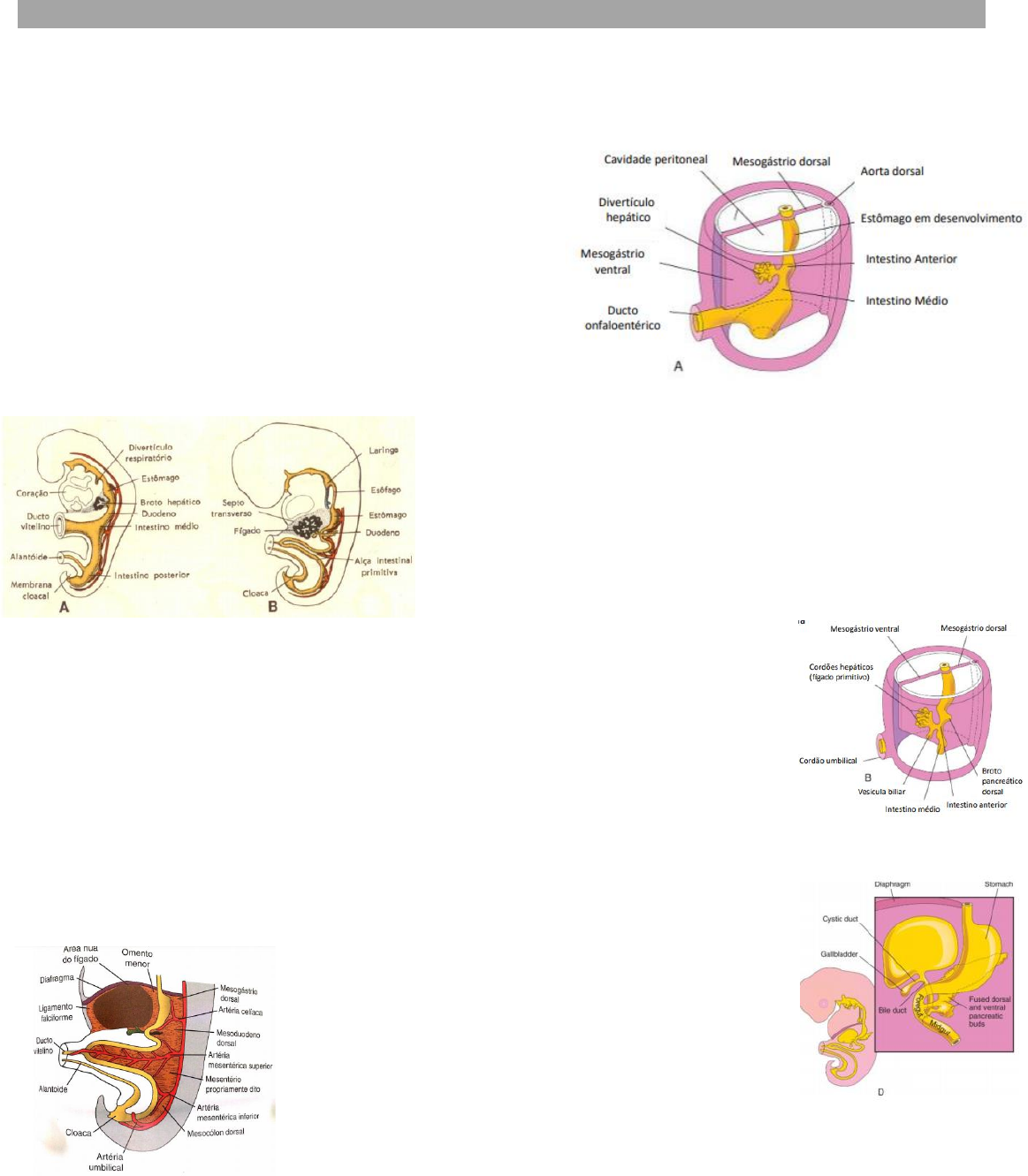 Embriologia do fígado LARA CAMILA DA SILVA ALVES – MEDICINA – 3º SEMESTRE O fígado surge da porção distal do intestino anterior na 4ª semana de vida embrionária, quando surge o divertículo hepático – também chamado de broto hepático. ➢ O intestino anterior é revertido internamente por endoderma; há uma hipótese de que essas células endodérmicas são bipotenciais, ou seja, podem se diferenciar em outro tipo celular a depender do estímulo. Ou seja, a depender do estímulo elas podem se transformar no divertículo hepático, ou nos brotos que irão dar origem aos pâncreas. O que faz com que essas células se diferenciem e formem o divertículo hepático é o FGF – Fator de crescimento de fibroblastos, que é produzido pelo coração em desenvolvimento. ➢ O divertículo hepático cresce dentro do mesogástrio ventral, sendo revestido por peritônio, em direção a uma estrutura chamada de septo transverso. O septo transverso é uma porção do mesoderma esplâncnico que fica superiormente ao mesogástrio ventral. Após o nascimento, o septo transverso é o tendão fibroso do diafragma, pois o septo transverso separa a cavidade torácica da cavidade abdominal. OBS: como a parte superior do fígado encosta no septo transverso, essa parte não será revestida por peritônio. Por isso, essa região é chamada de área/zona nua. ➢ Na 5ª semana, o divertículo irá se transformar em duas porções: porção cranial e porção caudal. A porção cranial é a maior e é a que dará origem ao fígado, a porção caudal dará origem à vesícula biliar. Os cordões hepáticos representam sequências de células hepáticas (hepatócitos) que começaram a se desenvolver. Essas células se originam das células endodérmicas – que também dão origem ao revestimento dos ductos biliares intra-hepáticos. À medida que esses cordões hepáticos vão crescendo em direção ao septo transverso, eles irão se encontrar com o capilares sinusóides hepáticos. OBS: a veia umbilical carrega sangue oxigenado em direção ao fígado; quando entra no fígado irá emitir capilares sinusóides, os quais se encontrarão com os cordões hepáticos. >> A vascularização da veia umbilical é importante para o crescimento/desenvolvimento do fígado e para a segmentação hepática. ➢ Por volta da 6ª semana, o fígado se torna um órgão hematopoiético. Por isso, ele se torna bem avermelhado. Inicialmente, o fígado tem um tamanho único, mas com o desenvolvimento o lobo direito fica maior que o lobo esquerdo. O mesogástrio ventral vai formar o omento menor (ligamento hepatoduodenal e hepatogastrico) e o ligamento falciforme. Por fim, o fígado irá acompanhar a rotação do estômago. Por volta da 12ª semana o fígado começa a originar a vesícula biliar. Histologia do fígado LARA CAMILA DA SILVA ALVES – MEDICINA – 3º SEMESTRE • O fígado está localizado na cavidade abdominal, e sua maior parte fica no hipocôndrio direito; • Corresponde ao segundo maior órgão do nosso corpo; é a maior glândula do nosso organismo; é uma glândula mista. • A maior parte dos alimentos que são absorvidos no TGI passa pelo fígado antes de cair na circulação, o que faz com que ele tenha a função de direcionar para onde esses nutrientes devem ir/armazenar. OBS: lipídios mais complexos, como os quilomícrons, chegam no fígado através da artéria hepática. O fígado recebe uma dupla circulação: ele recebe uma circulação arterial e uma venosa. O sangue venoso chega pela veia porta, e o sangue arterial chega pela artéria hepática. ➢ Cerca de 80% do sangue que o fígado recebe vem da veia porta, apenas o restante vem da artéria hepática. O sangue da veia porta está rico em nutrientes, pois está vindo do intestino que acabou de fazer absorção; enquanto o sangue da artéria hepática não é tão rico assim em nutrientes, mas possui quilomícrons e tem uma saturação de oxigênio elevada. Assim, o fígado garante nutrientes e oxigênio. • O fígado é recoberto por uma cápsula de tecido conjuntivo; é uma cápsula delicada, mas se torna mais espessa na região do hilo hepático. Essa cápsula do fígado também é denominada de cápsula de Glisson. OBS: a cápsula do fígado não é a mesma coisa que o peritônio. A cápsula recobre todo o fígado, pois dá sustentação às células hepáticas. Por cima dessa cápsula é onde encontramos o peritônio, exceto na área nua. A cápsula acompanha as estruturas do hilo hepático até uma região chamada de espaço porta. A partir desse espaço, temos apenas fibras elásticas e reticulares para dar sustentação aos hepatócitos. Ou seja, a parte interna do fígado é desprovida de tecido conjuntivo ➢ A presença das fibras reticulares é para que os capilares sejam de baixa resistência ao fluxo sanguíneo, ou seja, tenham uma facilidade de distensão. LÓBULO HEPÁTICO Anatomicamente, o fígado é dividido em lobos: lobo direito, lobo esquerdo, lobo quadrado e lobo caudado. Dentro dos lobos, encontramos vários lóbulos – unidade funcional importante do fígado. O lóbulo hepático é uma estrutura hexagonal que podemos encontrar de 3 a 6 espaços portas. ➢ O espaço porta (também conhecido como tríade portal) é composto por: um ramo da artéria hepática, um ramo da veia porta e um ducto biliar. Nos humanos, como não há tecido conjuntivo nos lóbulos – apenas as fibras -, não conseguimos definir o limite de um lóbulo para o outro. A referência é a veia centro lobular que fica no centro de um lóbulo. Os lóbulos também são formados por hepatócitos – células hepáticas – que estão dispostas radialmente. Entre a sequência dessas células, encontramos os capilares sinusóides que se direcionam para o centro desse lóbulo, formando a veia centro lobular. Entre os hepatócitos e os capilares sinusóides há um espaço chamado de espaço de Dissi, onde encontramos as fibras reticulares que dão 
