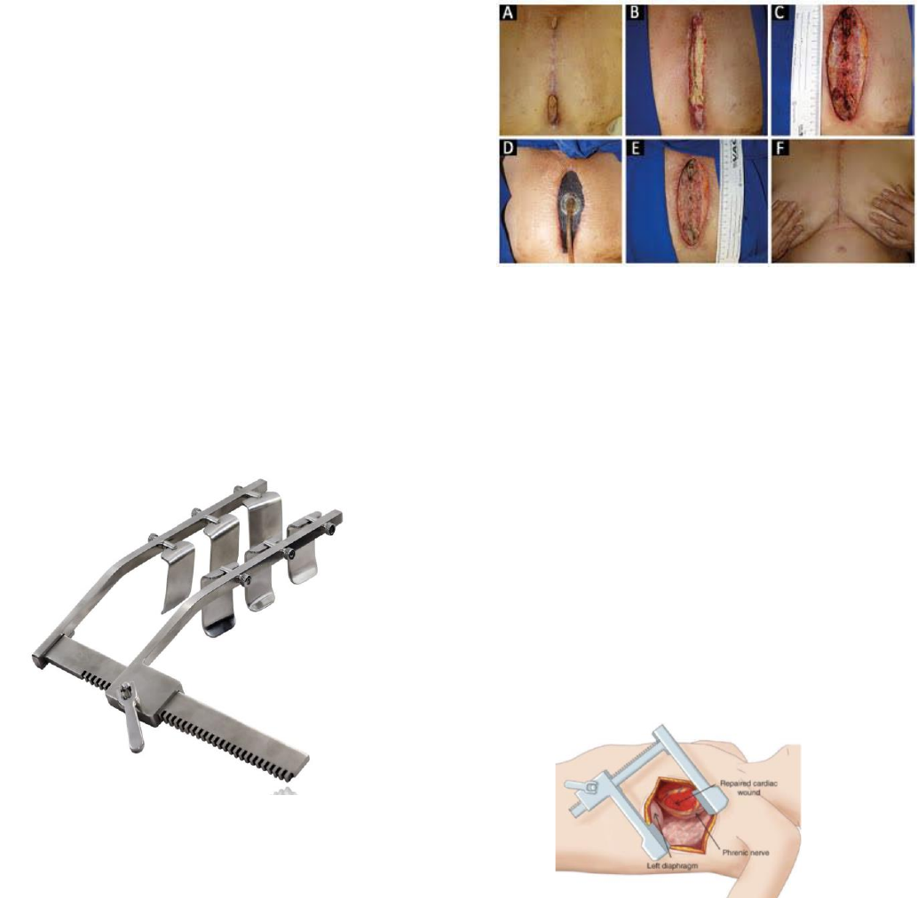 Abertura do tórax, existem diversos tipos: Podem ser chamadas de acesso torácico: esternostomias (cerrando), toracotomia anterolaterais, toracotomia lateroposterior, bitoracotomia, e incisão de Marfan. • Esternotomia: para acessar o coração e o timo. Para cirurgia cardíaca. Obs: Acesso venoso era realizado pela subclávia, não se usava a jugular atualmente é mais utilizada pela jugular porque podemos usar por ultrassom. A incisão vai da fúrcula até o processo xifoide, o externo vai ser serrado. Tórax aberto para abordagem de coração, aorta, timo, AD, VD, AE, VE e as coronárias (coronária direita está mais dentro de gordura temos que disseca-la para alcançar), a circunflexa é a mais difícil de acessar de todas, a descendente anterior é mais superficial. Também vamos fazer essa incisão para tumores de timo. O afastador usado tem 3 garras de cada lado (a vantagem é que tem maior força de abertura) a a força exercida distribuida em 3 partes, tem menor risco de lesar o esterno e as costelas. Esse afastador é chamado de afastador de Ankeney, em algumas situações também podemos usar o Finochietto. Afastador de Ankeney. O fechamento do externo vai ser com fios de aço. Podemos colocar um dreno, que é um tubo com furinhos laterais, porque a cirurgia pode sangrar um pouco ou vazar, e por isso se usa o dreno. O frasco de drenagem é um frasco comum que tem água no final, e o tubo que está no tórax vai ser comprado até ficar uma parte na água, e também tem saída de ar. Quando sangrar vai indicar onde está sangrando. O esterno vai ser fechado com fios de aço e vai ser realizado pontos em X que tem maior pressão (em pacientes mais magros e pacientes mais jovens pode fazer ponto simples), os pacientes mais obesos vamos ter que fazer o ponto em X. As vezes o ponto pode causar saliência e o paciente sente dor e com isso podemos retirar o fio. • Toracotomias laterais: o Anterolateral: começa no esterno, sulco deltopeitoral (passa a veia cefálica, que vai desembocar na subclávia, cava superior e átrio direito), preferível dissecar essa veia (boa veia para introduzir marca-passo com eletrodo com segurança, ela é uma veia grande). Escolhe o espaço intercostal adequado, se for para lobo inferior do pulmão, vai para o quinto espaço intercostal, e se for hilo vai se basear no quarto espaco intercostal. O primeiro, segundo, terceiro não se usa normalmente. Vamos abrir próximo da costela superior da parte da costela inferior, devido aos vasos e nervos. Pode-se fazer uma incisão pequena com ressecção periférica. o Lateroposterior: usada para lobectomia e para pneumonectomia. Vai dar acesso a aorta descendente. Aneurisma de aorta descendente trata com esse tipo de incisão. Toracotomias Fechamento igual as outras, coloca dreno, dar um ponto no bordo superior da costela e procuramos dar o ponto no bordo superior da costela inferior. Muitas vezes preferimos dar pontos mais grossos, pôde-se dar ponto em X ou pontos simples. Depois vamos para os músculos que formam secionados e vamos fechar com chuleio simples. Se for um pulmão muito aderido podemos colocar dois drenos. • Lobectomia superior direita: tórax foi aberto (3 lobos). Vai para o hilo do pulmão, e disseca os vasos que vão para o lobo superior, em geral só vamos fazer uma ligadura, mas pode-se fazer mais de uma ligadura. Temos que dissecar os lobos separadamente. Lembrar da veia cava superior e a veia ázigo (que vai drenar o abdome). Vamos fazer a incisão, abaixo do mamilo, vai se prolongar até a ponta da escápula, e vamos ter uma lobectomia latero- posterior. Vamos seccionar o latissimo do dorso. Vamos divulcionar o serrátil anterior. • Bitoracotomia : secciona o esterno, o lado direito e o esquerdo. Retirada de tumores são realizados com bitoracotomia. Tumor embrionário, que vai formar estruturas como dente, cabelo, ossos. Imagem ruim, não achei de bitoracotomia. • Incisão de Marfan: descreveu a incisão 5 a 6 cm para cima do processo xifoide e 5 a 6 cm abaixo do processo xifoide. Com essa incisão conseguimos chegar no pericárdio, e vai com gaze soltando a parte diafragmatica. Incisão bem menor, descolamento subxifoide, pode drenar o pericárdio.